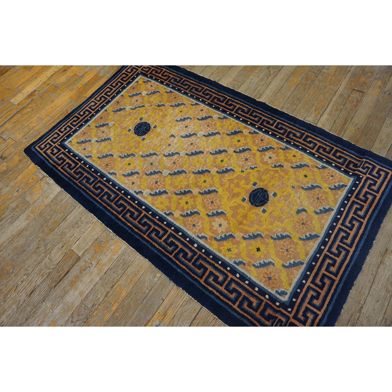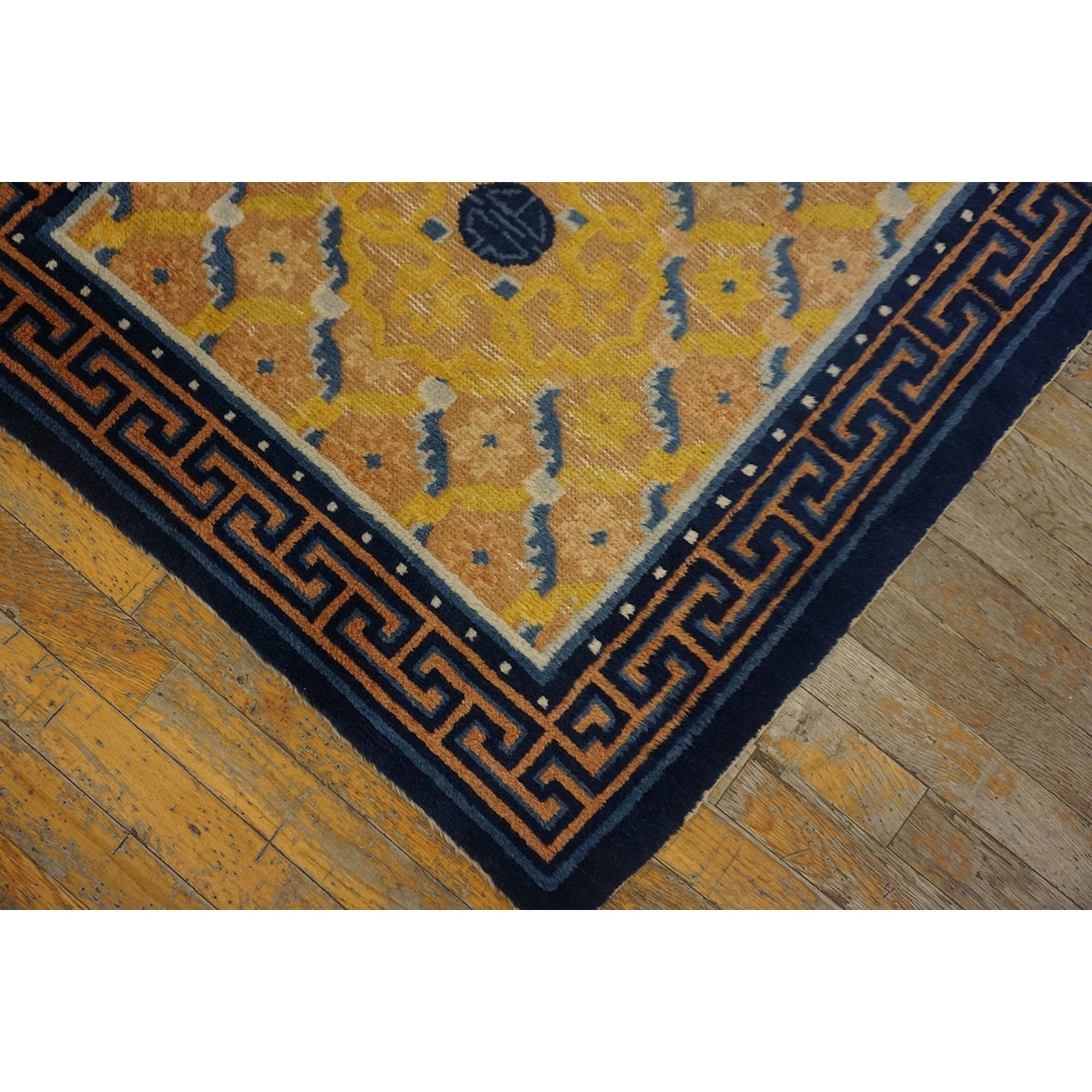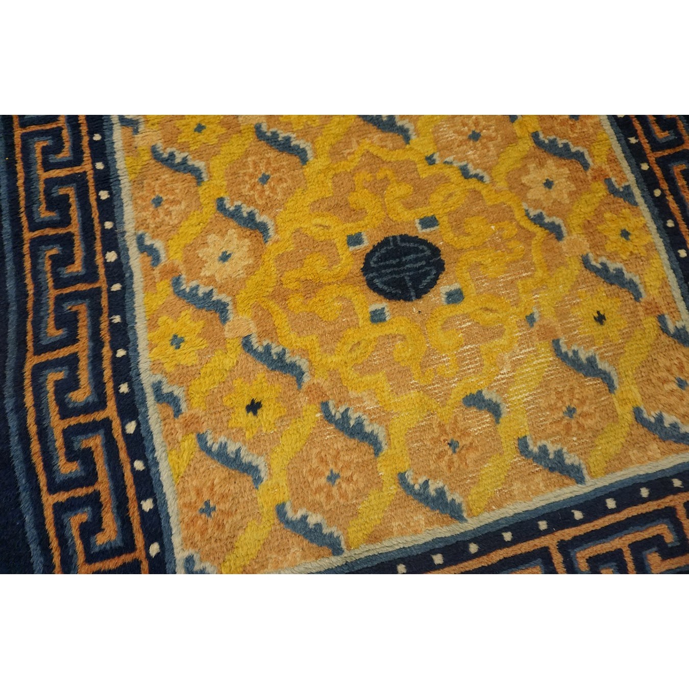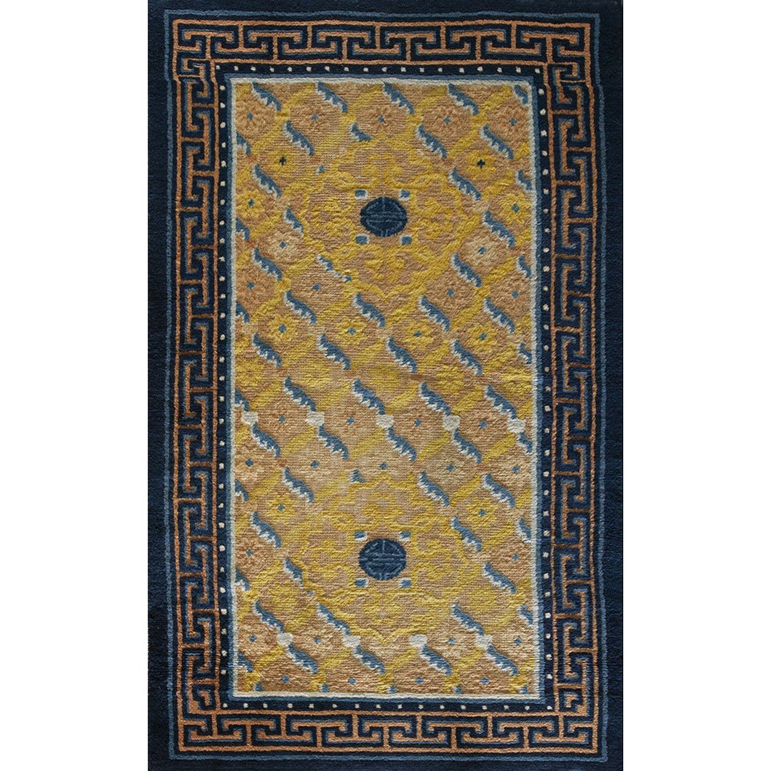 DescriptionChineseCarpets made in China proper. See entries Ningshia, Peking, Art Deco. Chinese - NingxiaThe western Chinese province of Ningshia has a mostly Muslim population and is the source of many of the oldest Chinese carpets of the modern (Ming Dynasty and later) era. The designs are typically Chinese: fretwork or Greek key boarders, pacony palmettes, bats, butterflies, Fu dogs, clouds, dragons, shou symbols, etc. Pollar carpets designed to wrap around monastery columns and displaying a dragon above waves are a specialty. The weave is coarse and soft, with several wefts between knot rows and a longish pile. Yellow golds, dark and light blues are common colors. The outer most plain border on pre 1800 examples is a corrosive brown. Formats include: large square throne carpets, paralleled meditation runners, chair seats and scalloped backs. | |