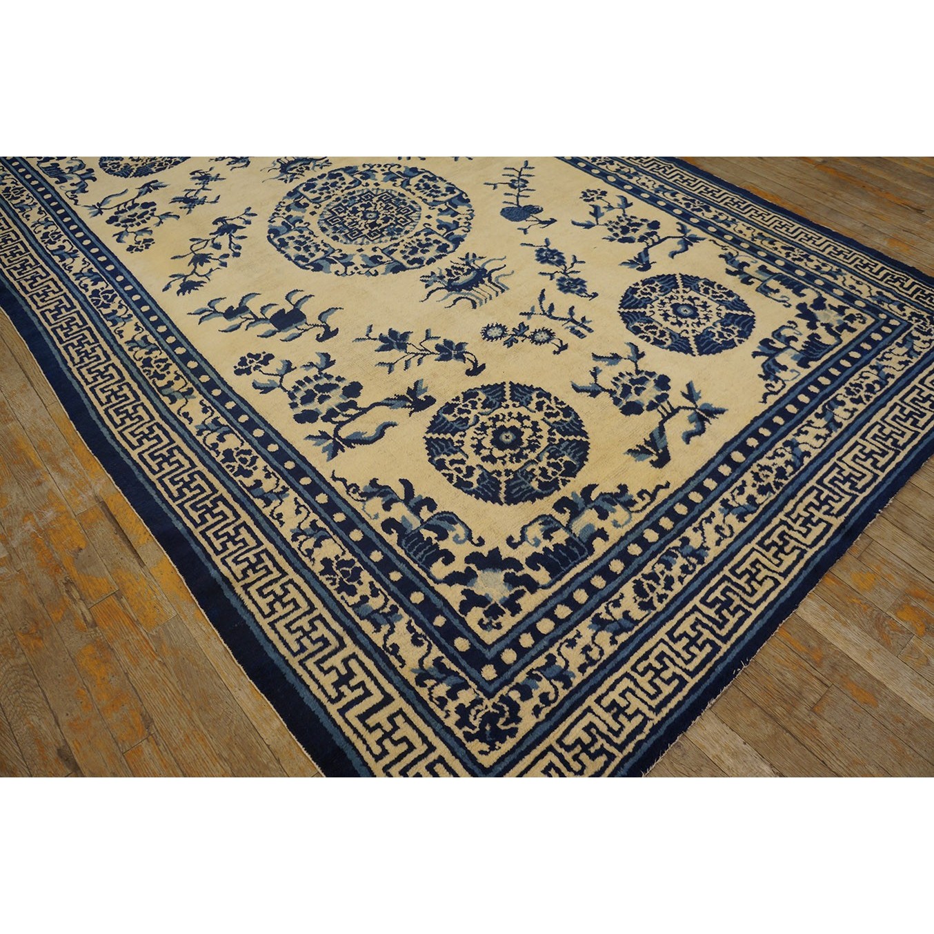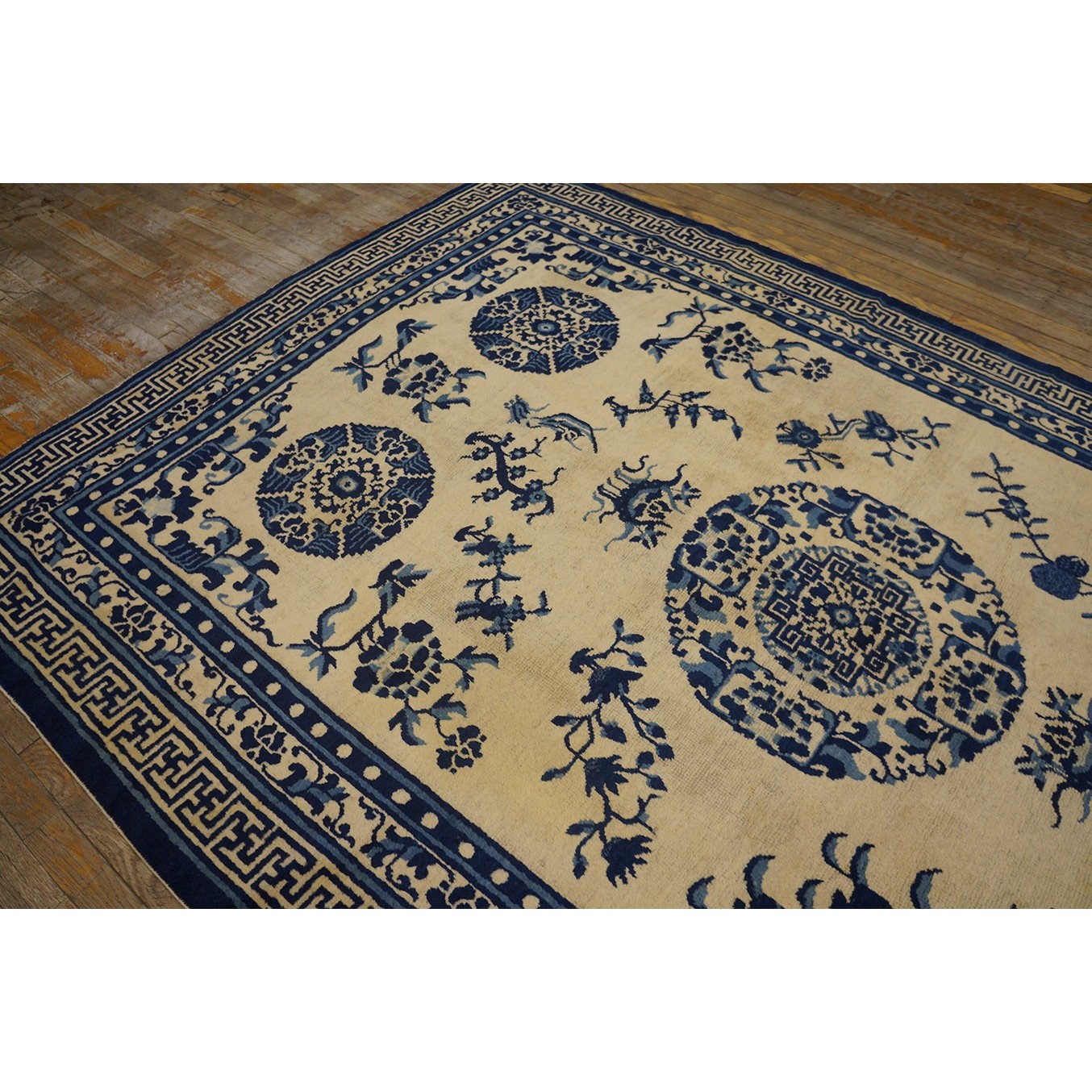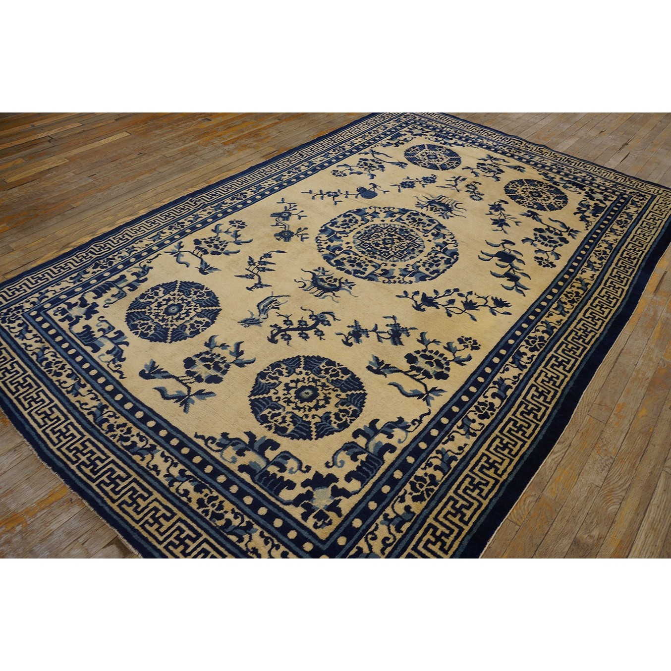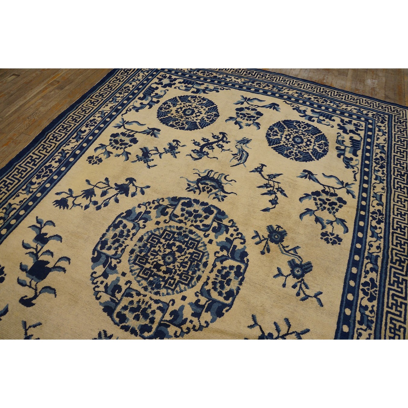 DescriptionChineseCarpets made in China proper. See entries Ningshia, Peking, Art Deco. Chinese - NingxiaThe western Chinese province of Ningshia has a mostly Muslim population and is the source of many of the oldest Chinese carpets of the modern (Ming Dynasty and later) era. The designs are typically Chinese: fretwork or Greek key boarders, pacony palmettes, bats, butterflies, Fu dogs, clouds, dragons, shou symbols, etc. Pollar carpets designed to wrap around monastery columns and displaying a dragon above waves are a specialty. The weave is coarse and soft, with several wefts between knot rows and a longish pile. Yellow golds, dark and light blues are common colors. The outer most plain border on pre 1800 examples is a corrosive brown. Formats include: large square throne carpets, paralleled meditation runners, chair seats and scalloped backs. | |