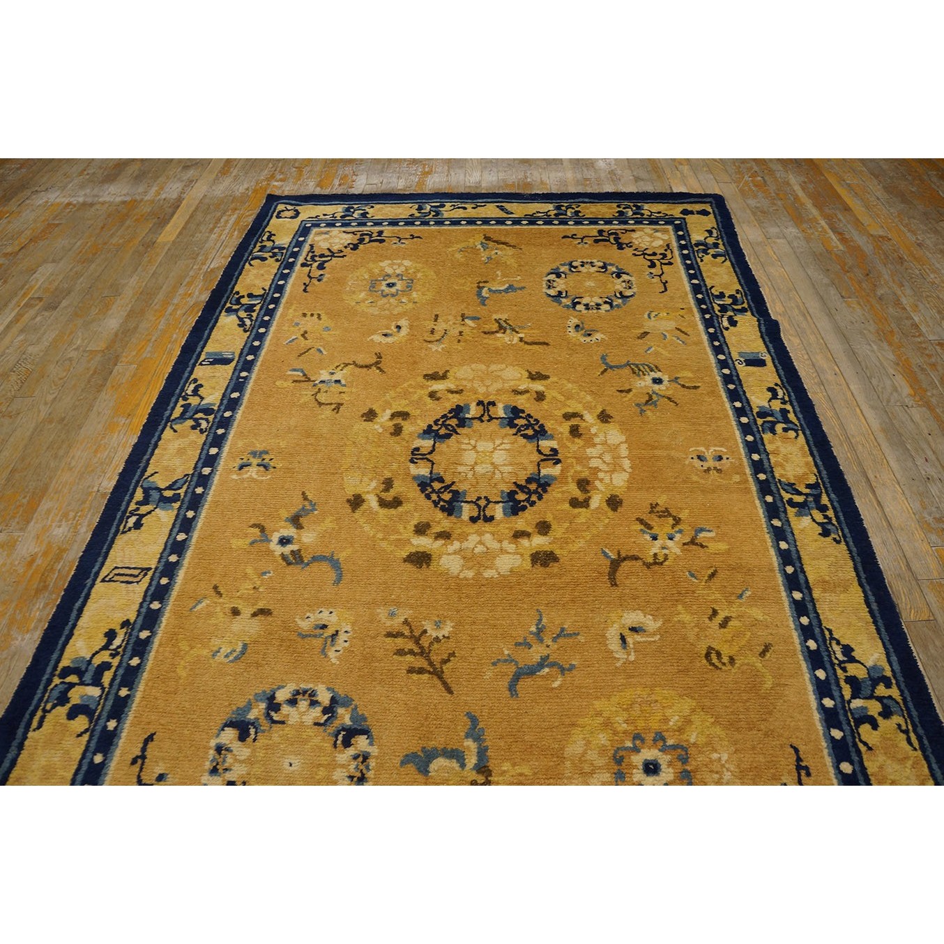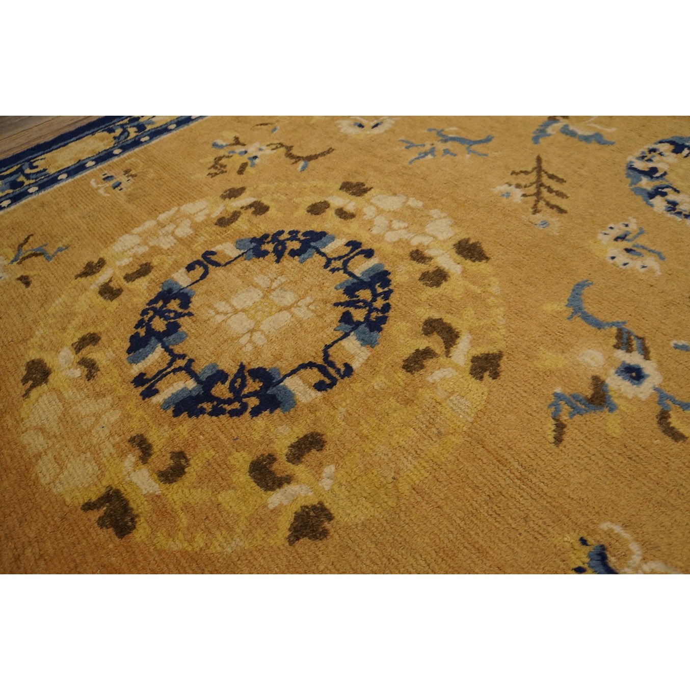 DescriptionChineseCarpets made in China proper. See entries Ningshia, Peking, Art Deco. Chinese - NingxiaThe western Chinese province of Ningshia has a mostly Muslim population and is the source of many of the oldest Chinese carpets of the modern (Ming Dynasty and later) era. The designs are typically Chinese: fretwork or Greek key boarders, pacony palmettes, bats, butterflies, Fu dogs, clouds, dragons, shou symbols, etc. Pollar carpets designed to wrap around monastery columns and displaying a dragon above waves are a specialty. The weave is coarse and soft, with several wefts between knot rows and a longish pile. Yellow golds, dark and light blues are common colors. The outer most plain border on pre 1800 examples is a corrosive brown. Formats include: large square throne carpets, paralleled meditation runners, chair seats and scalloped backs. | |