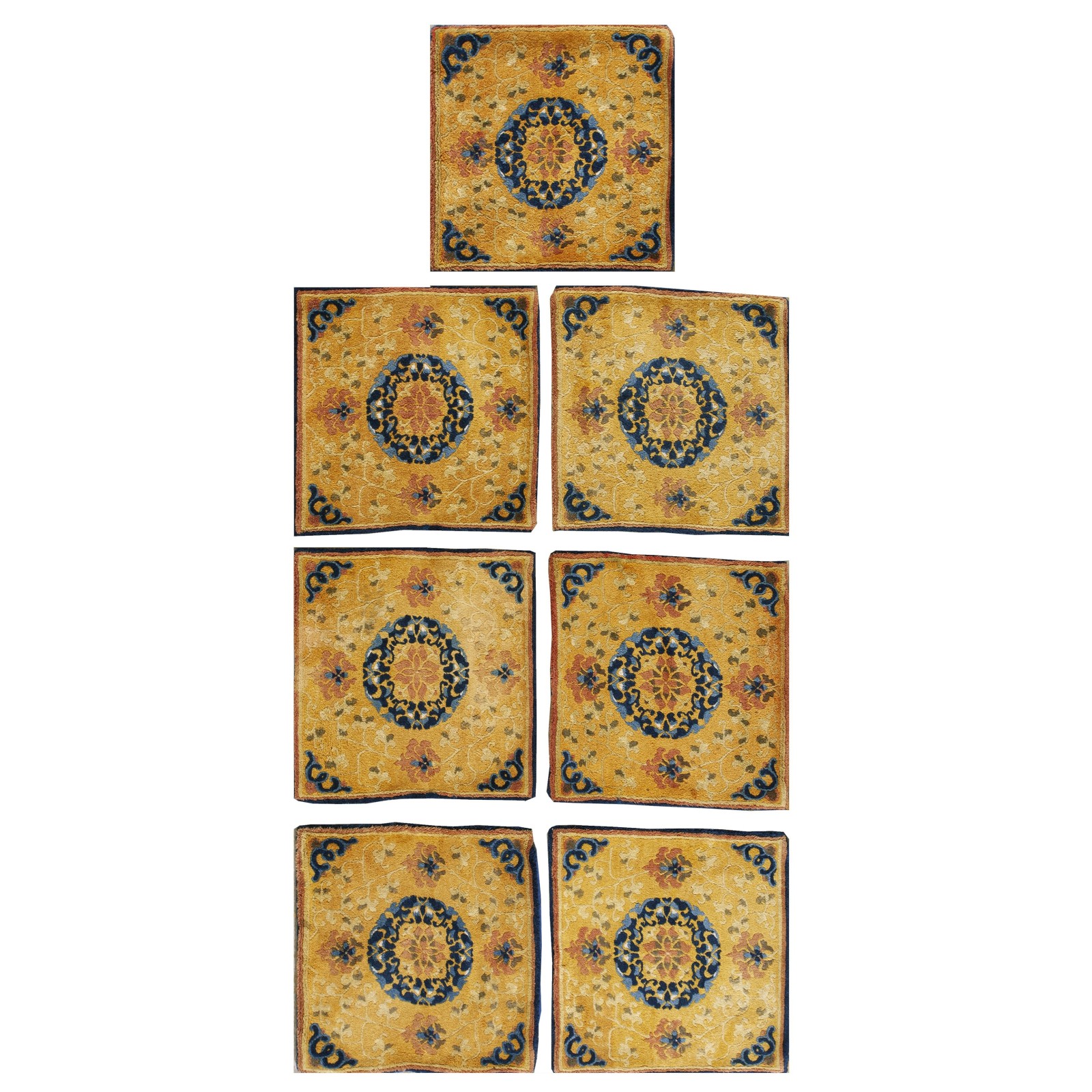 DescriptionChineseCarpets made in China proper. See entries Ningshia, Peking, Art Deco. Chinese - NingxiaThe western Chinese province of Ningshia has a mostly Muslim population and is the source of many of the oldest Chinese carpets of the modern (Ming Dynasty and later) era. The designs are typically Chinese: fretwork or Greek key boarders, pacony palmettes, bats, butterflies, Fu dogs, clouds, dragons, shou symbols, etc. Pollar carpets designed to wrap around monastery columns and displaying a dragon above waves are a specialty. The weave is coarse and soft, with several wefts between knot rows and a longish pile. Yellow golds, dark and light blues are common colors. The outer most plain border on pre 1800 examples is a corrosive brown. Formats include: large square throne carpets, paralleled meditation runners, chair seats and scalloped backs. | |