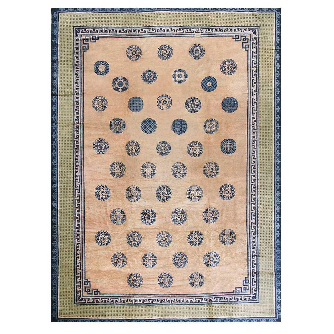 DescriptionChineseCarpets made in China proper. See entries Ningshia, Peking, Art Deco. Chinese - NingxiaThe western Chinese province of Ningshia has a mostly Muslim population and is the source of many of the oldest Chinese carpets of the modern (Ming Dynasty and later) era. The designs are typically Chinese: fretwork or Greek key boarders, pacony palmettes, bats, butterflies, Fu dogs, clouds, dragons, shou symbols, etc. Pollar carpets designed to wrap around monastery columns and displaying a dragon above waves are a specialty. The weave is coarse and soft, with several wefts between knot rows and a longish pile. Yellow golds, dark and light blues are common colors. The outer most plain border on pre 1800 examples is a corrosive brown. Formats include: large square throne carpets, paralleled meditation runners, chair seats and scalloped backs. | |