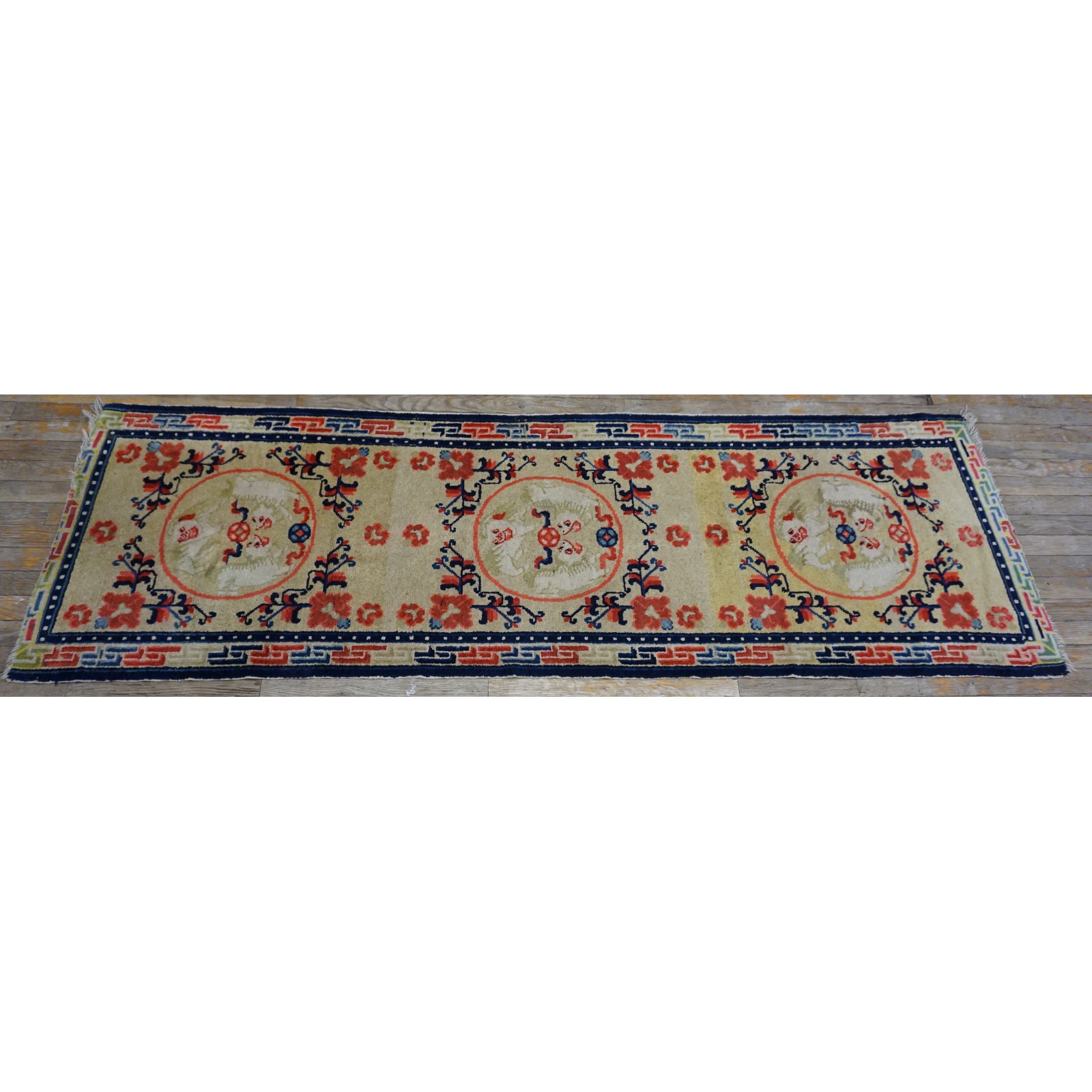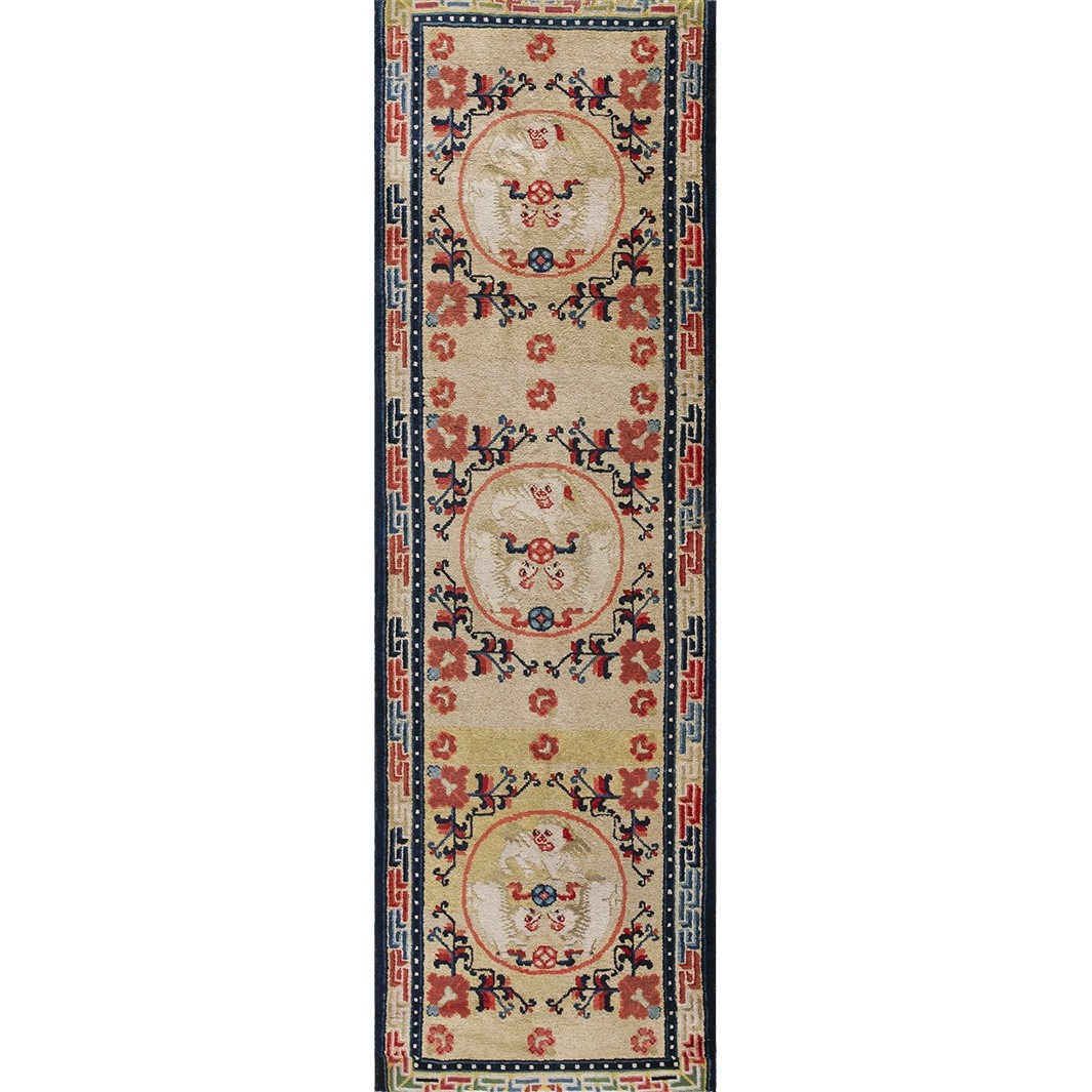 DescriptionChineseCarpets made in China proper. See entries Ningshia, Peking, Art Deco. Chinese - NingxiaThe western Chinese province of Ningshia has a mostly Muslim population and is the source of many of the oldest Chinese carpets of the modern (Ming Dynasty and later) era. The designs are typically Chinese: fretwork or Greek key boarders, pacony palmettes, bats, butterflies, Fu dogs, clouds, dragons, shou symbols, etc. Pollar carpets designed to wrap around monastery columns and displaying a dragon above waves are a specialty. The weave is coarse and soft, with several wefts between knot rows and a longish pile. Yellow golds, dark and light blues are common colors. The outer most plain border on pre 1800 examples is a corrosive brown. Formats include: large square throne carpets, paralleled meditation runners, chair seats and scalloped backs. | |