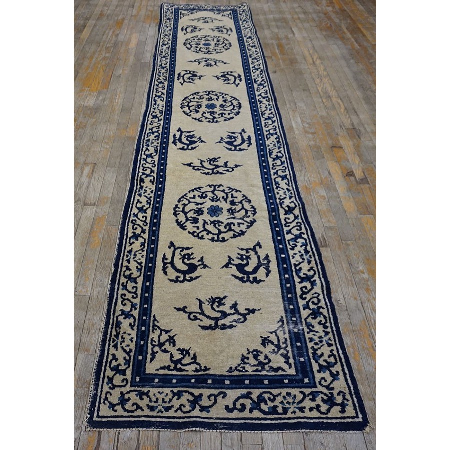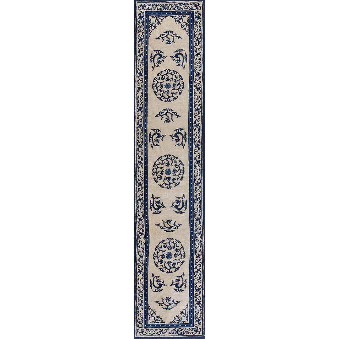 DescriptionChineseCarpets made in China proper. See entries Ningshia, Peking, Art Deco. Chinese - NingxiaThe western Chinese province of Ningshia has a mostly Muslim population and is the source of many of the oldest Chinese carpets of the modern (Ming Dynasty and later) era. The designs are typically Chinese: fretwork or Greek key boarders, pacony palmettes, bats, butterflies, Fu dogs, clouds, dragons, shou symbols, etc. Pollar carpets designed to wrap around monastery columns and displaying a dragon above waves are a specialty. The weave is coarse and soft, with several wefts between knot rows and a longish pile. Yellow golds, dark and light blues are common colors. The outer most plain border on pre 1800 examples is a corrosive brown. Formats include: large square throne carpets, paralleled meditation runners, chair seats and scalloped backs. | |