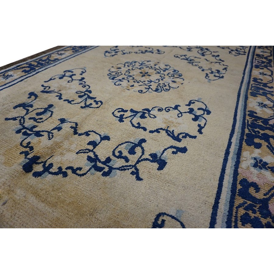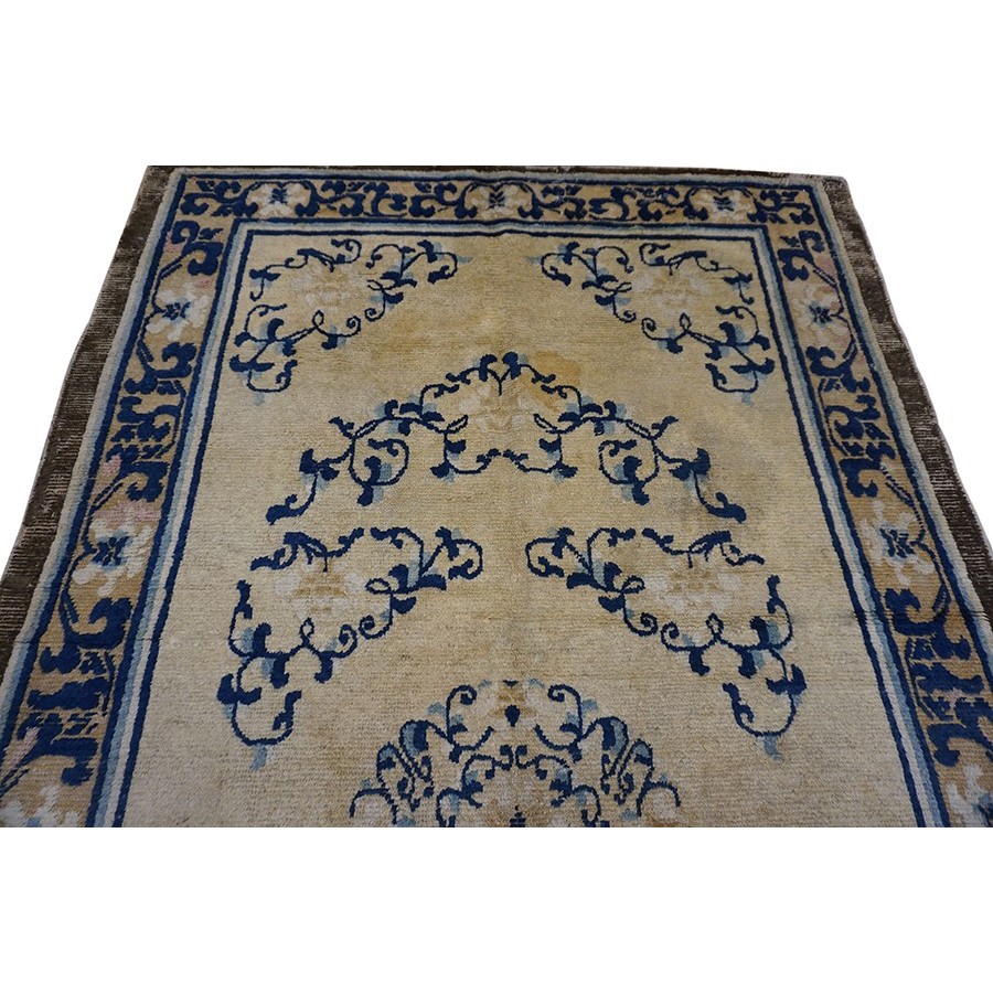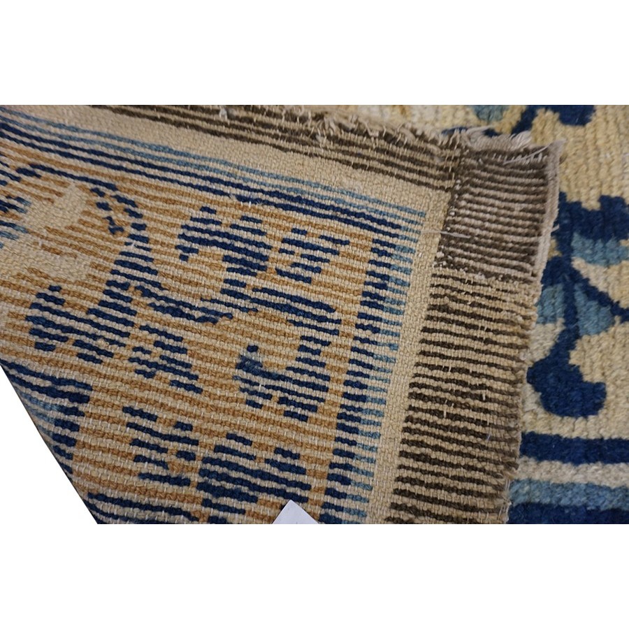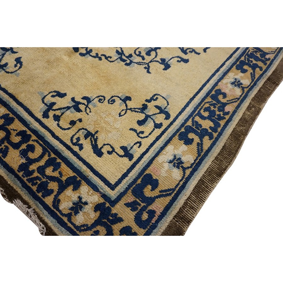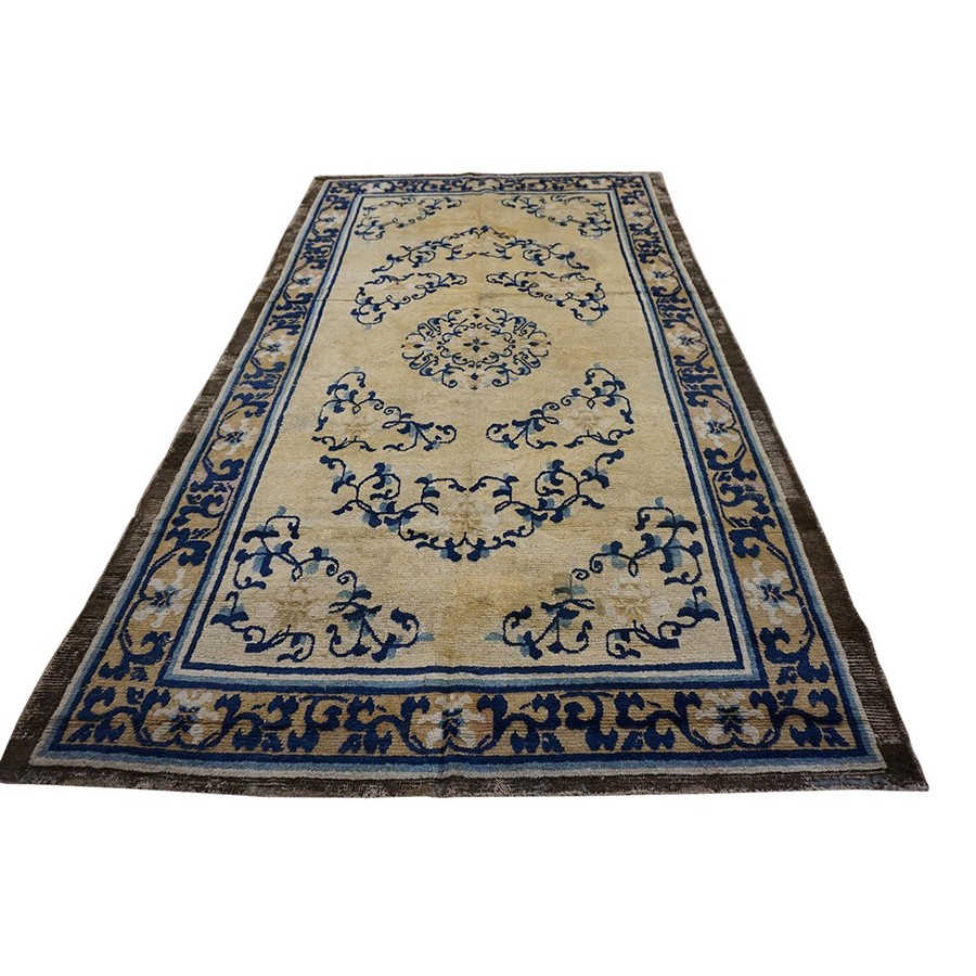 DescriptionChineseCarpets made in China proper. See entries Ningshia, Peking, Art Deco. Chinese - NingxiaThe western Chinese province of Ningshia has a mostly Muslim population and is the source of many of the oldest Chinese carpets of the modern (Ming Dynasty and later) era. The designs are typically Chinese: fretwork or Greek key boarders, pacony palmettes, bats, butterflies, Fu dogs, clouds, dragons, shou symbols, etc. Pollar carpets designed to wrap around monastery columns and displaying a dragon above waves are a specialty. The weave is coarse and soft, with several wefts between knot rows and a longish pile. Yellow golds, dark and light blues are common colors. The outer most plain border on pre 1800 examples is a corrosive brown. Formats include: large square throne carpets, paralleled meditation runners, chair seats and scalloped backs. | |