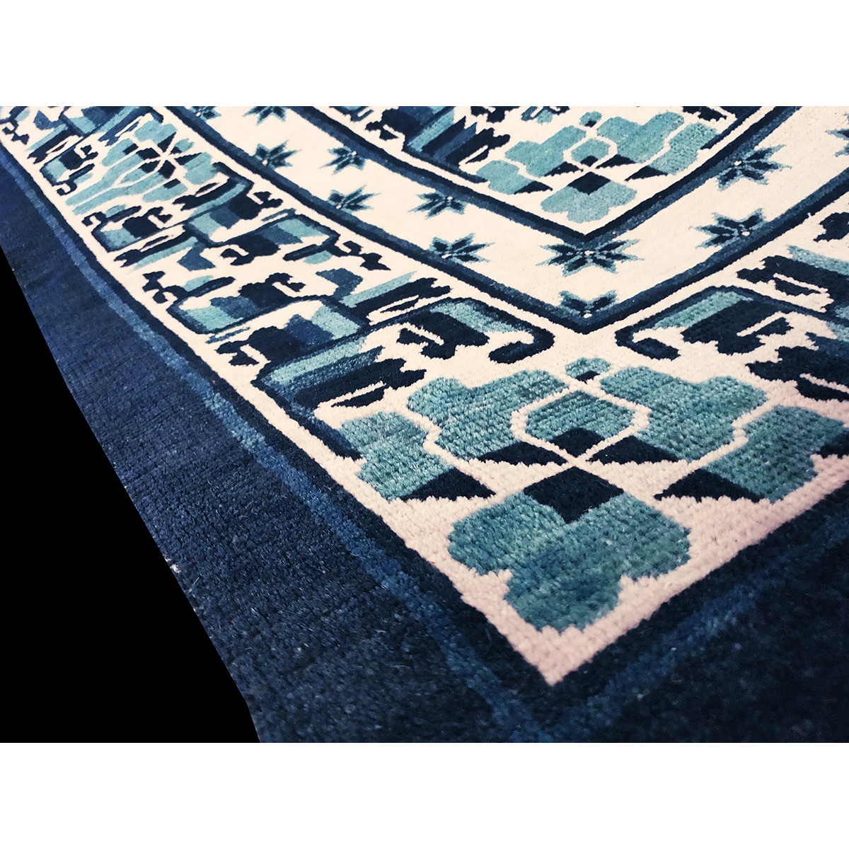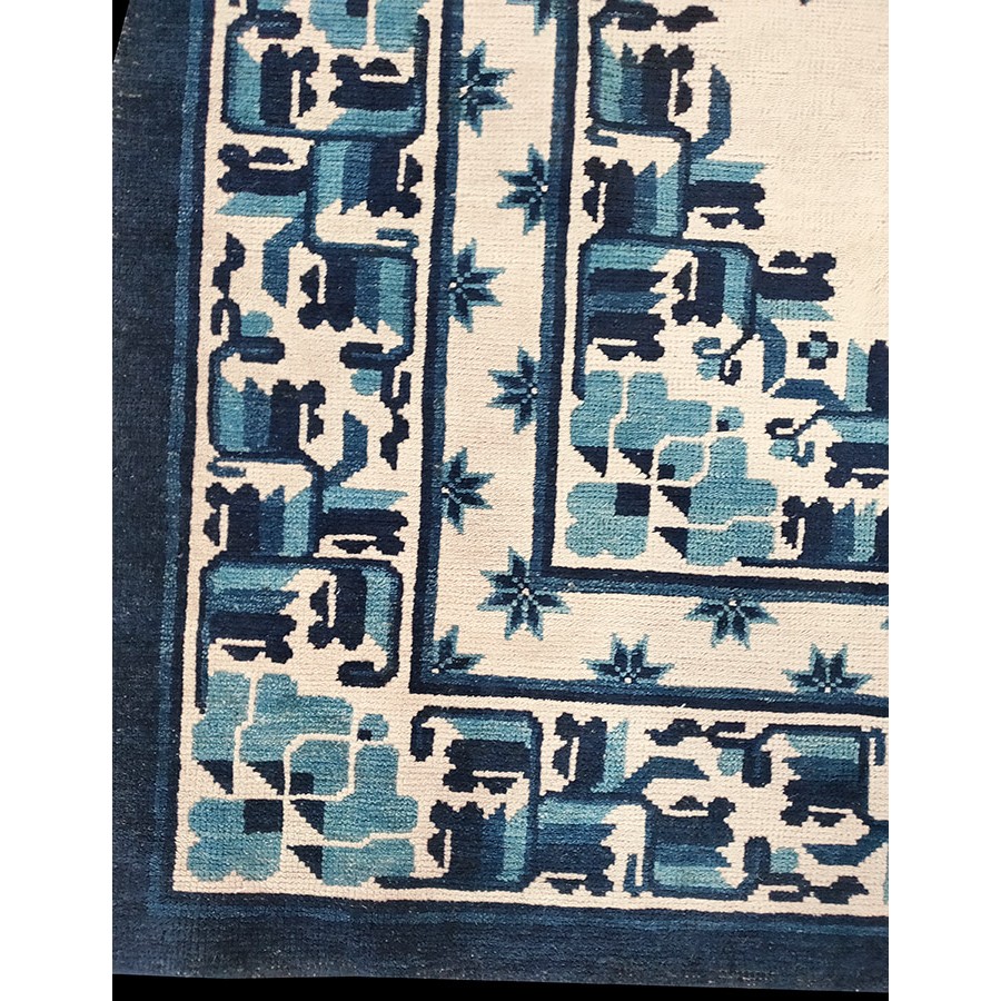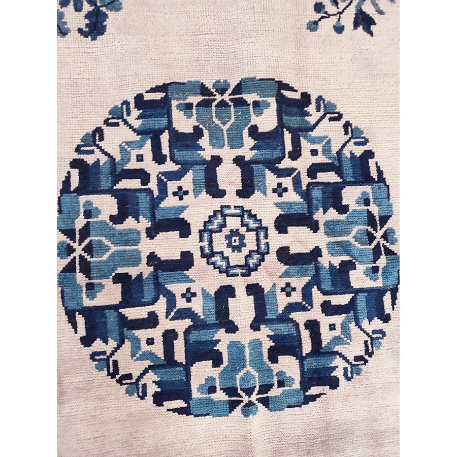 DescriptionChineseCarpets made in China proper. See entries Ningshia, Peking, Art Deco. Chinese - NingxiaThe western Chinese province of Ningshia has a mostly Muslim population and is the source of many of the oldest Chinese carpets of the modern (Ming Dynasty and later) era. The designs are typically Chinese: fretwork or Greek key boarders, pacony palmettes, bats, butterflies, Fu dogs, clouds, dragons, shou symbols, etc. Pollar carpets designed to wrap around monastery columns and displaying a dragon above waves are a specialty. The weave is coarse and soft, with several wefts between knot rows and a longish pile. Yellow golds, dark and light blues are common colors. The outer most plain border on pre 1800 examples is a corrosive brown. Formats include: large square throne carpets, paralleled meditation runners, chair seats and scalloped backs. | |