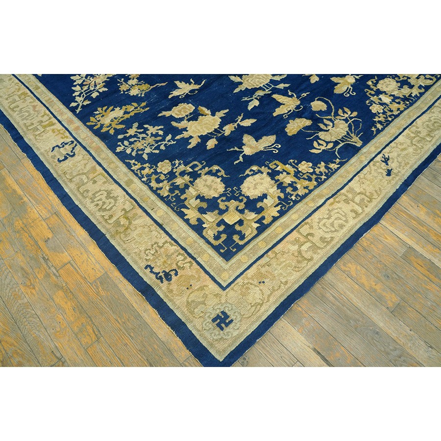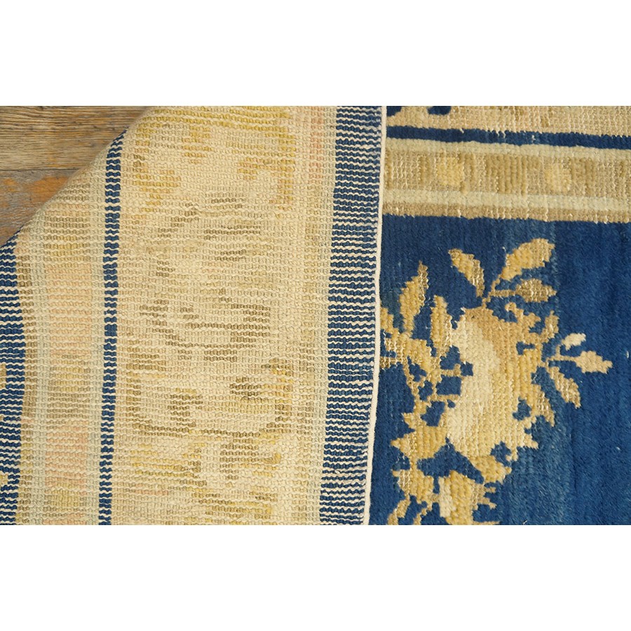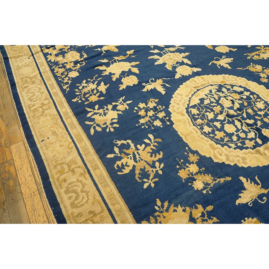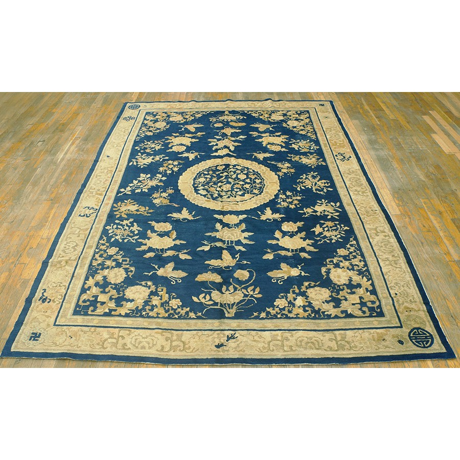 DescriptionChineseCarpets made in China proper. See entries Ningshia, Peking, Art Deco. Chinese - NingxiaThe western Chinese province of Ningshia has a mostly Muslim population and is the source of many of the oldest Chinese carpets of the modern (Ming Dynasty and later) era. The designs are typically Chinese: fretwork or Greek key boarders, pacony palmettes, bats, butterflies, Fu dogs, clouds, dragons, shou symbols, etc. Pollar carpets designed to wrap around monastery columns and displaying a dragon above waves are a specialty. The weave is coarse and soft, with several wefts between knot rows and a longish pile. Yellow golds, dark and light blues are common colors. The outer most plain border on pre 1800 examples is a corrosive brown. Formats include: large square throne carpets, paralleled meditation runners, chair seats and scalloped backs. | |