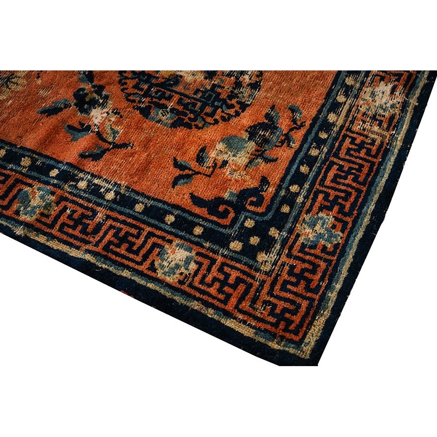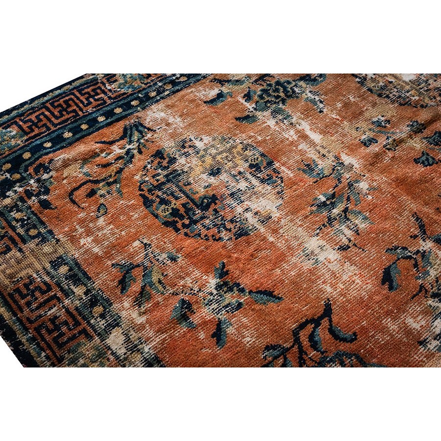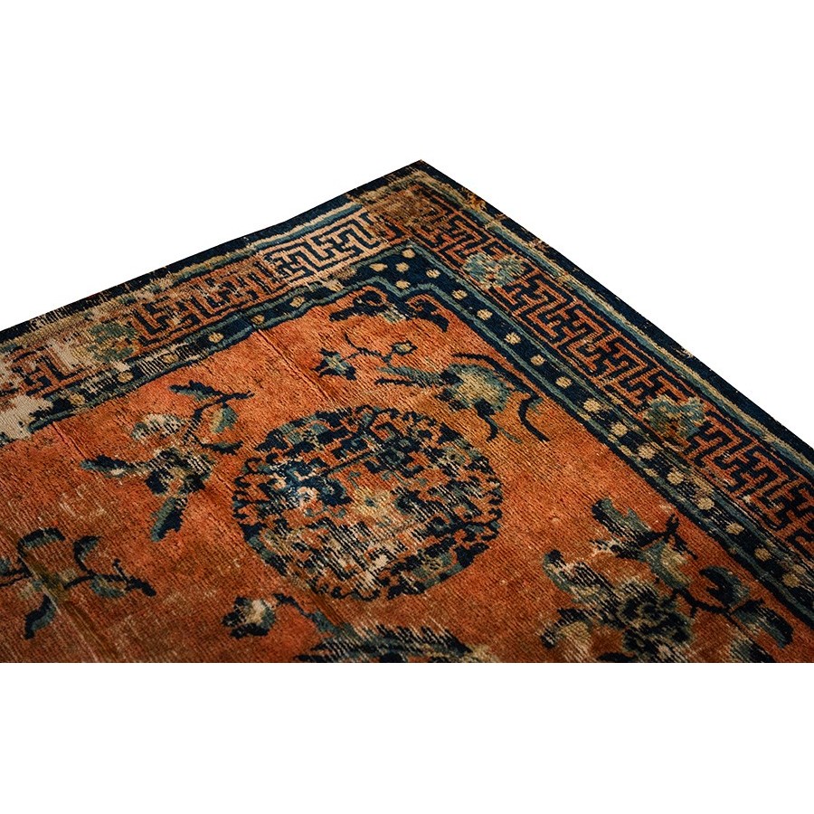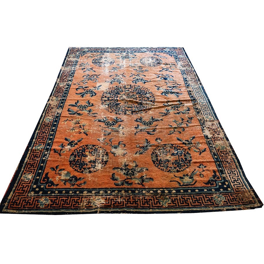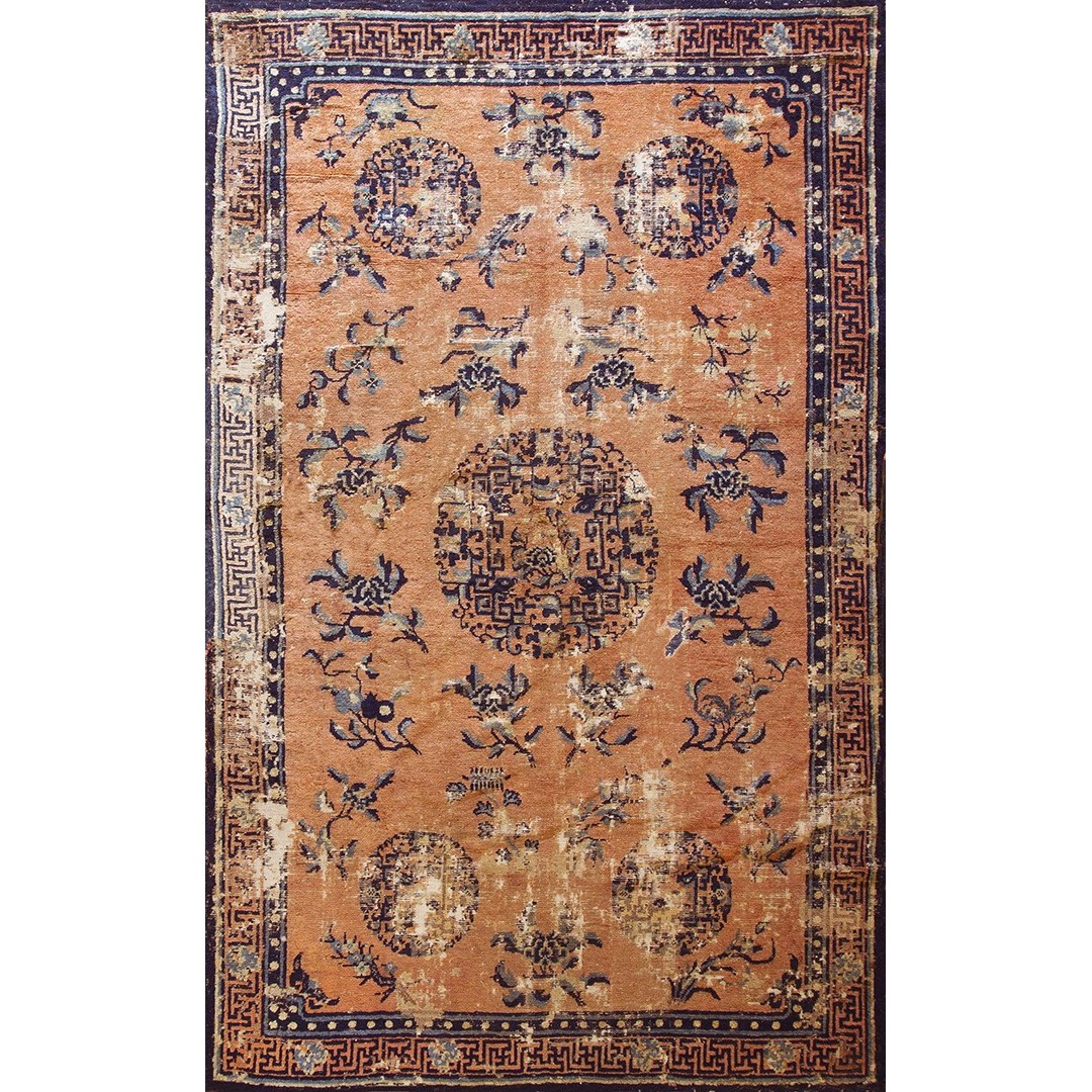 The western Chinese province of Ningshia has a mostly Muslim population and is the source of many of the oldest Chinese carpets of the modern (Ming Dynasty and later) era. The designs are typically Chinese: fretwork or Greek key boarders, pacony palmettes, bats, butterflies, Fu dogs, clouds, dragons, shou symbols, etc. Pollar carpets designed to wrap around monastery columns and displaying a dragon above waves are a specialty. The weave is coarse and soft, with several wefts between knot rows and a longish pile. Yellow golds, dark and light blues are common colors. The outer most plain border on pre 1800 examples is a corrosive brown. Formats include: large square “throne” carpets, paralleled meditation runners, chair seats and scalloped backs.