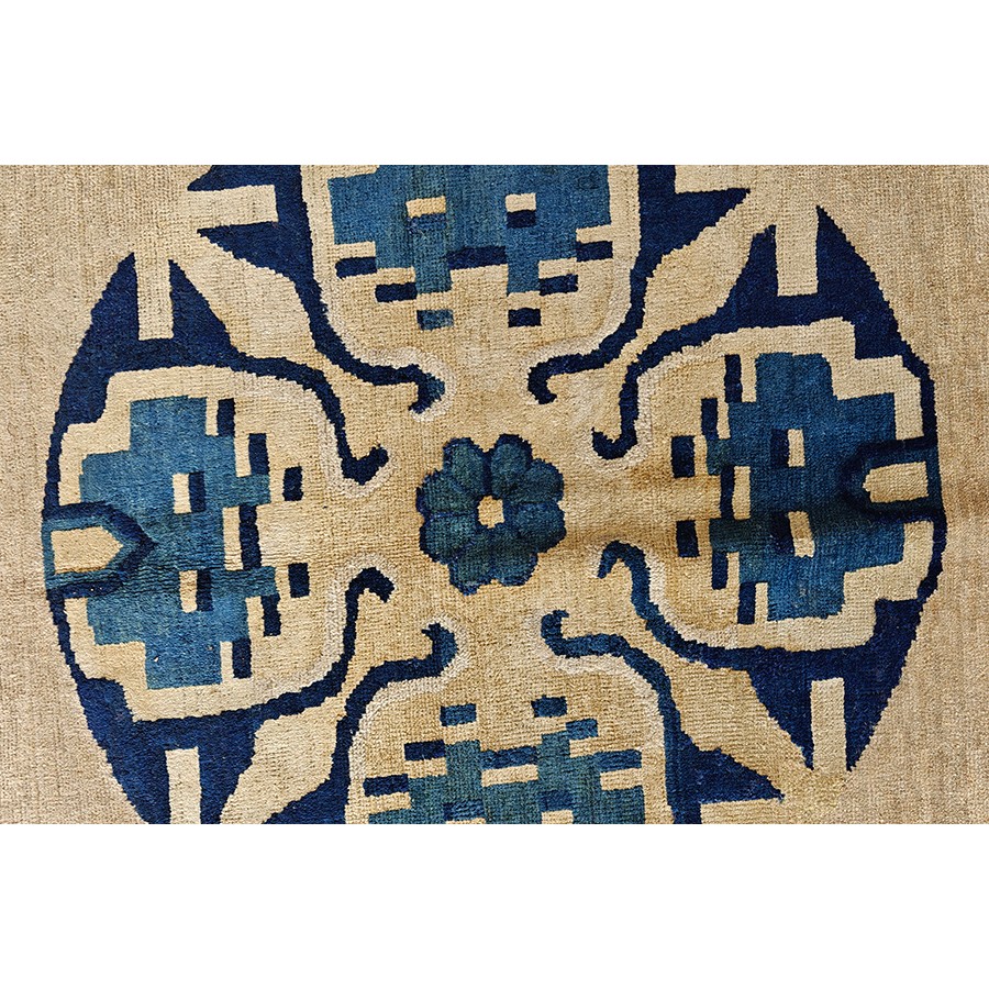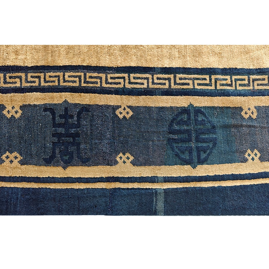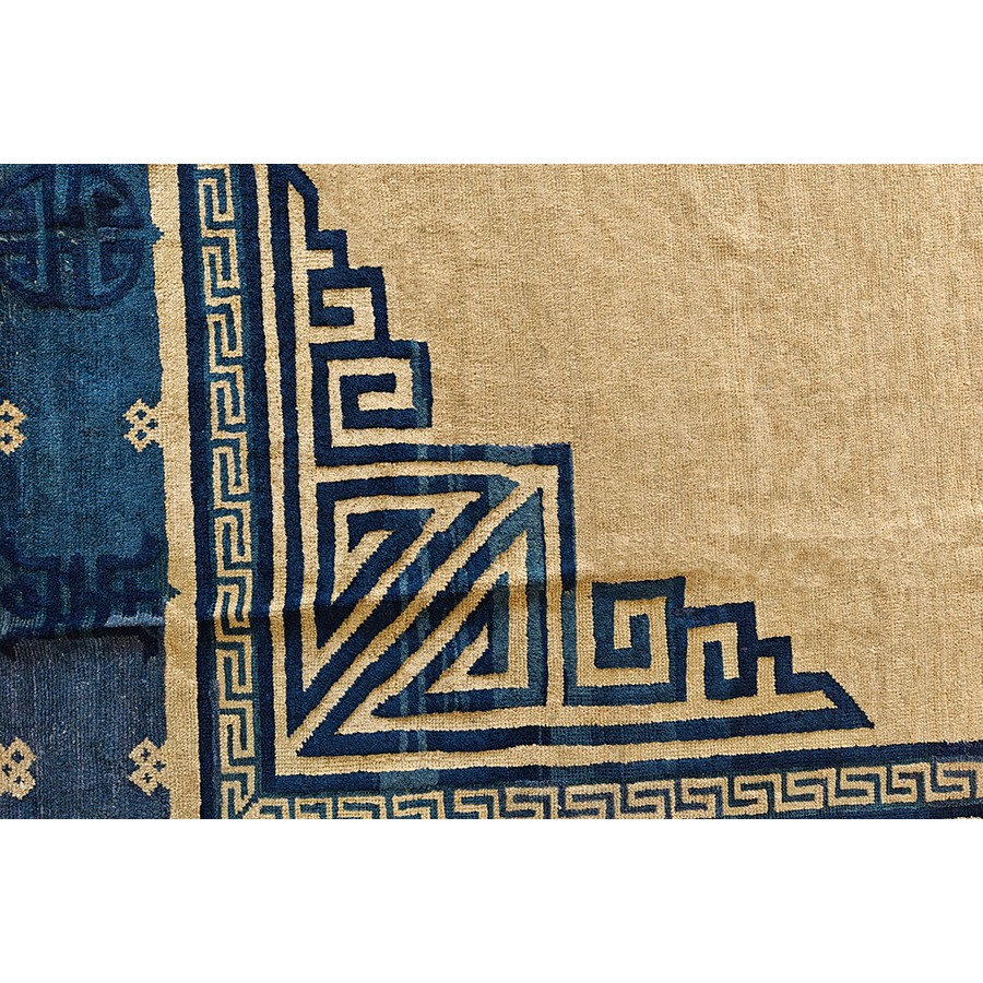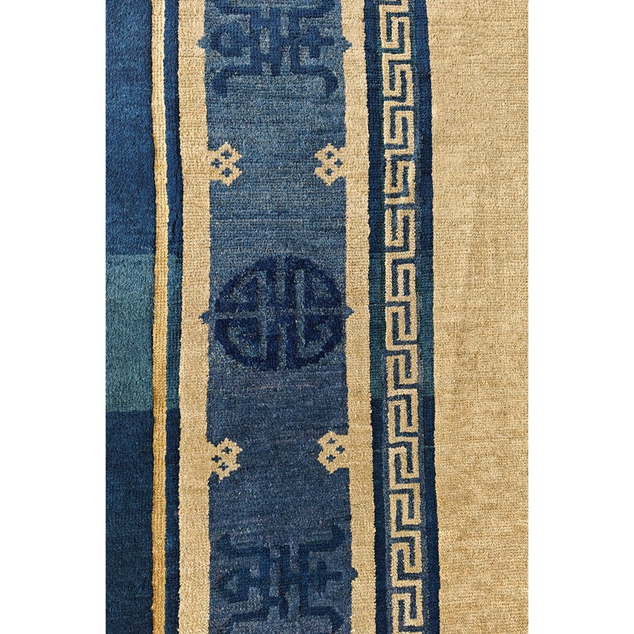 DescriptionChineseCarpets made in China proper. See entries Ningshia, Peking, Art Deco. Chinese - PekingThe commercial Peking carpet is a later 19th century development, begun by importing weaves from Ningshia (see entry) to create and export industry aimed at Western markets. The foundation is cotton and the pile is a good quality carpet wool which takes dyes particularly well. The neat medium weave is in Persian (asymmetric) knots. Designs are strictly Chinese and the whole motif repertoire of Chinese art is employed. Blue and white is the most popular color combination and red is particularly rare. Sizes tend to 9 x 12 and larger, and few small pieces appear. For a short time in the early 1920s Persian designs were woven to capitalize on the death of new Iranian goods. The industry decimated by the Communist Revolution relocated to the Pearl River area. There is a good supply of antique carpets at reasonable prices. | |