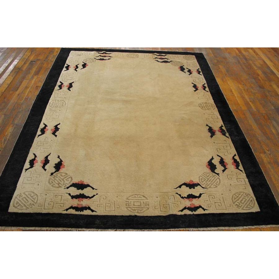 DescriptionChineseCarpets made in China proper. See entries Ningshia, Peking, Art Deco. Chinese - PekingThe commercial Peking carpet is a later 19th century development, begun by importing weaves from Ningshia (see entry) to create and export industry aimed at Western markets. The foundation is cotton and the pile is a good quality carpet wool which takes dyes particularly well. The neat medium weave is in Persian (asymmetric) knots. Designs are strictly Chinese and the whole motif repertoire of Chinese art is employed. Blue and white is the most popular color combination and red is particularly rare. Sizes tend to 9 x 12 and larger, and few small pieces appear. For a short time in the early 1920s Persian designs were woven to capitalize on the death of new Iranian goods. The industry decimated by the Communist Revolution relocated to the Pearl River area. There is a good supply of antique carpets at reasonable prices. | |