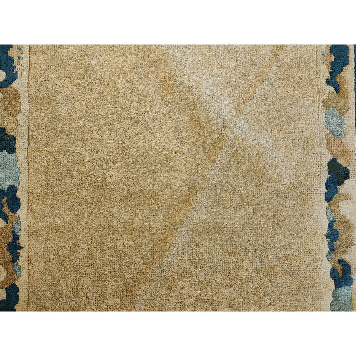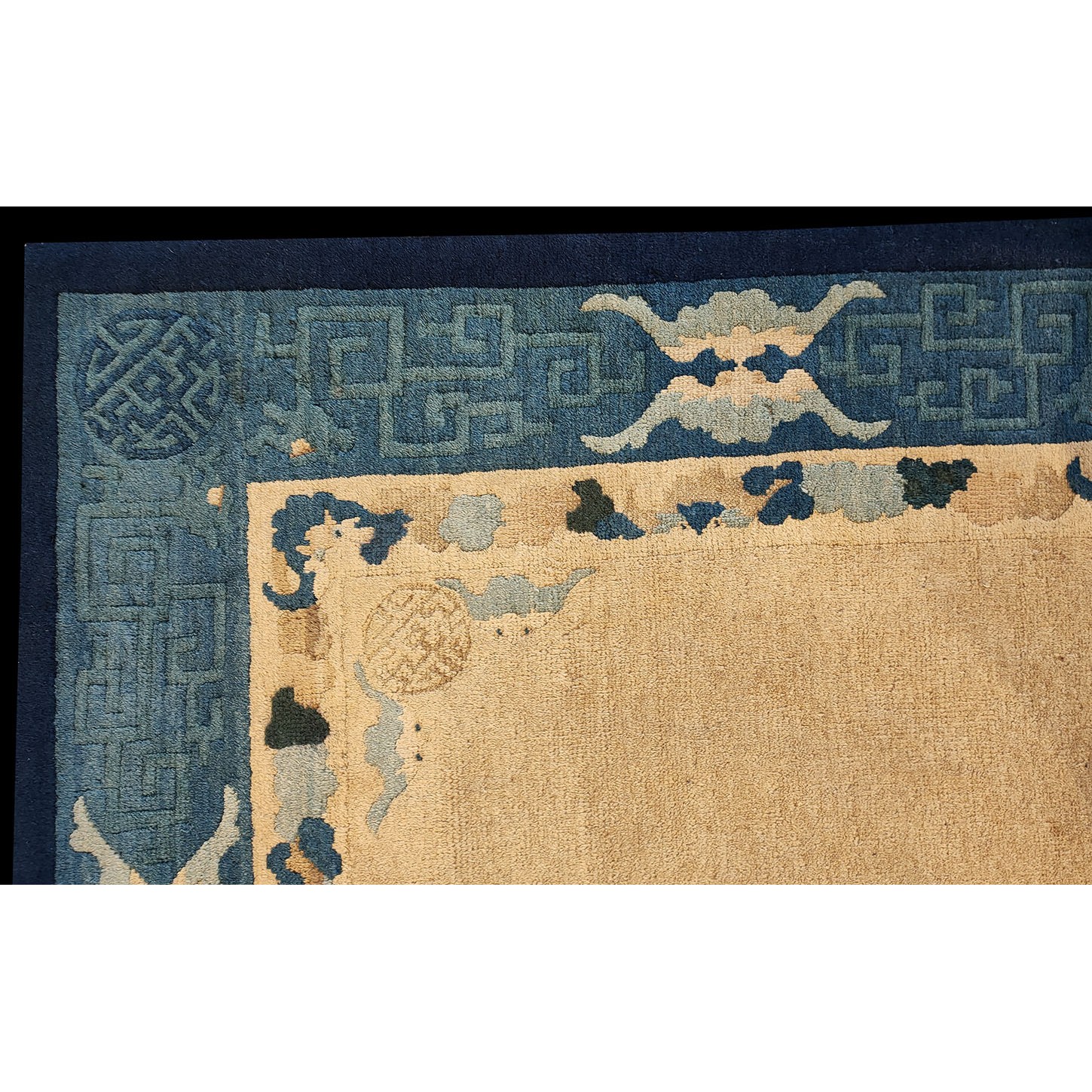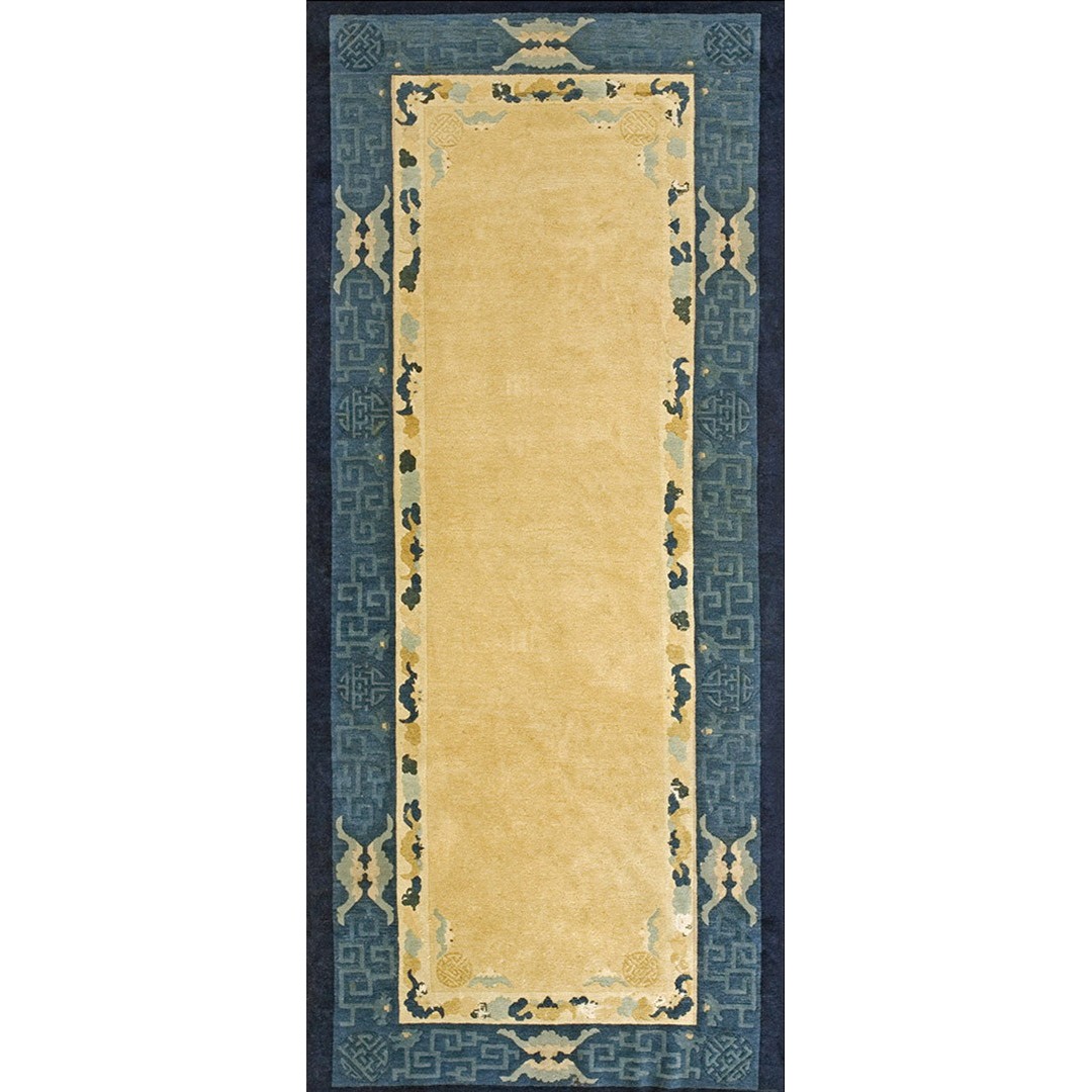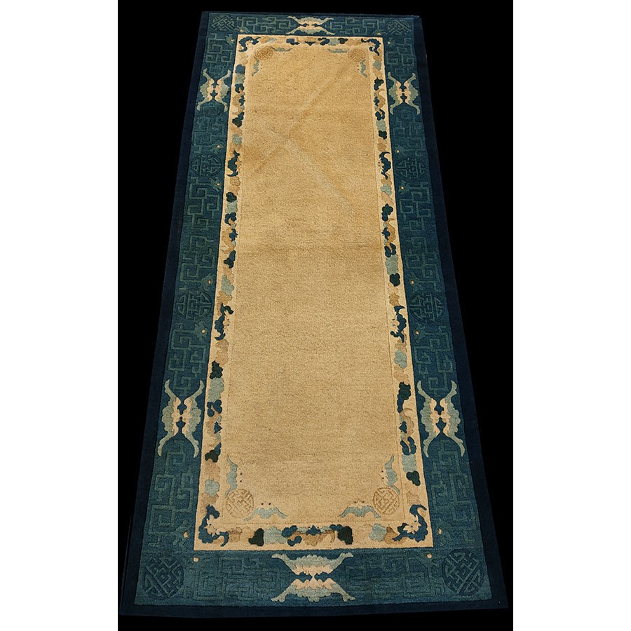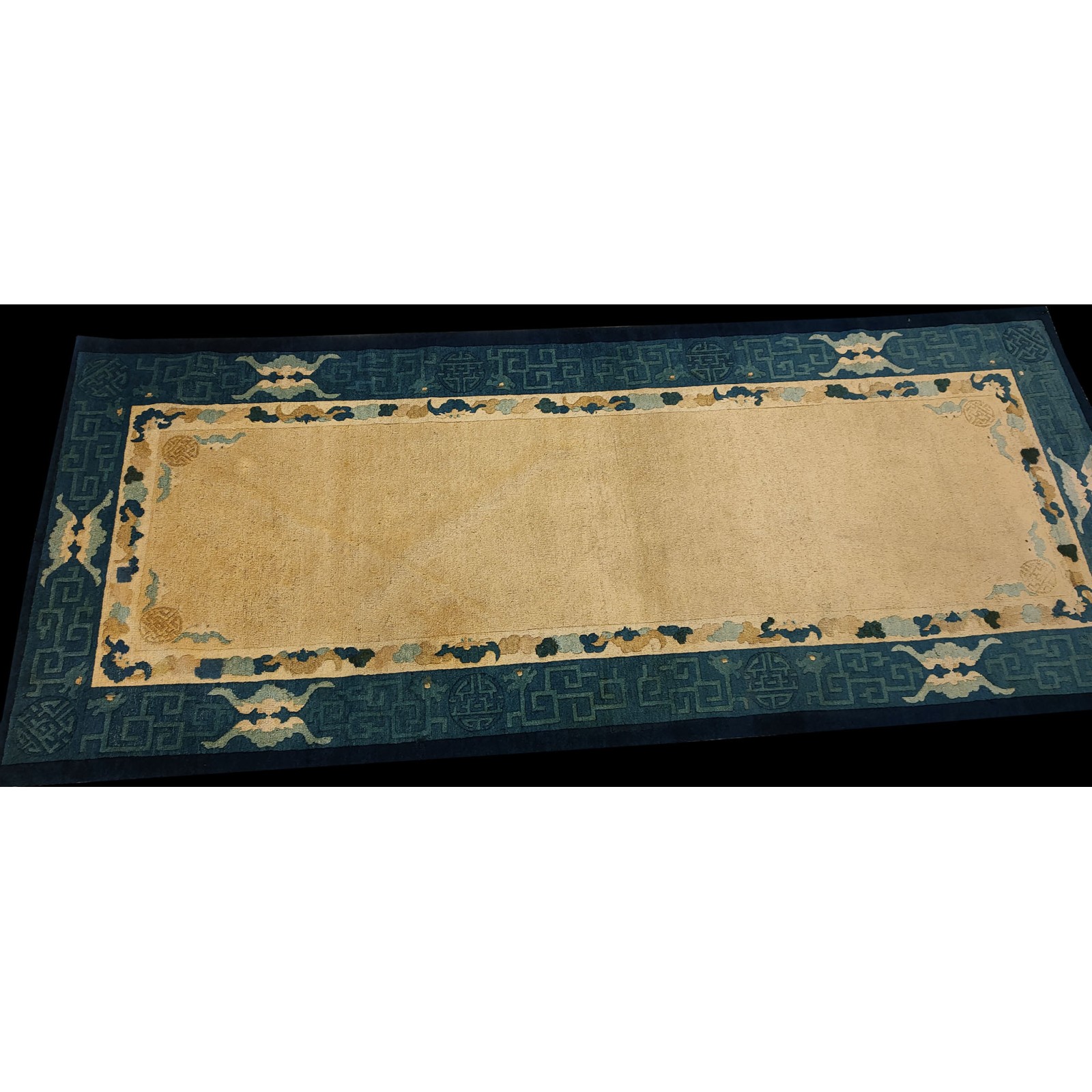 DescriptionChineseCarpets made in China proper. See entries Ningshia, Peking, Art Deco. Chinese - PekingThe commercial Peking carpet is a later 19th century development, begun by importing weaves from Ningshia (see entry) to create and export industry aimed at Western markets. The foundation is cotton and the pile is a good quality carpet wool which takes dyes particularly well. The neat medium weave is in Persian (asymmetric) knots. Designs are strictly Chinese and the whole motif repertoire of Chinese art is employed. Blue and white is the most popular color combination and red is particularly rare. Sizes tend to 9 x 12 and larger, and few small pieces appear. For a short time in the early 1920s Persian designs were woven to capitalize on the death of new Iranian goods. The industry decimated by the Communist Revolution relocated to the Pearl River area. There is a good supply of antique carpets at reasonable prices. | |