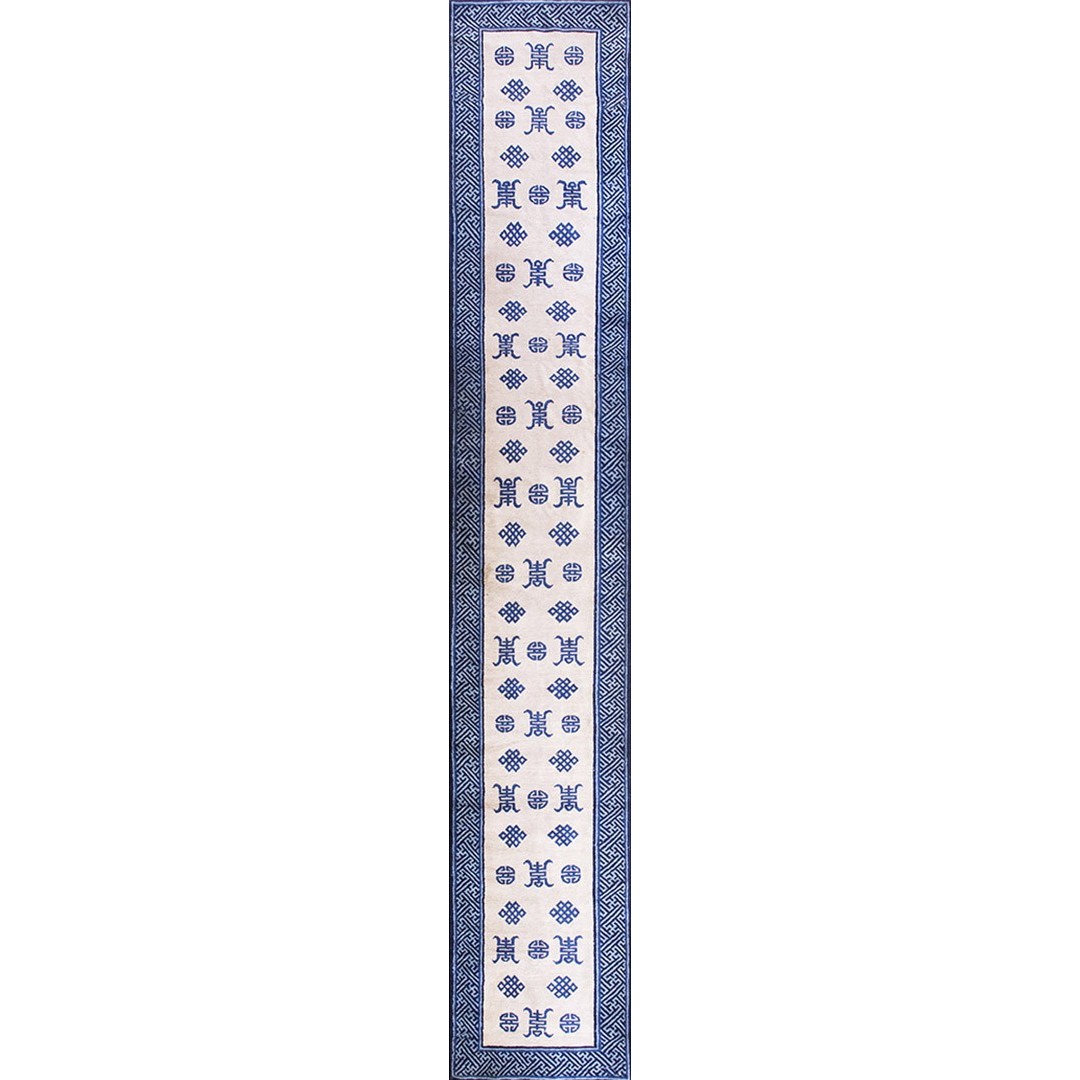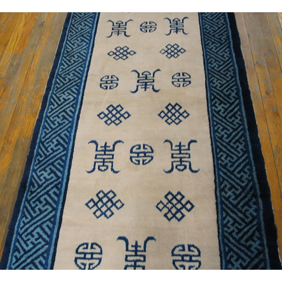 DescriptionChineseCarpets made in China proper. See entries Ningshia, Peking, Art Deco. Chinese - PekingThe commercial Peking carpet is a later 19th century development, begun by importing weaves from Ningshia (see entry) to create and export industry aimed at Western markets. The foundation is cotton and the pile is a good quality carpet wool which takes dyes particularly well. The neat medium weave is in Persian (asymmetric) knots. Designs are strictly Chinese and the whole motif repertoire of Chinese art is employed. Blue and white is the most popular color combination and red is particularly rare. Sizes tend to 9 x 12 and larger, and few small pieces appear. For a short time in the early 1920s Persian designs were woven to capitalize on the death of new Iranian goods. The industry decimated by the Communist Revolution relocated to the Pearl River area. There is a good supply of antique carpets at reasonable prices. | |