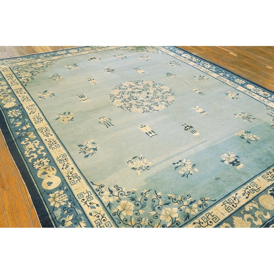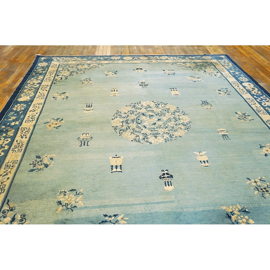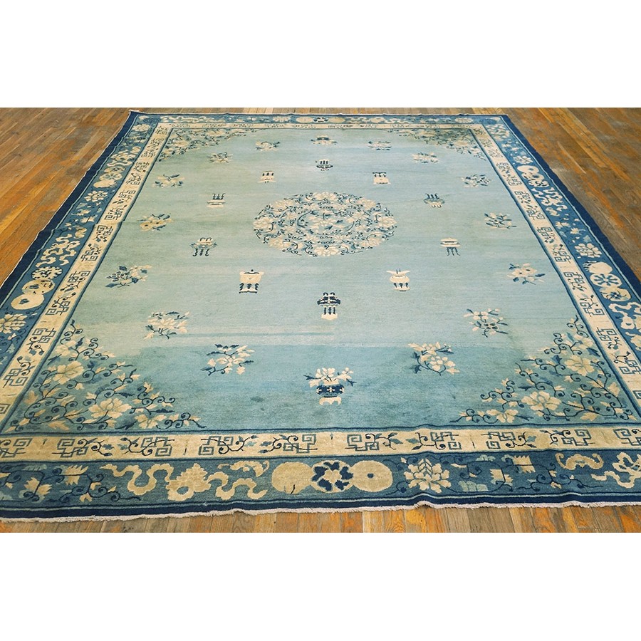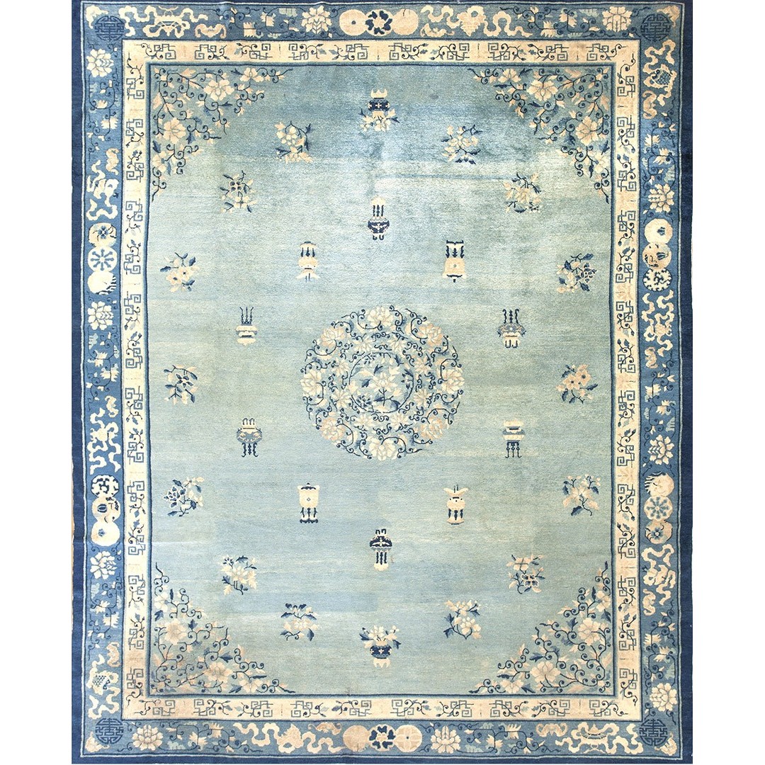 DescriptionChineseCarpets made in China proper. See entries Ningshia, Peking, Art Deco. Chinese - PekingThe commercial Peking carpet is a later 19th century development, begun by importing weaves from Ningshia (see entry) to create and export industry aimed at Western markets. The foundation is cotton and the pile is a good quality carpet wool which takes dyes particularly well. The neat medium weave is in Persian (asymmetric) knots. Designs are strictly Chinese and the whole motif repertoire of Chinese art is employed. Blue and white is the most popular color combination and red is particularly rare. Sizes tend to 9 x 12 and larger, and few small pieces appear. For a short time in the early 1920s Persian designs were woven to capitalize on the death of new Iranian goods. The industry decimated by the Communist Revolution relocated to the Pearl River area. There is a good supply of antique carpets at reasonable prices. | |