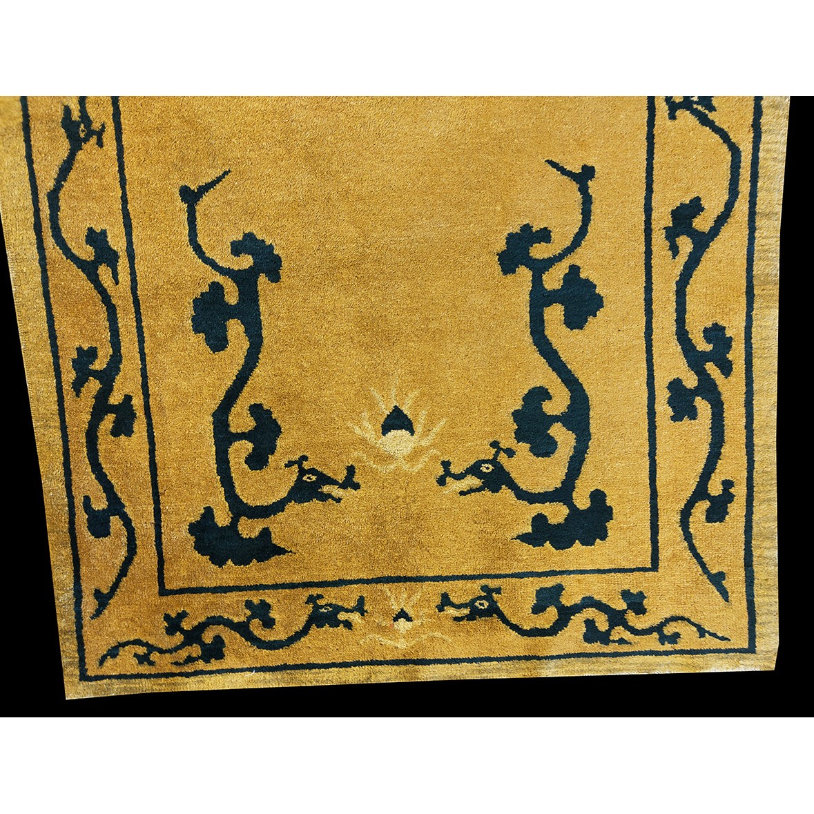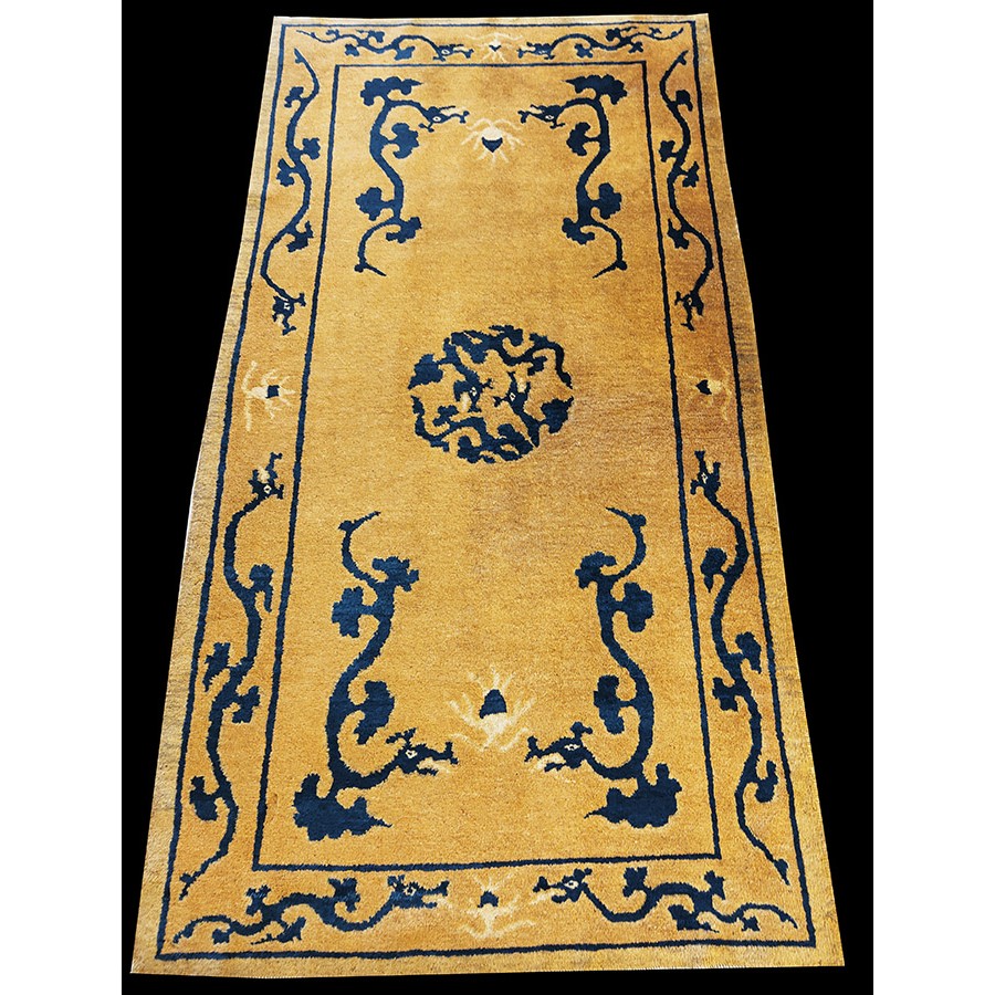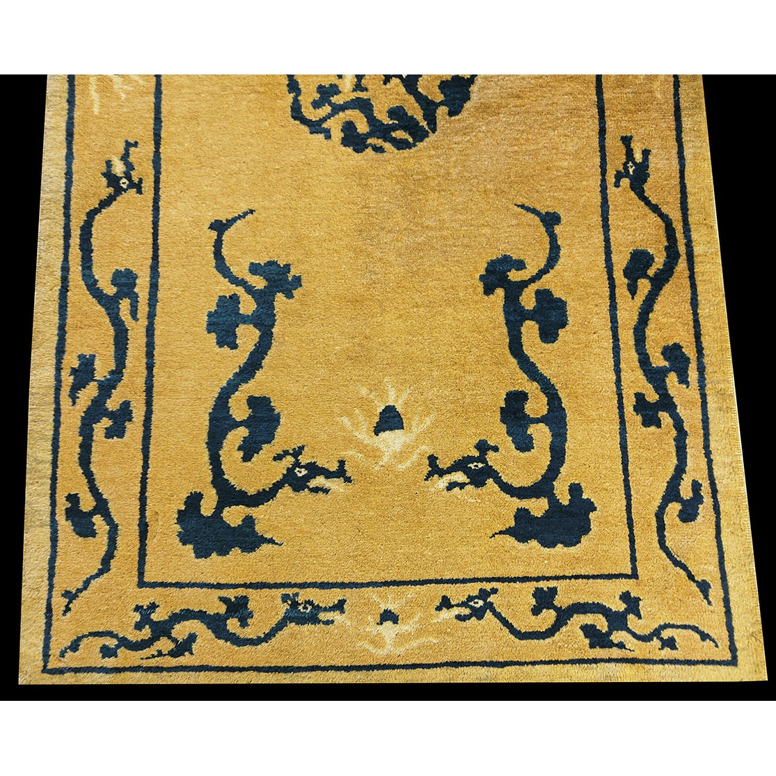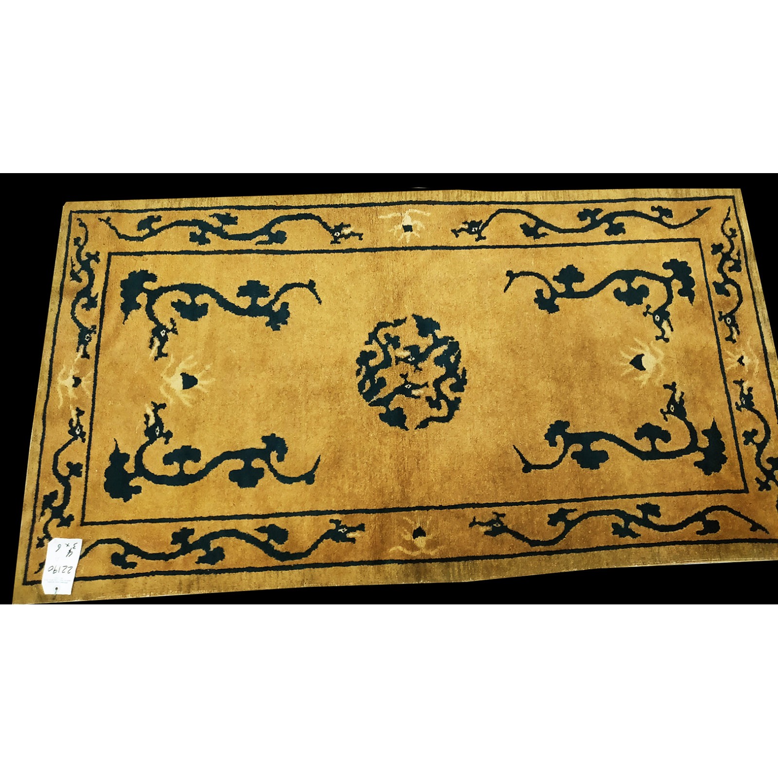 DescriptionChineseCarpets made in China proper. See entries Ningshia, Peking, Art Deco. Chinese - PekingThe commercial Peking carpet is a later 19th century development, begun by importing weaves from Ningshia (see entry) to create and export industry aimed at Western markets. The foundation is cotton and the pile is a good quality carpet wool which takes dyes particularly well. The neat medium weave is in Persian (asymmetric) knots. Designs are strictly Chinese and the whole motif repertoire of Chinese art is employed. Blue and white is the most popular color combination and red is particularly rare. Sizes tend to 9 x 12 and larger, and few small pieces appear. For a short time in the early 1920s Persian designs were woven to capitalize on the death of new Iranian goods. The industry decimated by the Communist Revolution relocated to the Pearl River area. There is a good supply of antique carpets at reasonable prices. | |