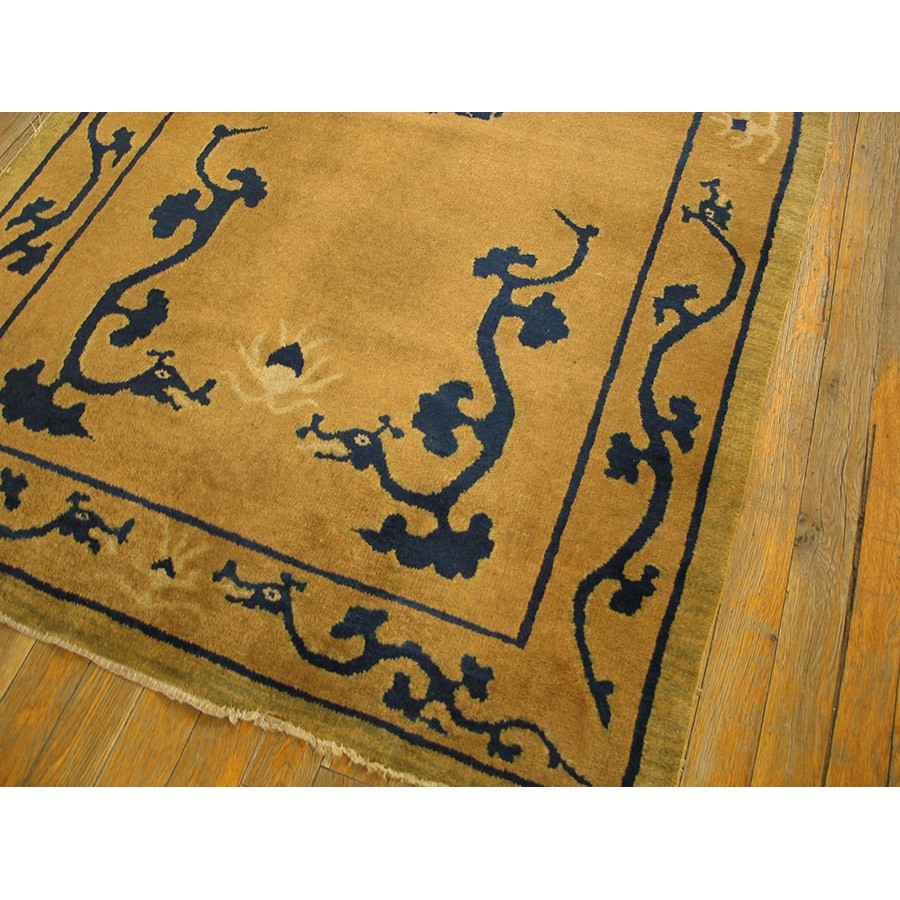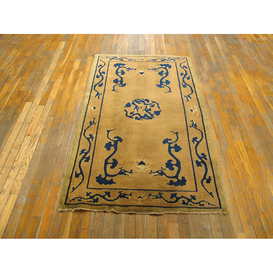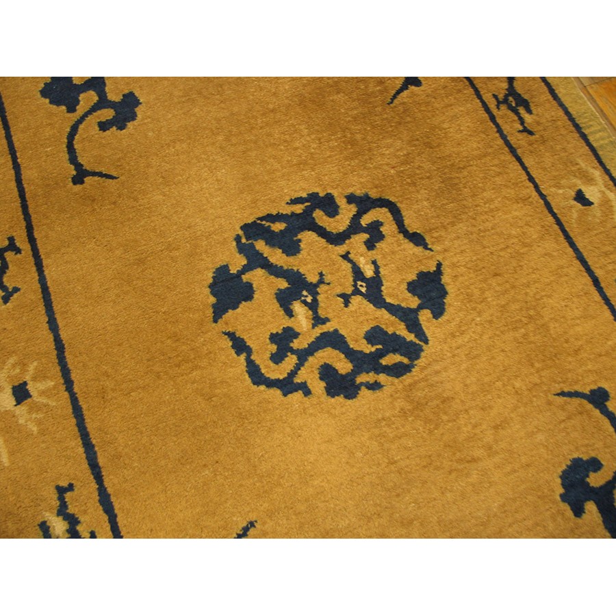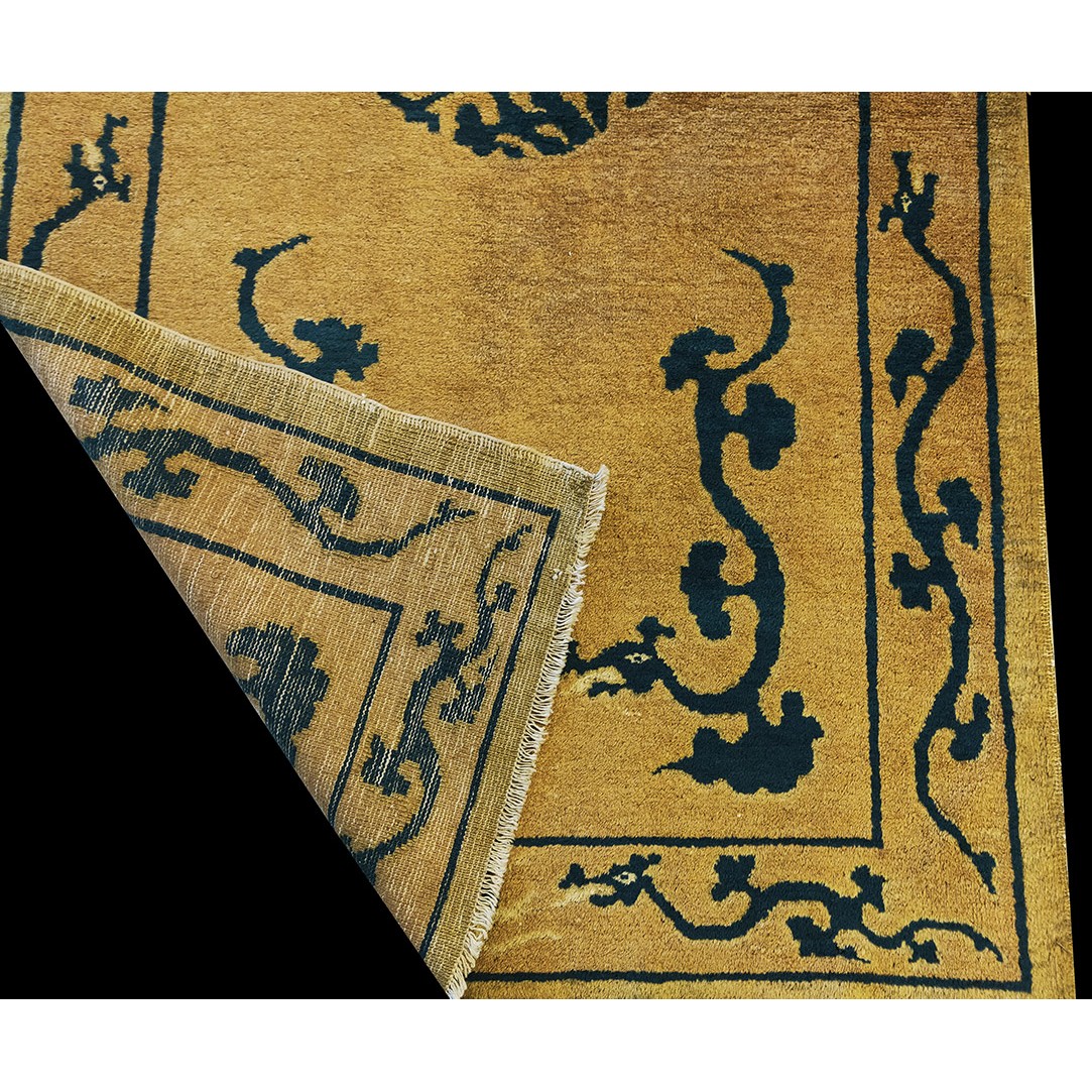 DescriptionChineseCarpets made in China proper. See entries Ningshia, Peking, Art Deco. Chinese - PekingThe commercial Peking carpet is a later 19th century development, begun by importing weaves from Ningshia (see entry) to create and export industry aimed at Western markets. The foundation is cotton and the pile is a good quality carpet wool which takes dyes particularly well. The neat medium weave is in Persian (asymmetric) knots. Designs are strictly Chinese and the whole motif repertoire of Chinese art is employed. Blue and white is the most popular color combination and red is particularly rare. Sizes tend to 9 x 12 and larger, and few small pieces appear. For a short time in the early 1920s Persian designs were woven to capitalize on the death of new Iranian goods. The industry decimated by the Communist Revolution relocated to the Pearl River area. There is a good supply of antique carpets at reasonable prices. | |