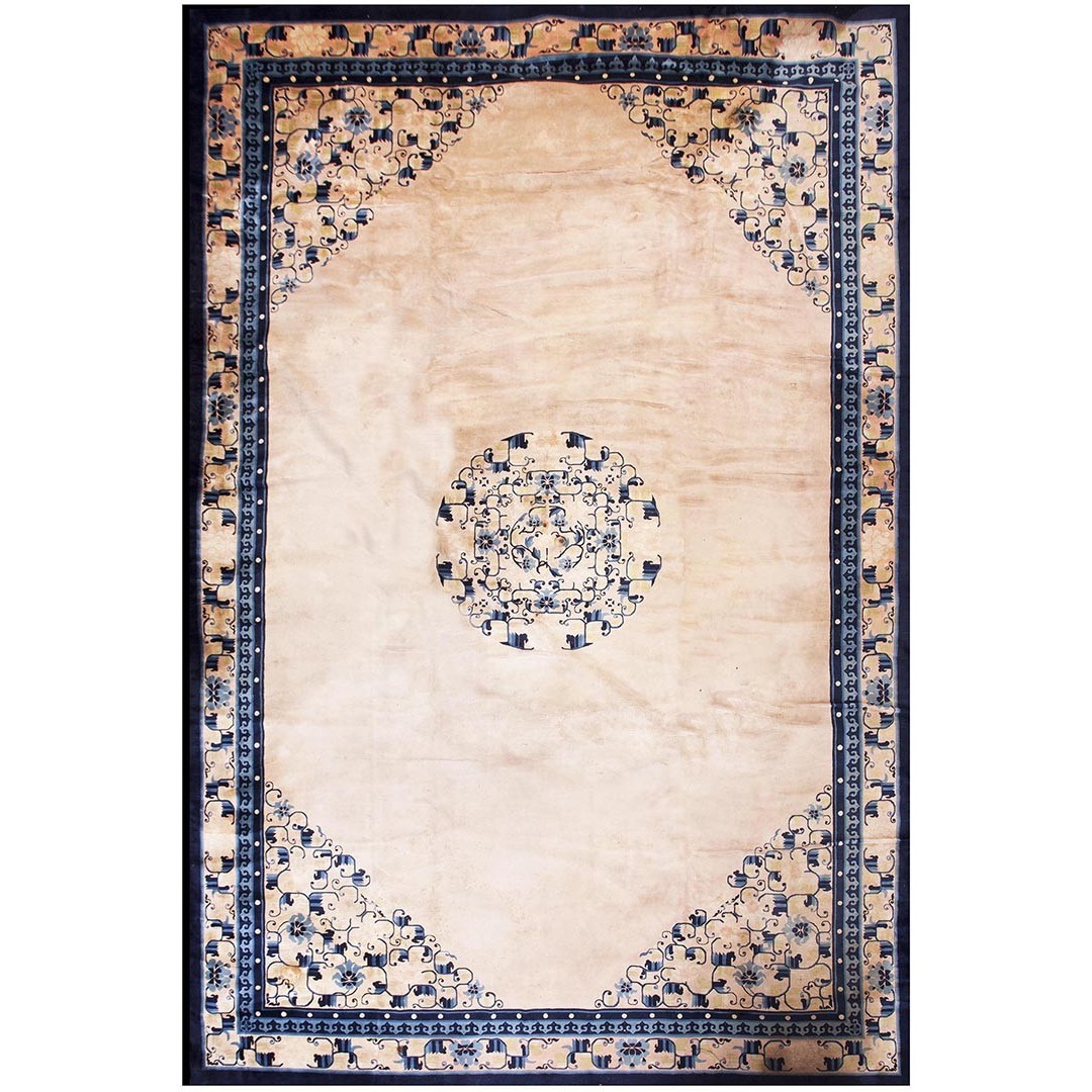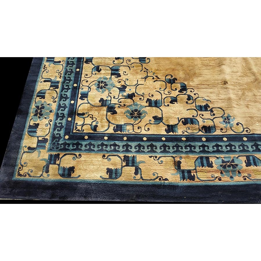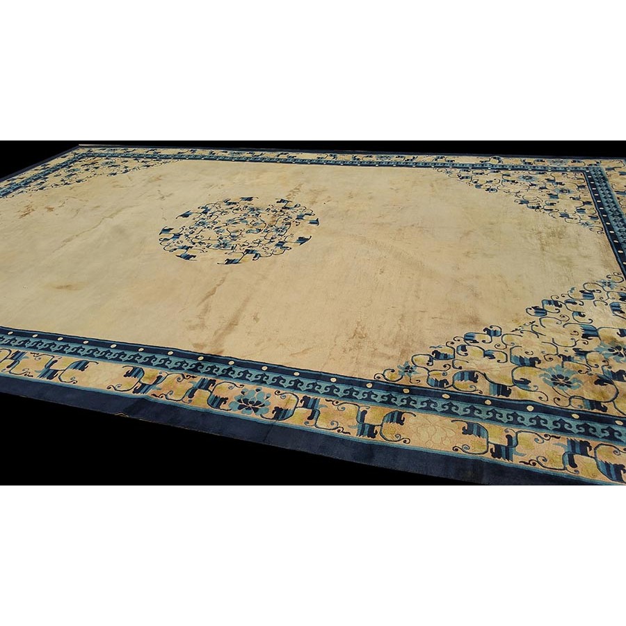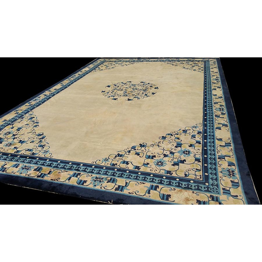 DescriptionChineseCarpets made in China proper. See entries Ningshia, Peking, Art Deco. Chinese - PekingThe commercial Peking carpet is a later 19th century development, begun by importing weaves from Ningshia (see entry) to create and export industry aimed at Western markets. The foundation is cotton and the pile is a good quality carpet wool which takes dyes particularly well. The neat medium weave is in Persian (asymmetric) knots. Designs are strictly Chinese and the whole motif repertoire of Chinese art is employed. Blue and white is the most popular color combination and red is particularly rare. Sizes tend to 9 x 12 and larger, and few small pieces appear. For a short time in the early 1920s Persian designs were woven to capitalize on the death of new Iranian goods. The industry decimated by the Communist Revolution relocated to the Pearl River area. There is a good supply of antique carpets at reasonable prices. | |