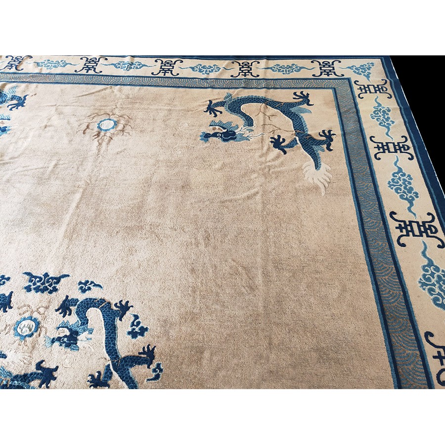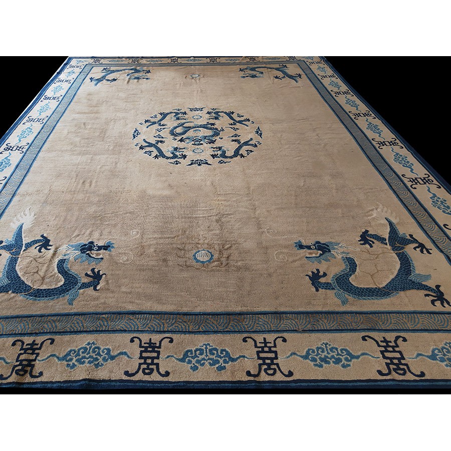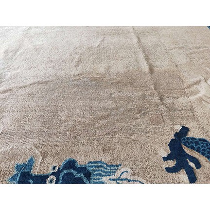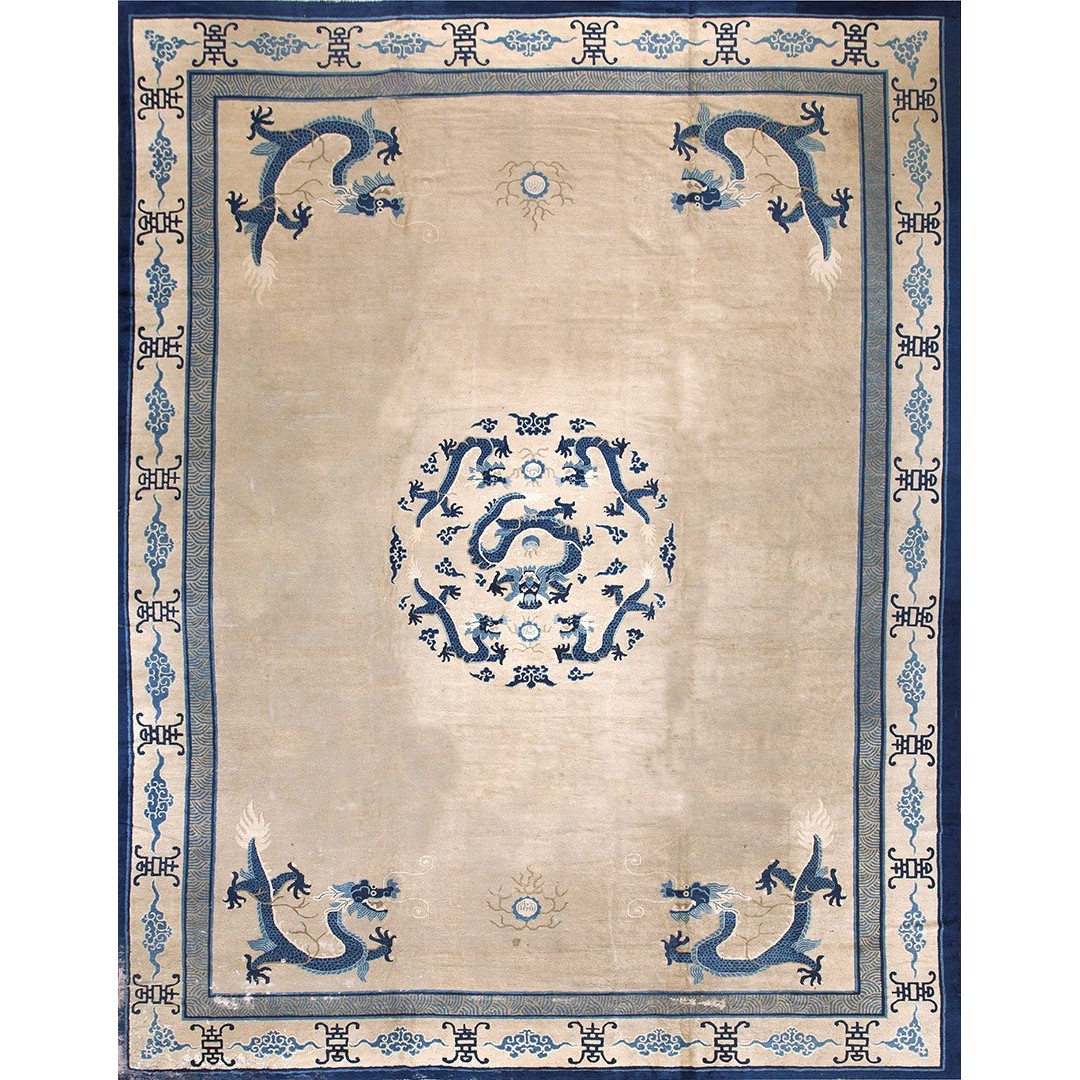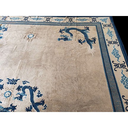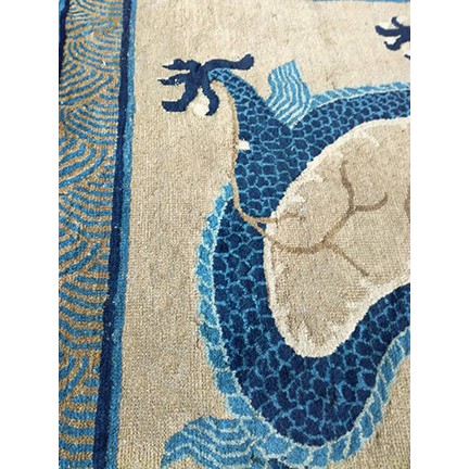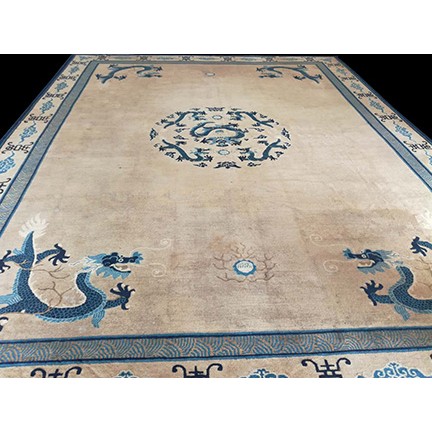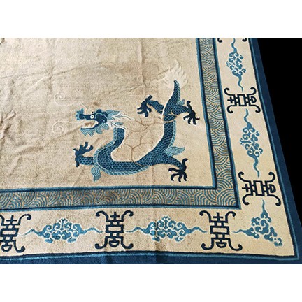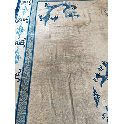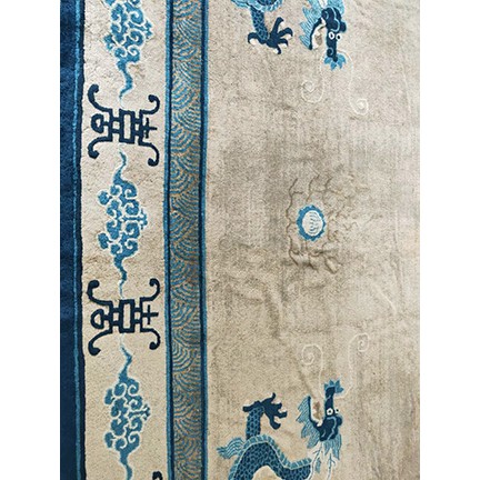 DescriptionChineseCarpets made in China proper. See entries Ningshia, Peking, Art Deco. Chinese - PekingThe commercial Peking carpet is a later 19th century development, begun by importing weaves from Ningshia (see entry) to create and export industry aimed at Western markets. The foundation is cotton and the pile is a good quality carpet wool which takes dyes particularly well. The neat medium weave is in Persian (asymmetric) knots. Designs are strictly Chinese and the whole motif repertoire of Chinese art is employed. Blue and white is the most popular color combination and red is particularly rare. Sizes tend to 9 x 12 and larger, and few small pieces appear. For a short time in the early 1920s Persian designs were woven to capitalize on the death of new Iranian goods. The industry decimated by the Communist Revolution relocated to the Pearl River area. There is a good supply of antique carpets at reasonable prices. | |