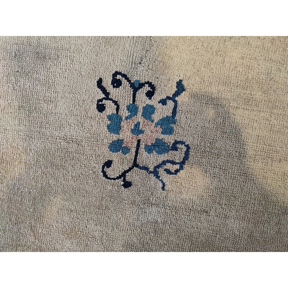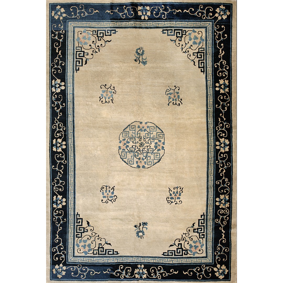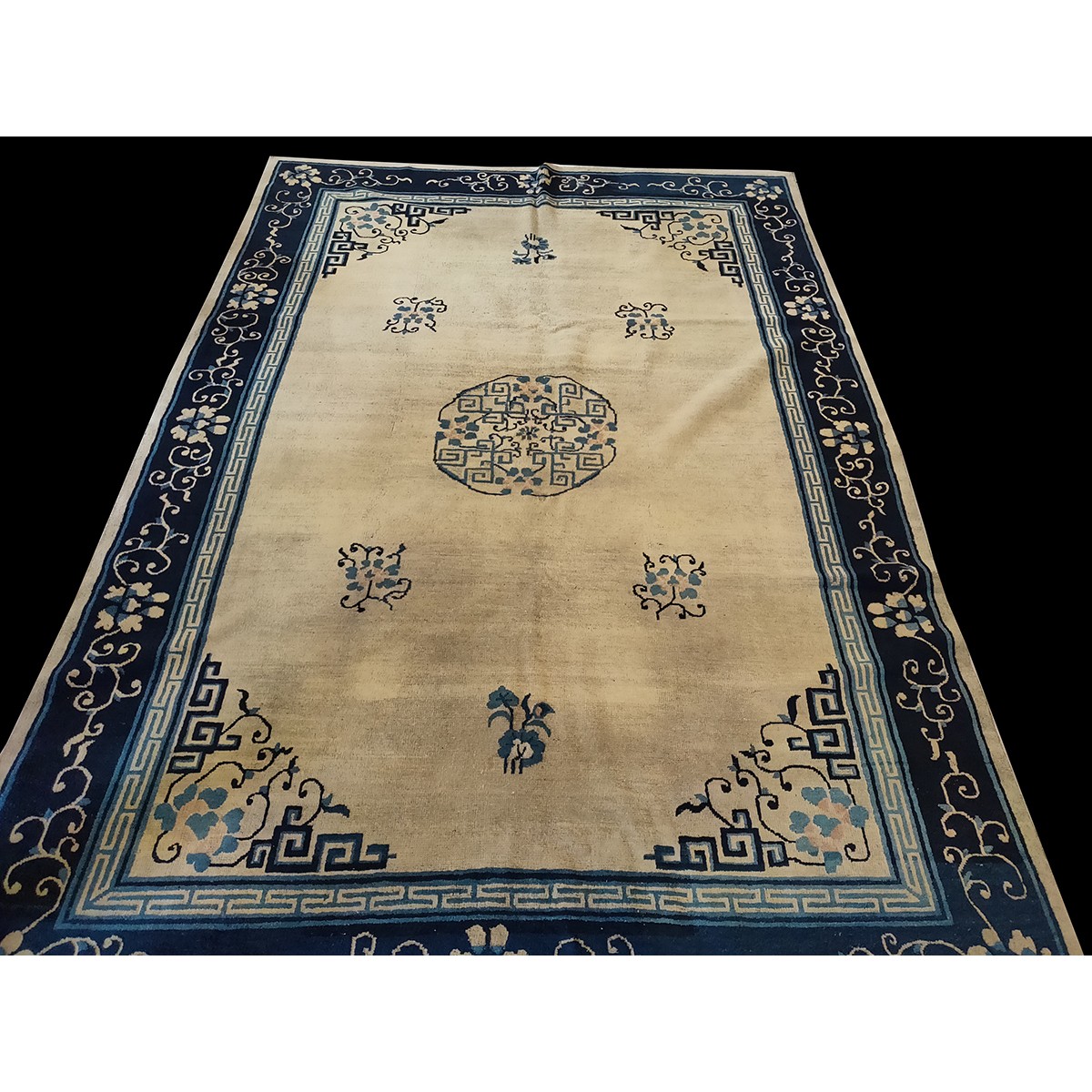 DescriptionChineseCarpets made in China proper. See entries Ningshia, Peking, Art Deco. Chinese - PekingThe commercial Peking carpet is a later 19th century development, begun by importing weaves from Ningshia (see entry) to create and export industry aimed at Western markets. The foundation is cotton and the pile is a good quality carpet wool which takes dyes particularly well. The neat medium weave is in Persian (asymmetric) knots. Designs are strictly Chinese and the whole motif repertoire of Chinese art is employed. Blue and white is the most popular color combination and red is particularly rare. Sizes tend to 9 x 12 and larger, and few small pieces appear. For a short time in the early 1920s Persian designs were woven to capitalize on the death of new Iranian goods. The industry decimated by the Communist Revolution relocated to the Pearl River area. There is a good supply of antique carpets at reasonable prices. | |
