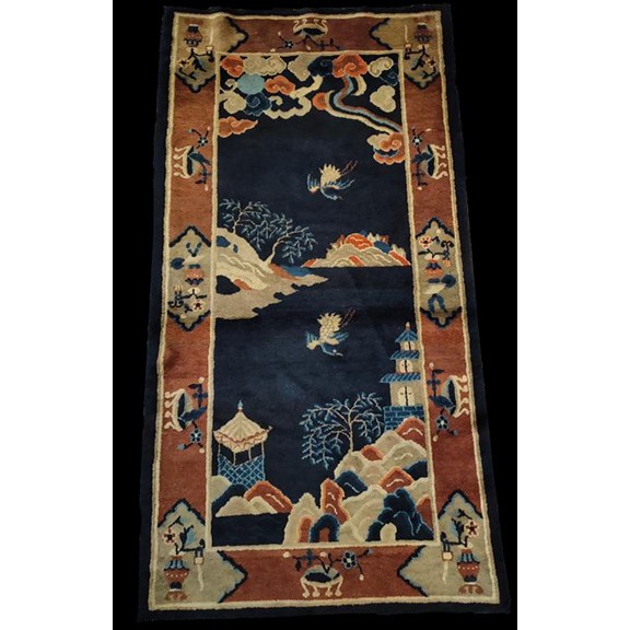 The commercial Peking carpet is a later 19th century development, begun by importing weaves from Ningshia (see entry) to create and export industry aimed at Western markets. The foundation is cotton and the pile is a good quality carpet wool which takes dyes particularly well. The neat medium weave is in Persian (asymmetric) knots. Designs are strictly Chinese and the whole motif repertoire of Chinese art is employed. Blue and white is the most popular color combination and red is particularly rare. Sizes tend to 9’ x 12’ and larger, and few small pieces appear. For a short time in the early 1920’s Persian designs were woven to capitalize on the death of new Iranian goods. The industry decimated by the Communist Revolution relocated to the Pearl River area. There is a good supply of antique carpets at reasonable prices.