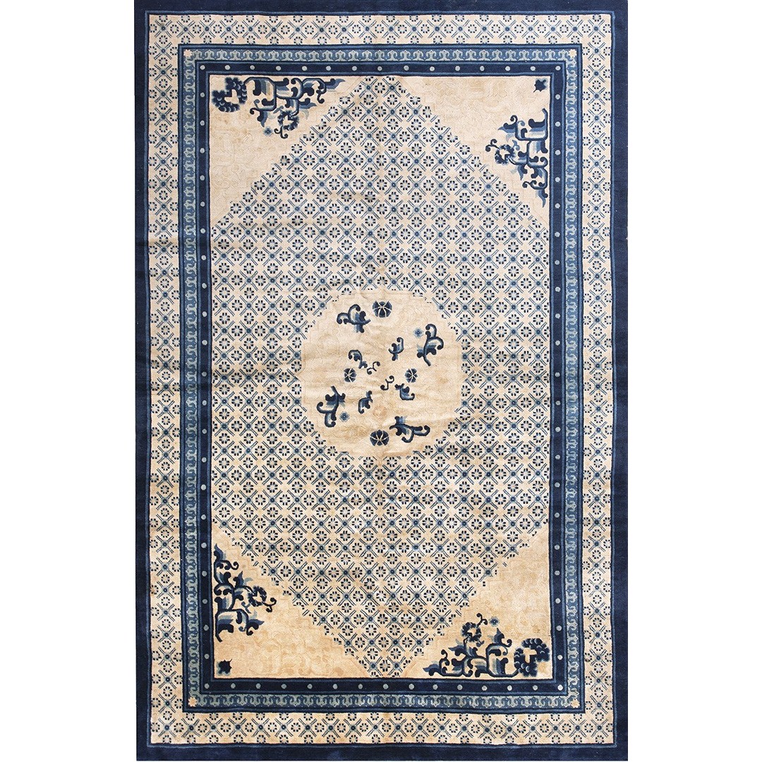 The commercial Peking carpet is a later 19th century development, begun by importing weaves from Ningshia (see entry) to create and export industry aimed at Western markets. The foundation is cotton and the pile is a good quality carpet wool which takes dyes particularly well. The neat medium weave is in Persian (asymmetric) knots. Designs are strictly Chinese and the whole motif repertoire of Chinese art is employed. Blue and white is the most popular color combination and red is particularly rare. Sizes tend to 9’ x 12’ and larger, and few small pieces appear. For a short time in the early 1920’s Persian designs were woven to capitalize on the death of new Iranian goods. The industry decimated by the Communist Revolution relocated to the Pearl River area. There is a good supply of antique carpets at reasonable prices.