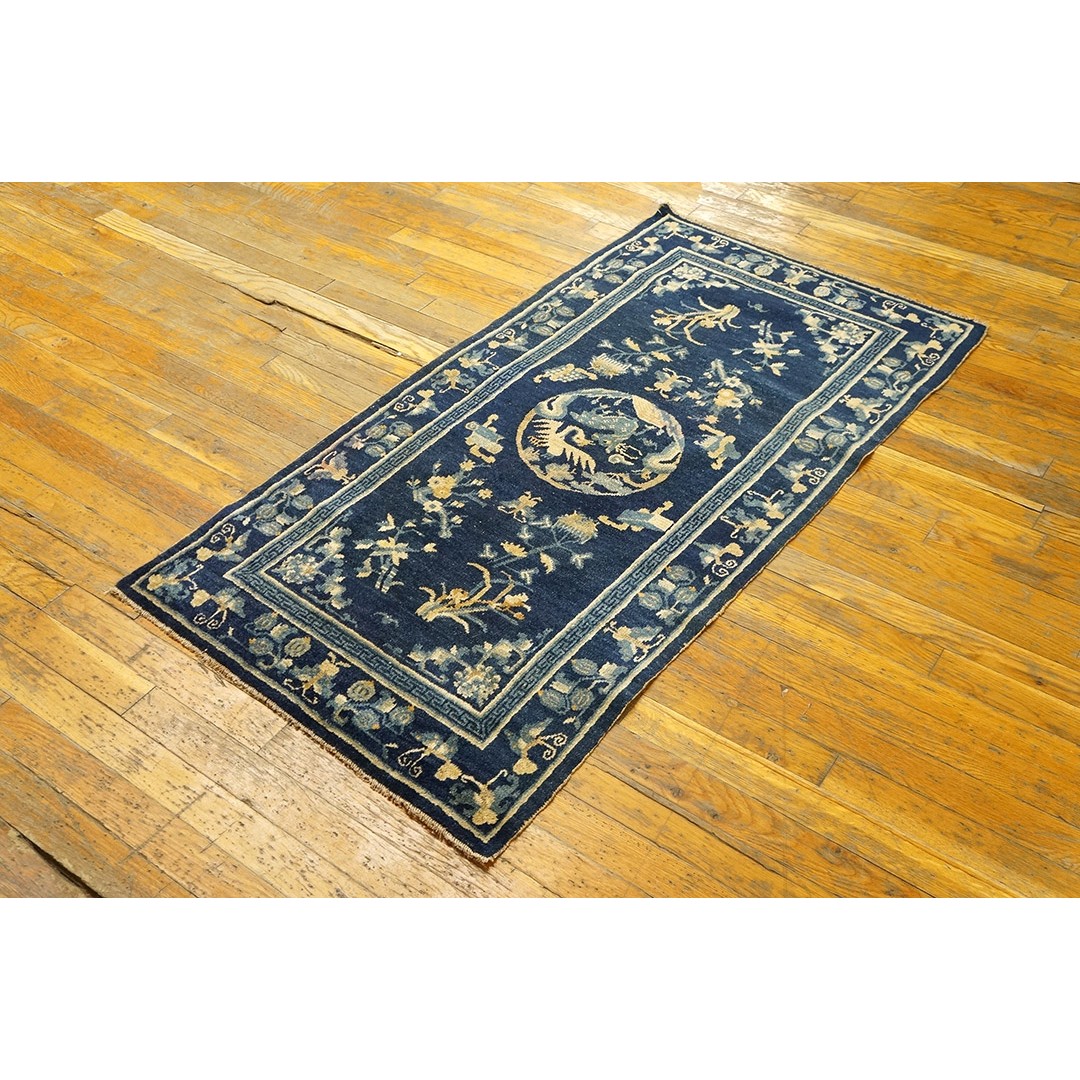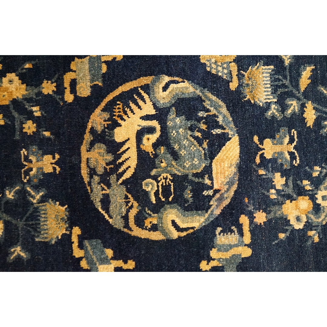 DescriptionChineseCarpets made in China proper. See entries Ningshia, Peking, Art Deco. Chinese - PekingThe commercial Peking carpet is a later 19th century development, begun by importing weaves from Ningshia (see entry) to create and export industry aimed at Western markets. The foundation is cotton and the pile is a good quality carpet wool which takes dyes particularly well. The neat medium weave is in Persian (asymmetric) knots. Designs are strictly Chinese and the whole motif repertoire of Chinese art is employed. Blue and white is the most popular color combination and red is particularly rare. Sizes tend to 9 x 12 and larger, and few small pieces appear. For a short time in the early 1920s Persian designs were woven to capitalize on the death of new Iranian goods. The industry decimated by the Communist Revolution relocated to the Pearl River area. There is a good supply of antique carpets at reasonable prices. | |