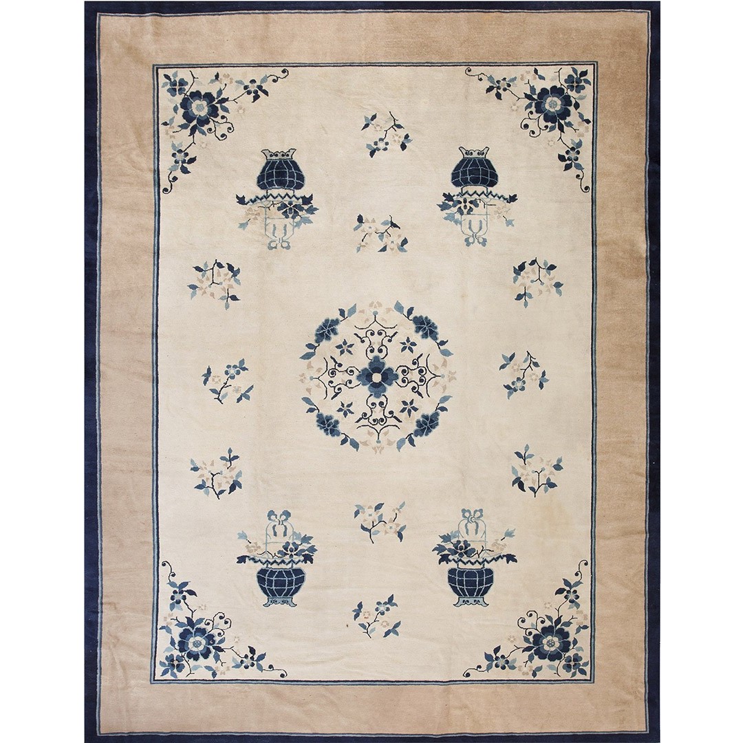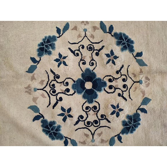 DescriptionChineseCarpets made in China proper. See entries Ningshia, Peking, Art Deco. Chinese - PekingThe commercial Peking carpet is a later 19th century development, begun by importing weaves from Ningshia (see entry) to create and export industry aimed at Western markets. The foundation is cotton and the pile is a good quality carpet wool which takes dyes particularly well. The neat medium weave is in Persian (asymmetric) knots. Designs are strictly Chinese and the whole motif repertoire of Chinese art is employed. Blue and white is the most popular color combination and red is particularly rare. Sizes tend to 9 x 12 and larger, and few small pieces appear. For a short time in the early 1920s Persian designs were woven to capitalize on the death of new Iranian goods. The industry decimated by the Communist Revolution relocated to the Pearl River area. There is a good supply of antique carpets at reasonable prices. | |