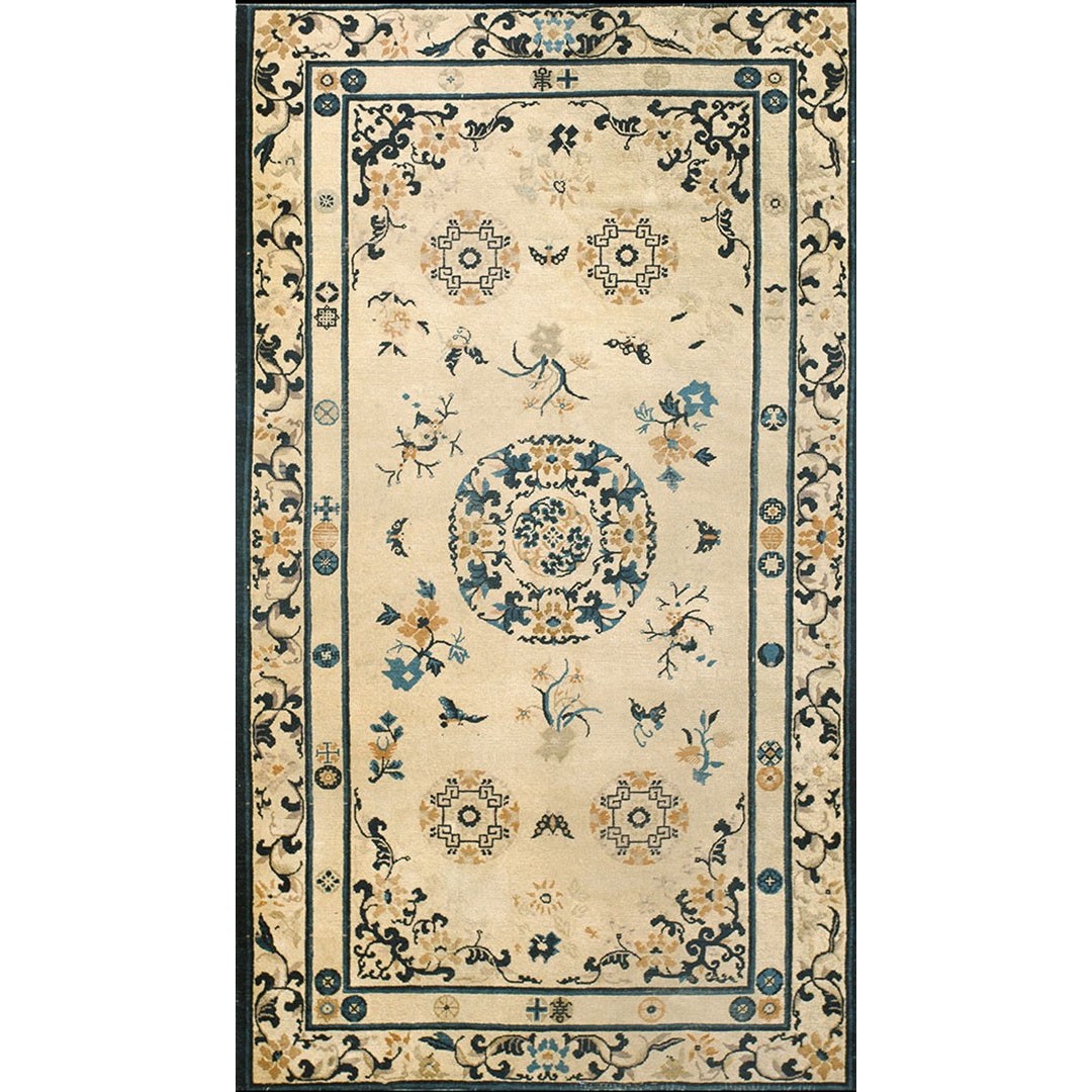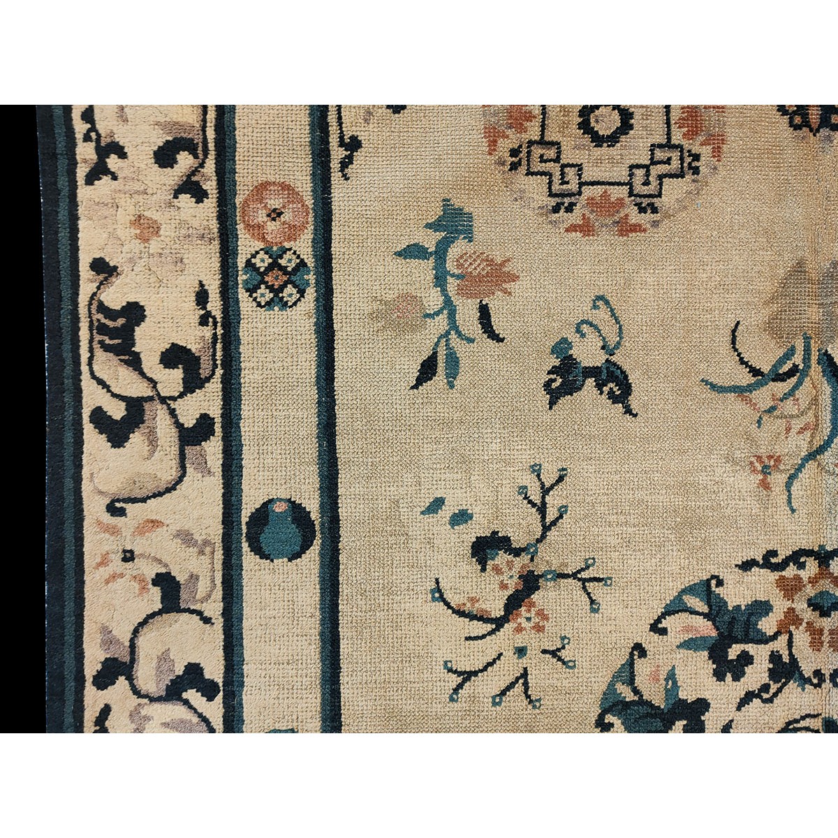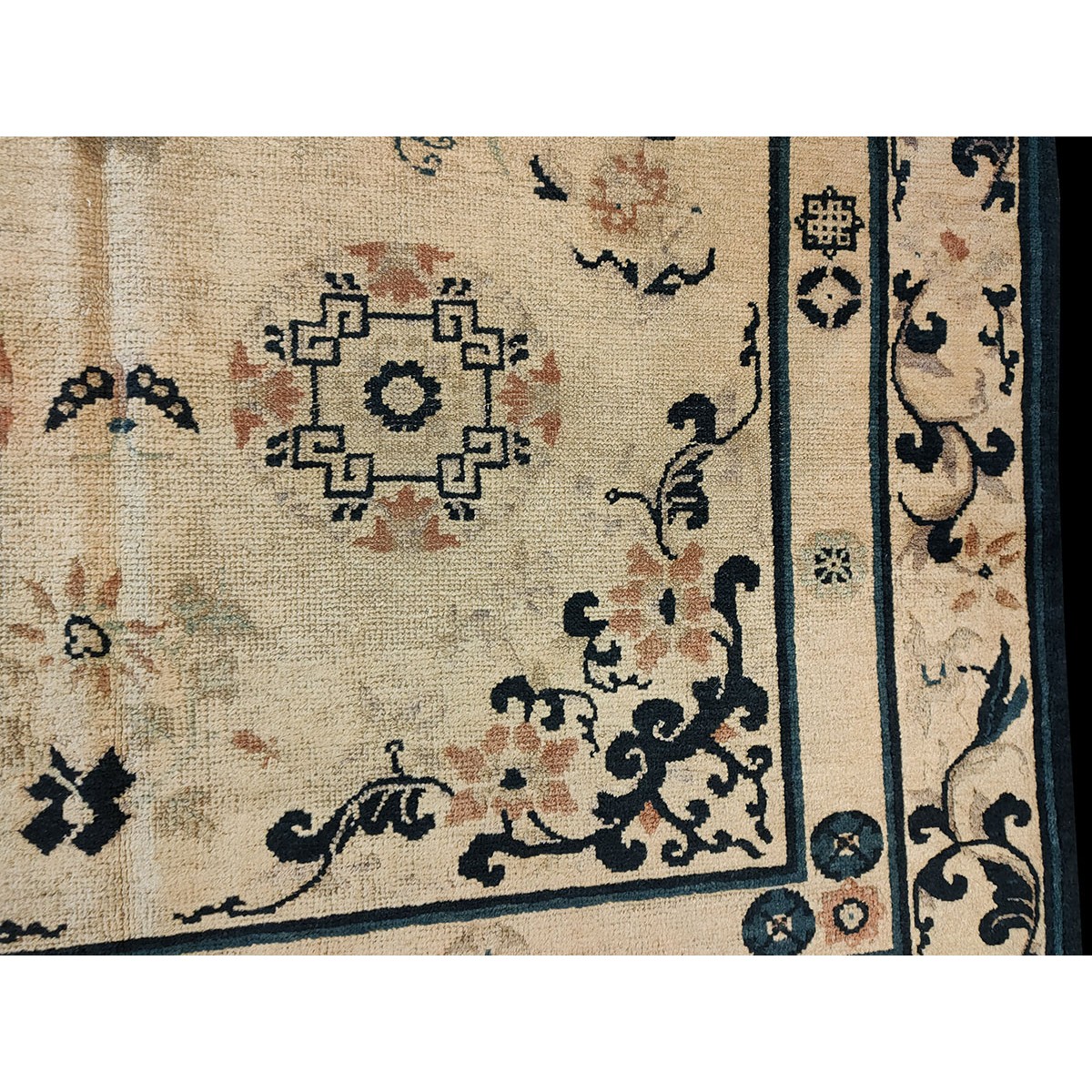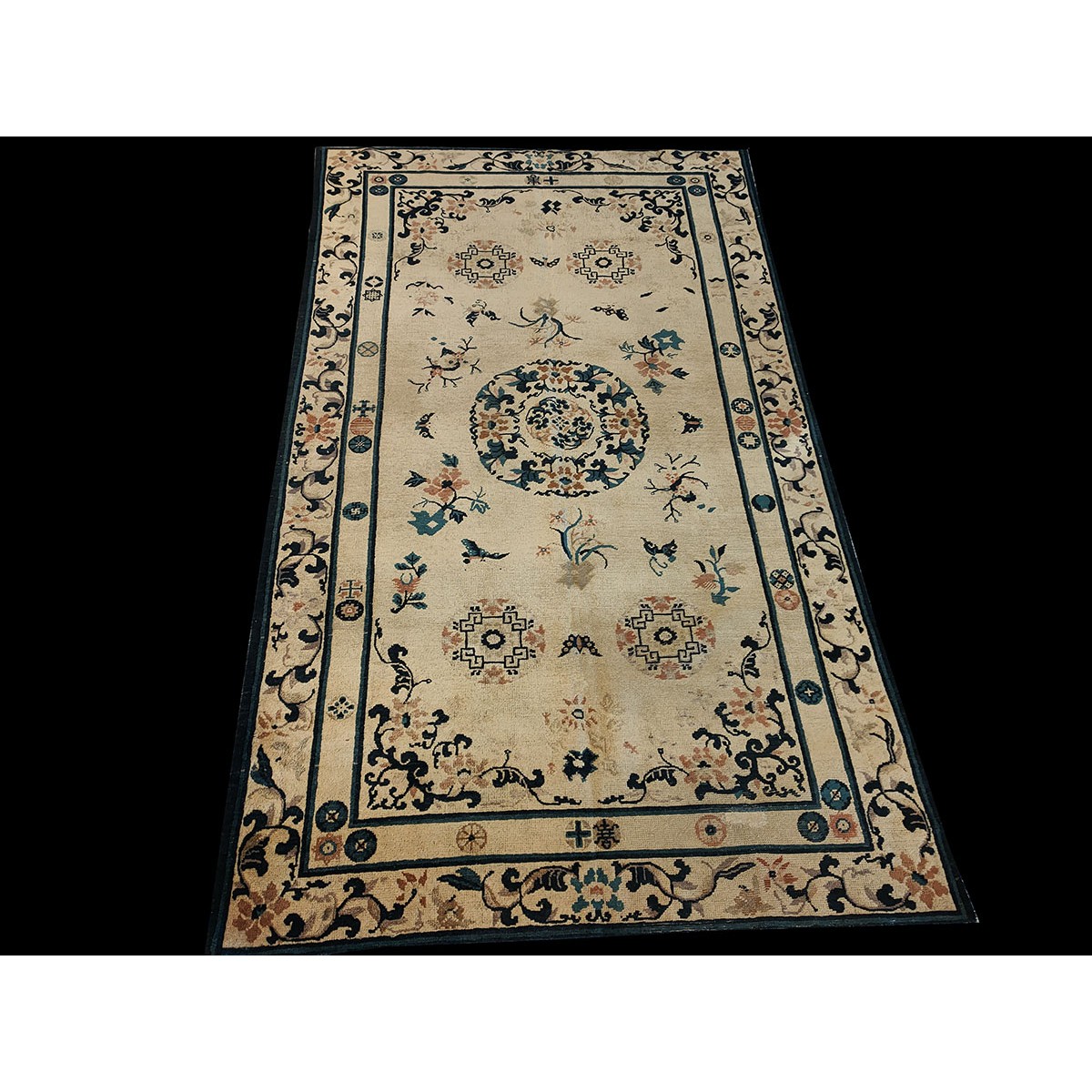 The commercial Peking carpet is a later 19th century development, begun by importing weaves from Ningshia (see entry) to create and export industry aimed at Western markets. The foundation is cotton and the pile is a good quality carpet wool which takes dyes particularly well. The neat medium weave is in Persian (asymmetric) knots. Designs are strictly Chinese and the whole motif repertoire of Chinese art is employed. Blue and white is the most popular color combination and red is particularly rare. Sizes tend to 9’ x 12’ and larger, and few small pieces appear. For a short time in the early 1920’s Persian designs were woven to capitalize on the death of new Iranian goods. The industry decimated by the Communist Revolution relocated to the Pearl River area. There is a good supply of antique carpets at reasonable prices.