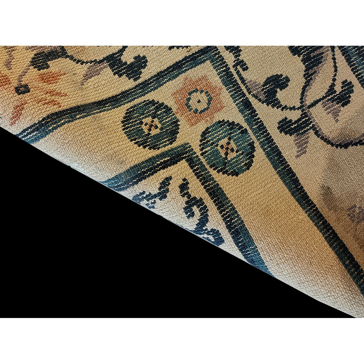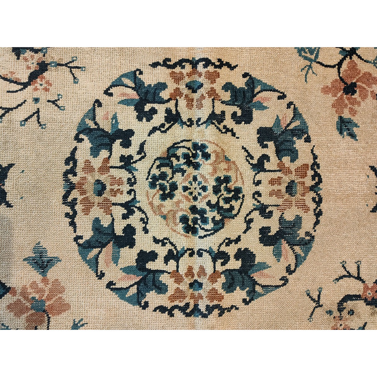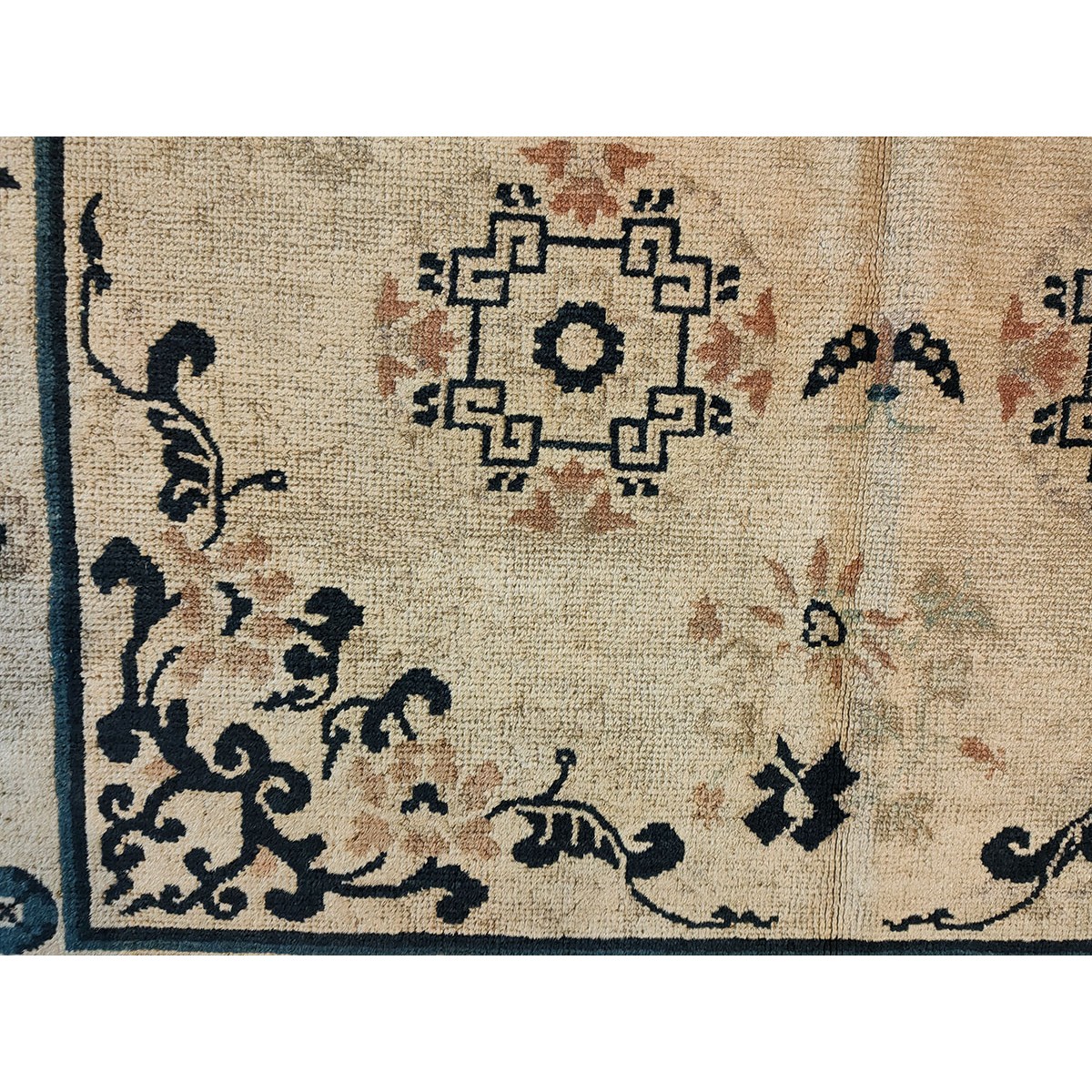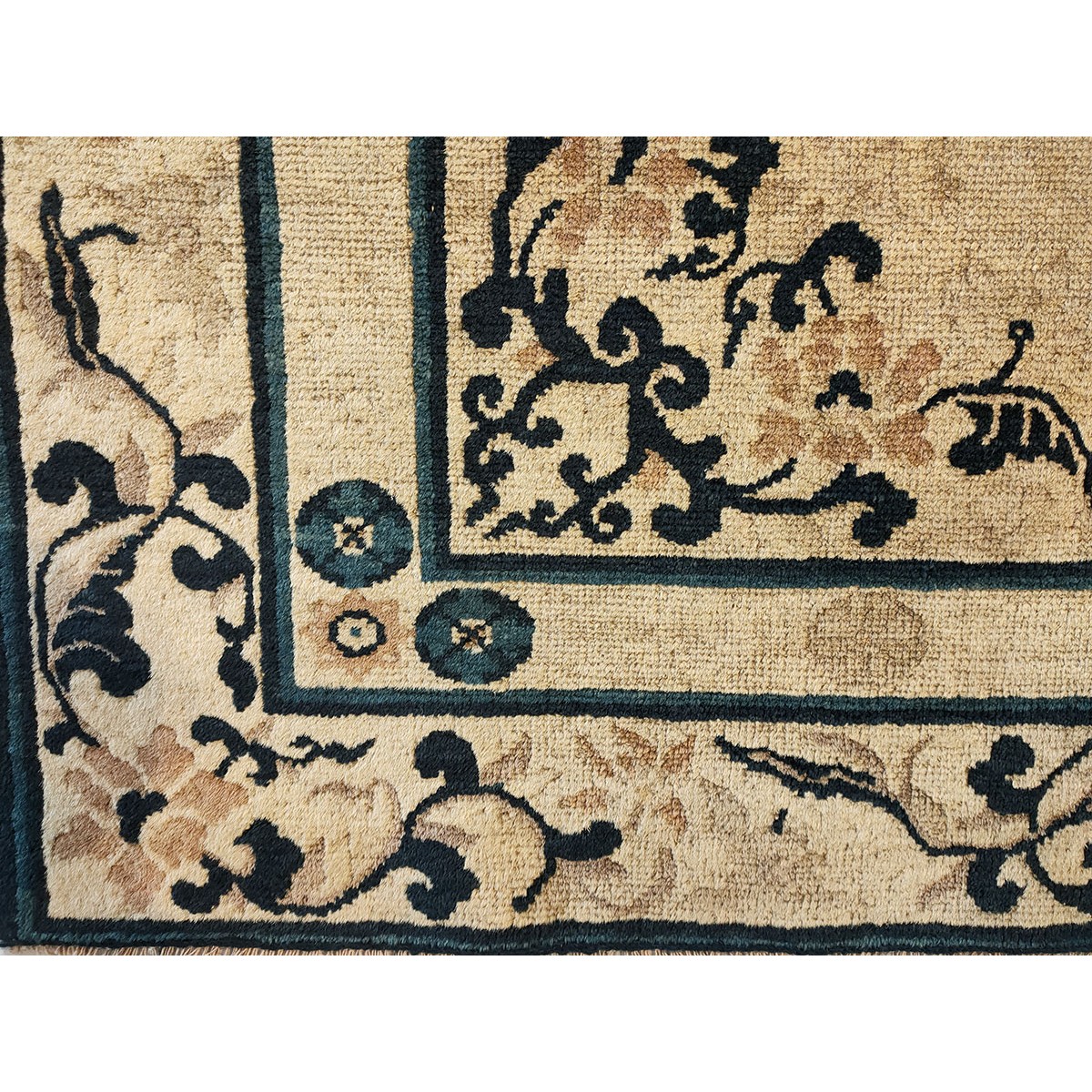 The commercial Peking carpet is a later 19th century development, begun by importing weaves from Ningshia (see entry) to create and export industry aimed at Western markets. The foundation is cotton and the pile is a good quality carpet wool which takes dyes particularly well. The neat medium weave is in Persian (asymmetric) knots. Designs are strictly Chinese and the whole motif repertoire of Chinese art is employed. Blue and white is the most popular color combination and red is particularly rare. Sizes tend to 9’ x 12’ and larger, and few small pieces appear. For a short time in the early 1920’s Persian designs were woven to capitalize on the death of new Iranian goods. The industry decimated by the Communist Revolution relocated to the Pearl River area. There is a good supply of antique carpets at reasonable prices.