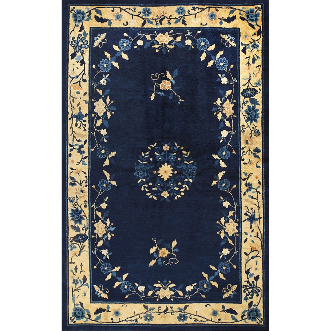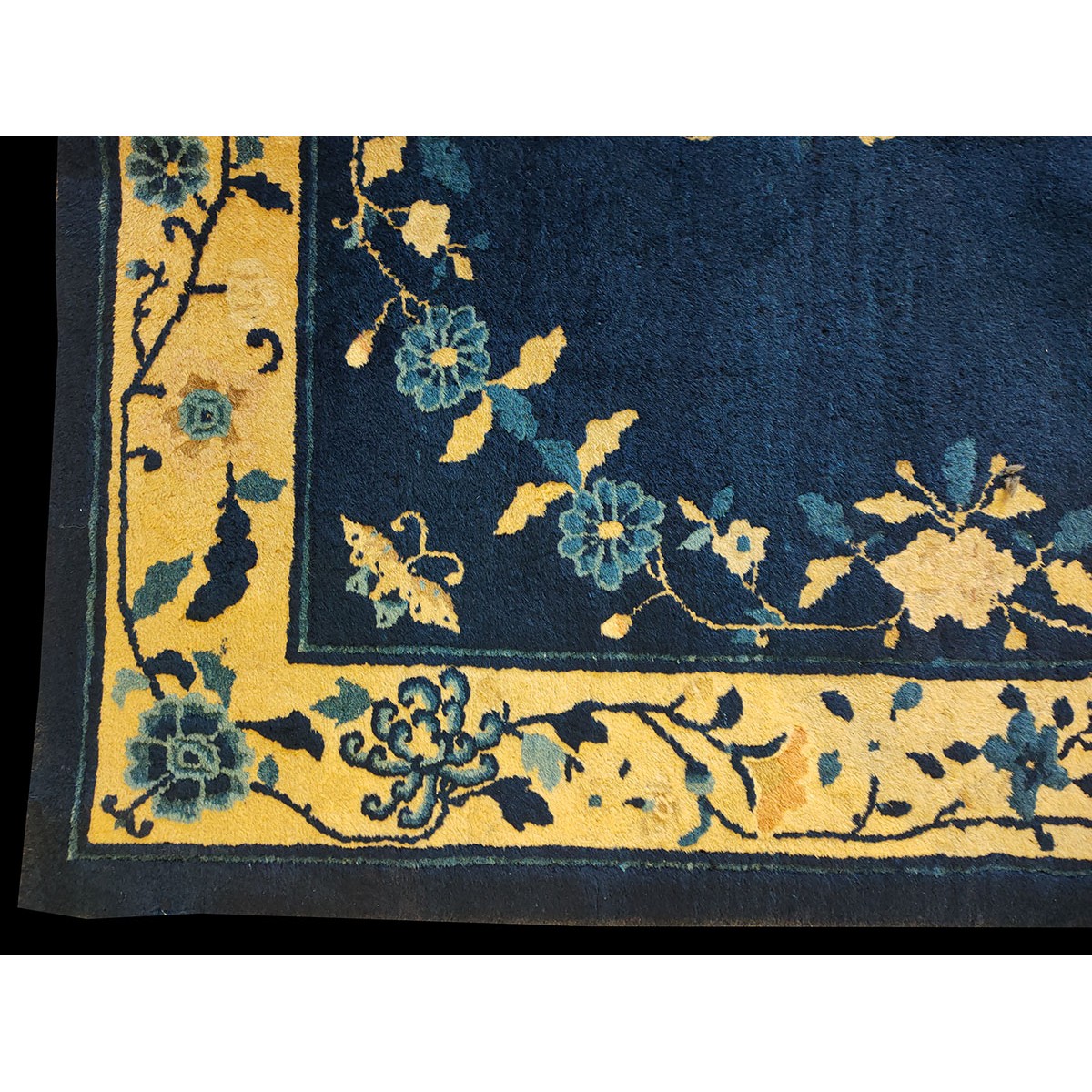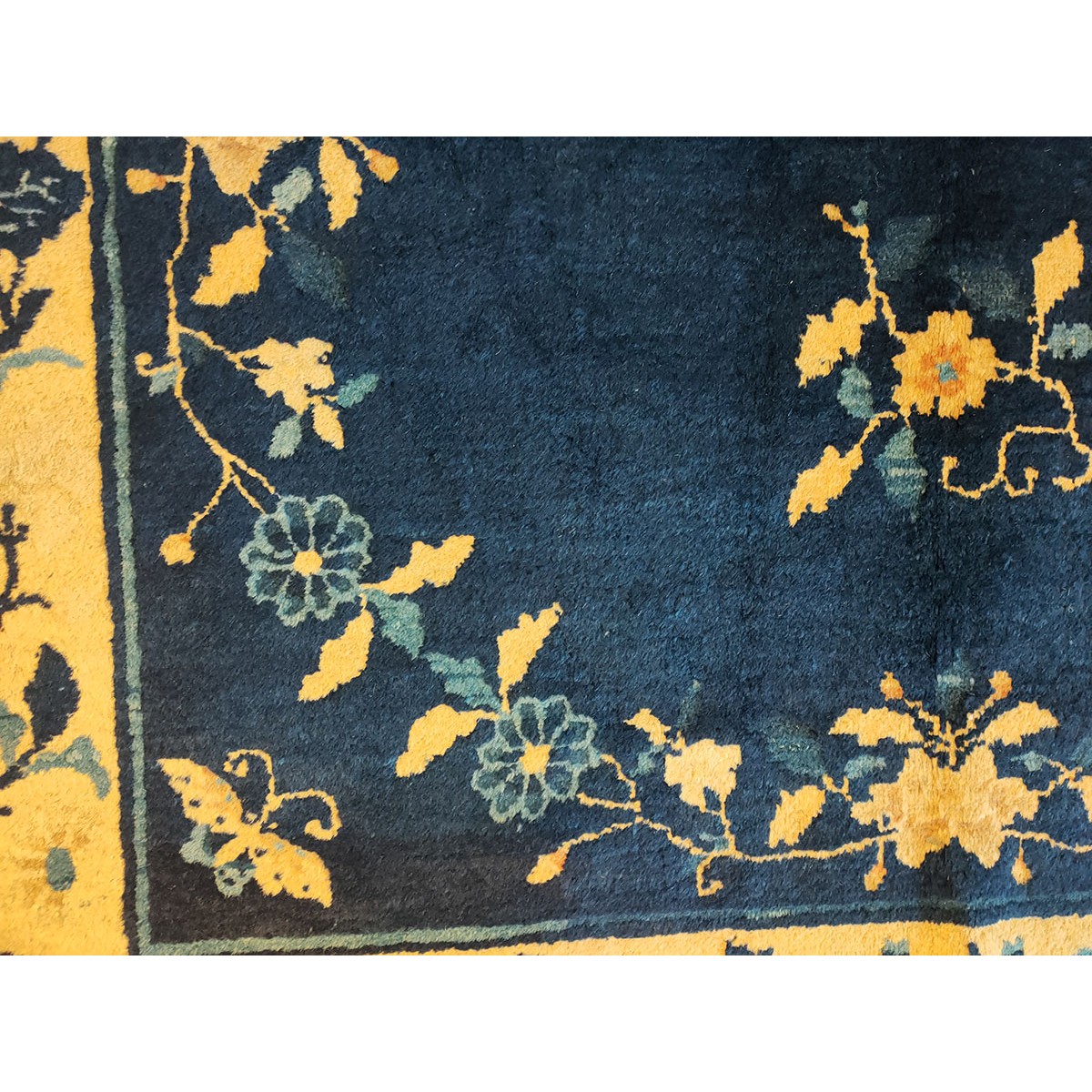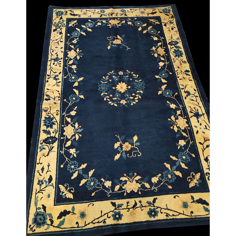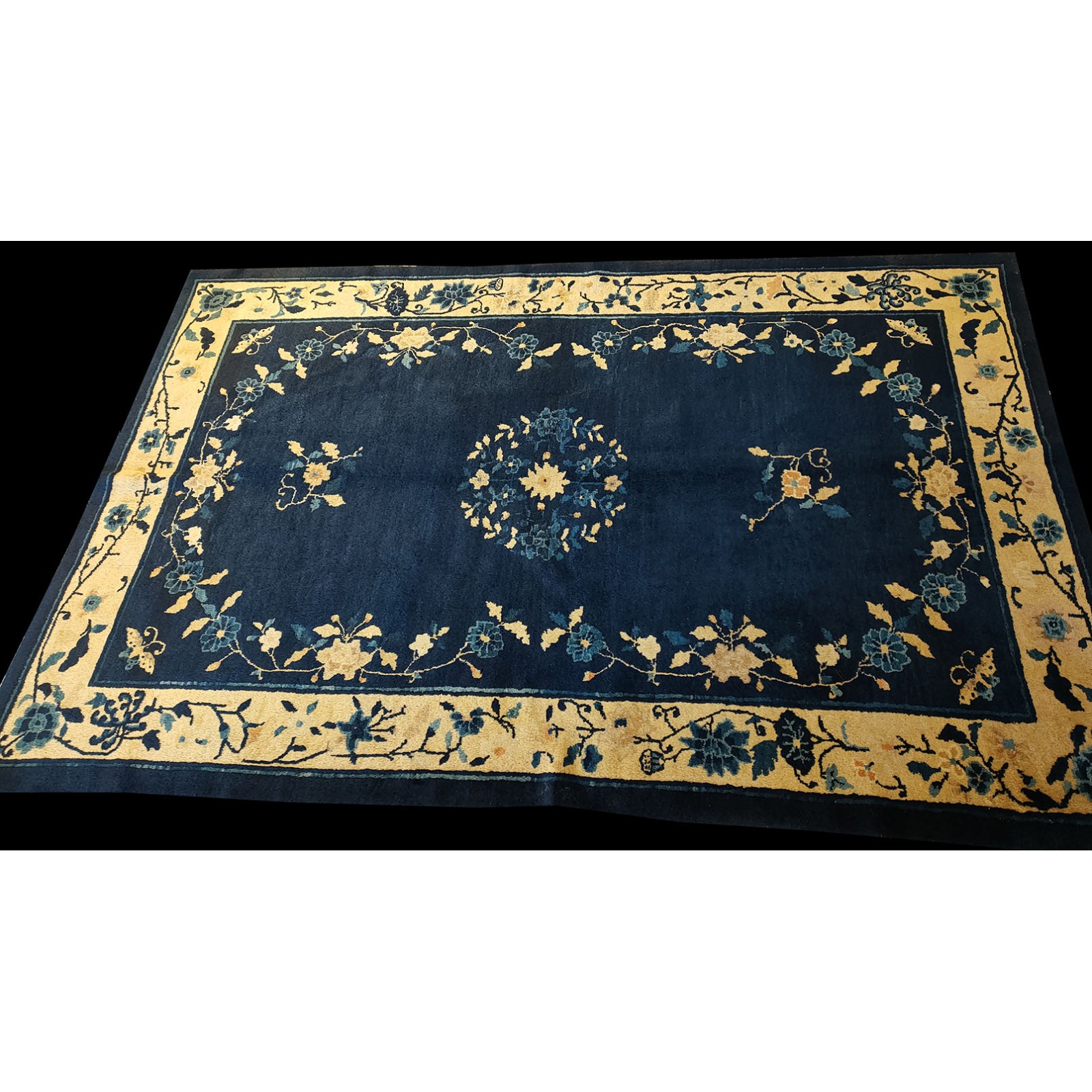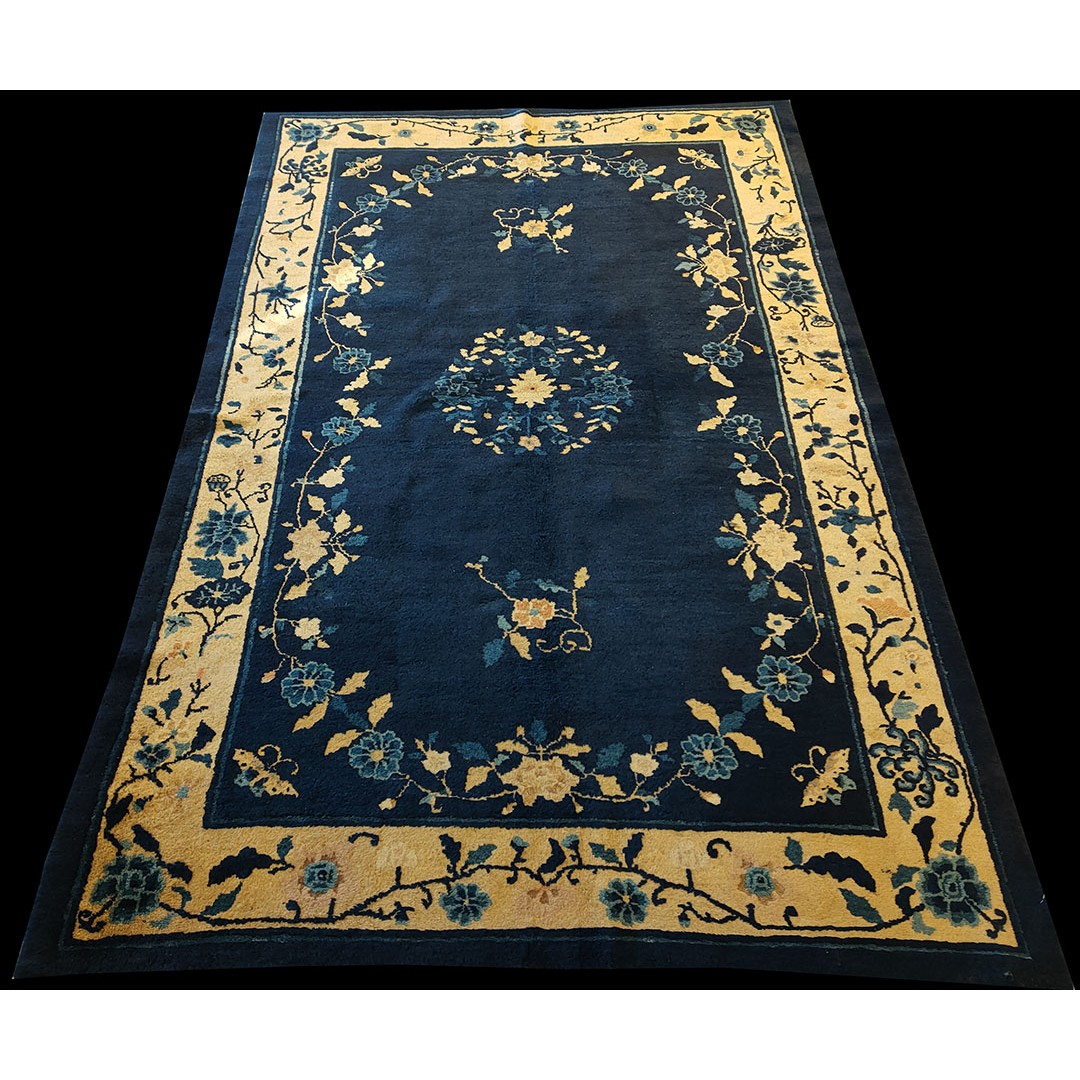 DescriptionChineseCarpets made in China proper. See entries Ningshia, Peking, Art Deco. Chinese - PekingThe commercial Peking carpet is a later 19th century development, begun by importing weaves from Ningshia (see entry) to create and export industry aimed at Western markets. The foundation is cotton and the pile is a good quality carpet wool which takes dyes particularly well. The neat medium weave is in Persian (asymmetric) knots. Designs are strictly Chinese and the whole motif repertoire of Chinese art is employed. Blue and white is the most popular color combination and red is particularly rare. Sizes tend to 9 x 12 and larger, and few small pieces appear. For a short time in the early 1920s Persian designs were woven to capitalize on the death of new Iranian goods. The industry decimated by the Communist Revolution relocated to the Pearl River area. There is a good supply of antique carpets at reasonable prices. | |