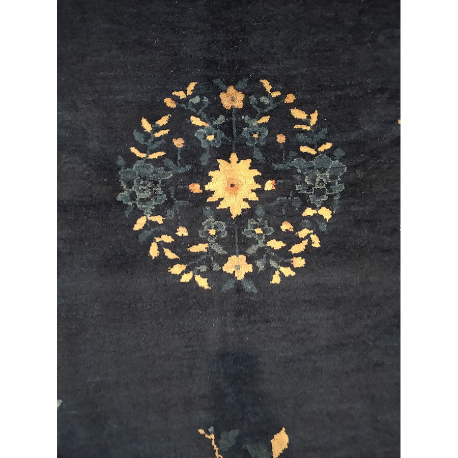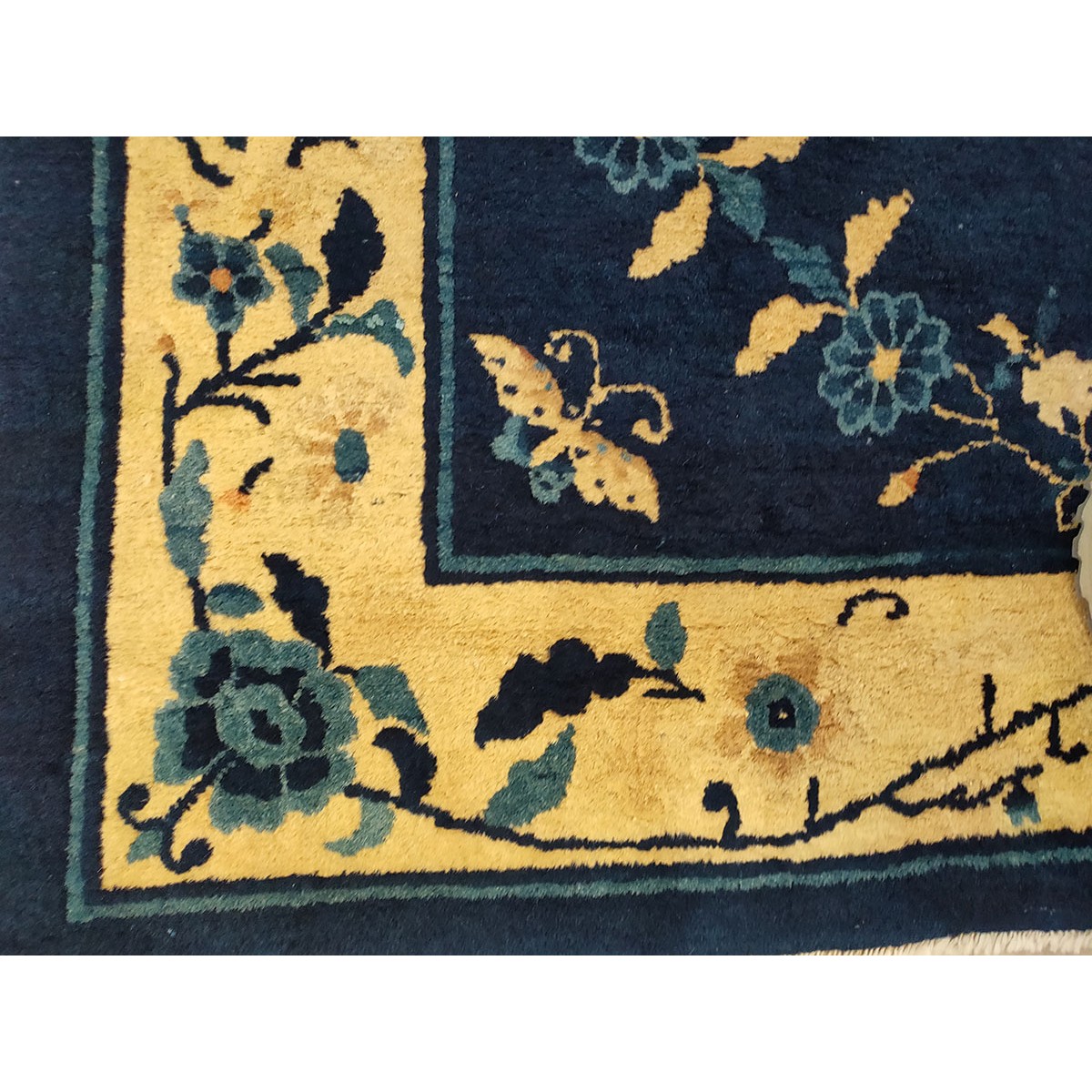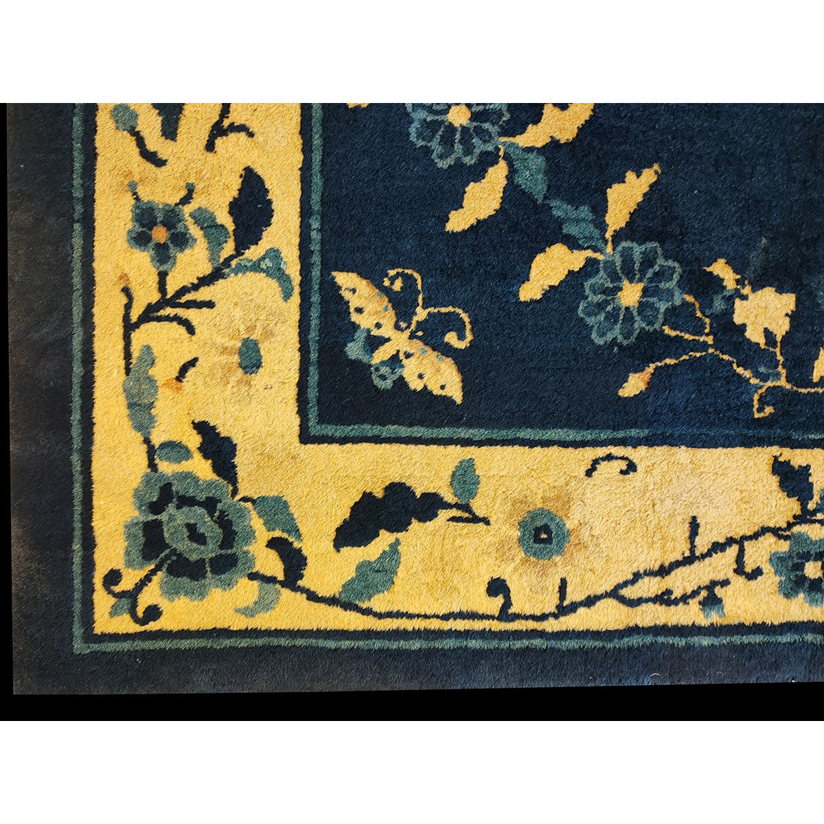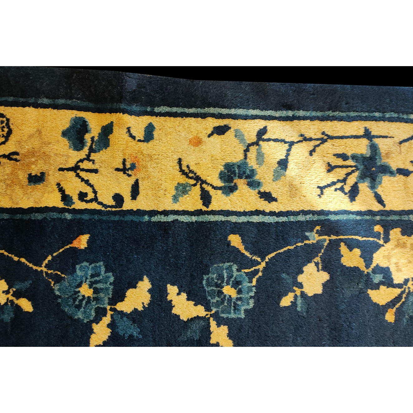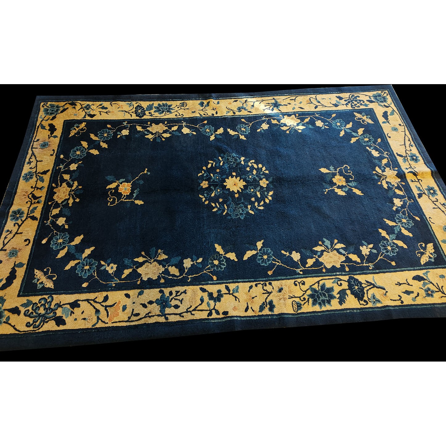 DescriptionChineseCarpets made in China proper. See entries Ningshia, Peking, Art Deco. Chinese - PekingThe commercial Peking carpet is a later 19th century development, begun by importing weaves from Ningshia (see entry) to create and export industry aimed at Western markets. The foundation is cotton and the pile is a good quality carpet wool which takes dyes particularly well. The neat medium weave is in Persian (asymmetric) knots. Designs are strictly Chinese and the whole motif repertoire of Chinese art is employed. Blue and white is the most popular color combination and red is particularly rare. Sizes tend to 9 x 12 and larger, and few small pieces appear. For a short time in the early 1920s Persian designs were woven to capitalize on the death of new Iranian goods. The industry decimated by the Communist Revolution relocated to the Pearl River area. There is a good supply of antique carpets at reasonable prices. | |