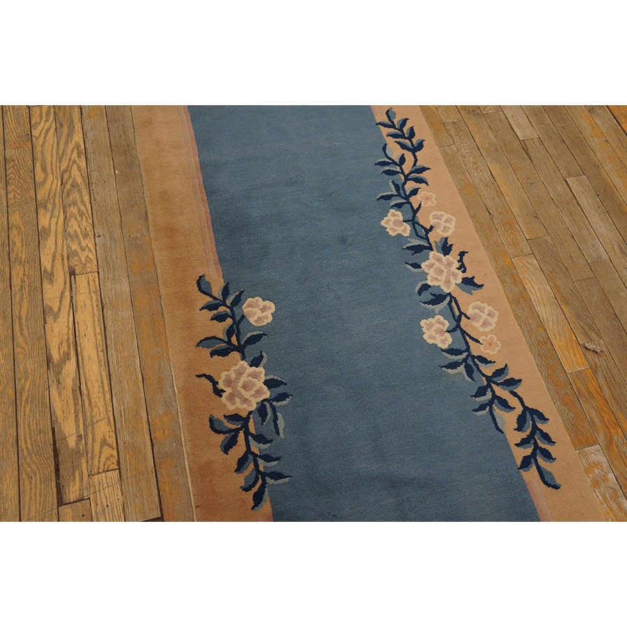 DescriptionChineseCarpets made in China proper. See entries Ningshia, Peking, Art Deco. Chinese - PekingThe commercial Peking carpet is a later 19th century development, begun by importing weaves from Ningshia (see entry) to create and export industry aimed at Western markets. The foundation is cotton and the pile is a good quality carpet wool which takes dyes particularly well. The neat medium weave is in Persian (asymmetric) knots. Designs are strictly Chinese and the whole motif repertoire of Chinese art is employed. Blue and white is the most popular color combination and red is particularly rare. Sizes tend to 9 x 12 and larger, and few small pieces appear. For a short time in the early 1920s Persian designs were woven to capitalize on the death of new Iranian goods. The industry decimated by the Communist Revolution relocated to the Pearl River area. There is a good supply of antique carpets at reasonable prices. | |