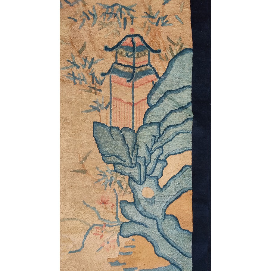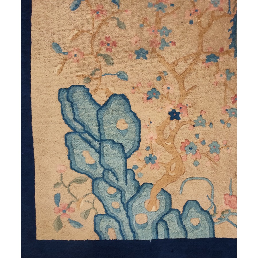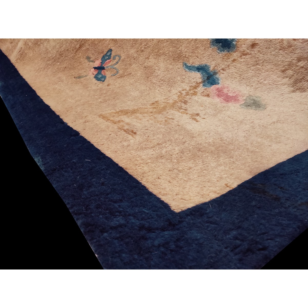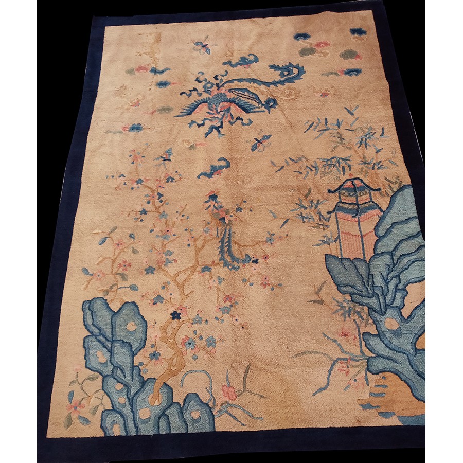 DescriptionChineseCarpets made in China proper. See entries Ningshia, Peking, Art Deco. Chinese - PekingThe commercial Peking carpet is a later 19th century development, begun by importing weaves from Ningshia (see entry) to create and export industry aimed at Western markets. The foundation is cotton and the pile is a good quality carpet wool which takes dyes particularly well. The neat medium weave is in Persian (asymmetric) knots. Designs are strictly Chinese and the whole motif repertoire of Chinese art is employed. Blue and white is the most popular color combination and red is particularly rare. Sizes tend to 9 x 12 and larger, and few small pieces appear. For a short time in the early 1920s Persian designs were woven to capitalize on the death of new Iranian goods. The industry decimated by the Communist Revolution relocated to the Pearl River area. There is a good supply of antique carpets at reasonable prices. | |