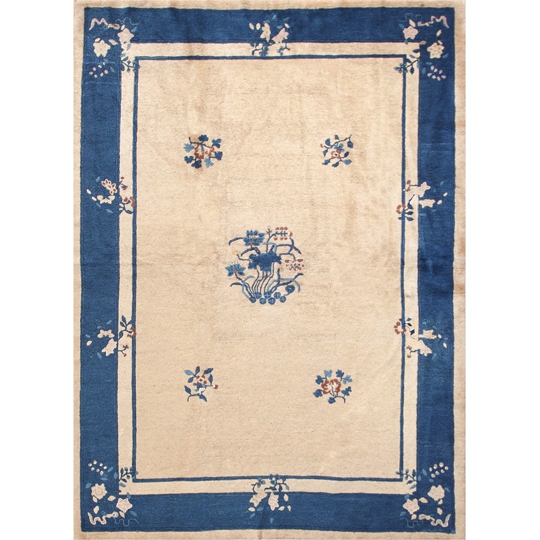 DescriptionChineseCarpets made in China proper. See entries Ningshia, Peking, Art Deco. Chinese - PekingThe commercial Peking carpet is a later 19th century development, begun by importing weaves from Ningshia (see entry) to create and export industry aimed at Western markets. The foundation is cotton and the pile is a good quality carpet wool which takes dyes particularly well. The neat medium weave is in Persian (asymmetric) knots. Designs are strictly Chinese and the whole motif repertoire of Chinese art is employed. Blue and white is the most popular color combination and red is particularly rare. Sizes tend to 9 x 12 and larger, and few small pieces appear. For a short time in the early 1920s Persian designs were woven to capitalize on the death of new Iranian goods. The industry decimated by the Communist Revolution relocated to the Pearl River area. There is a good supply of antique carpets at reasonable prices. | |