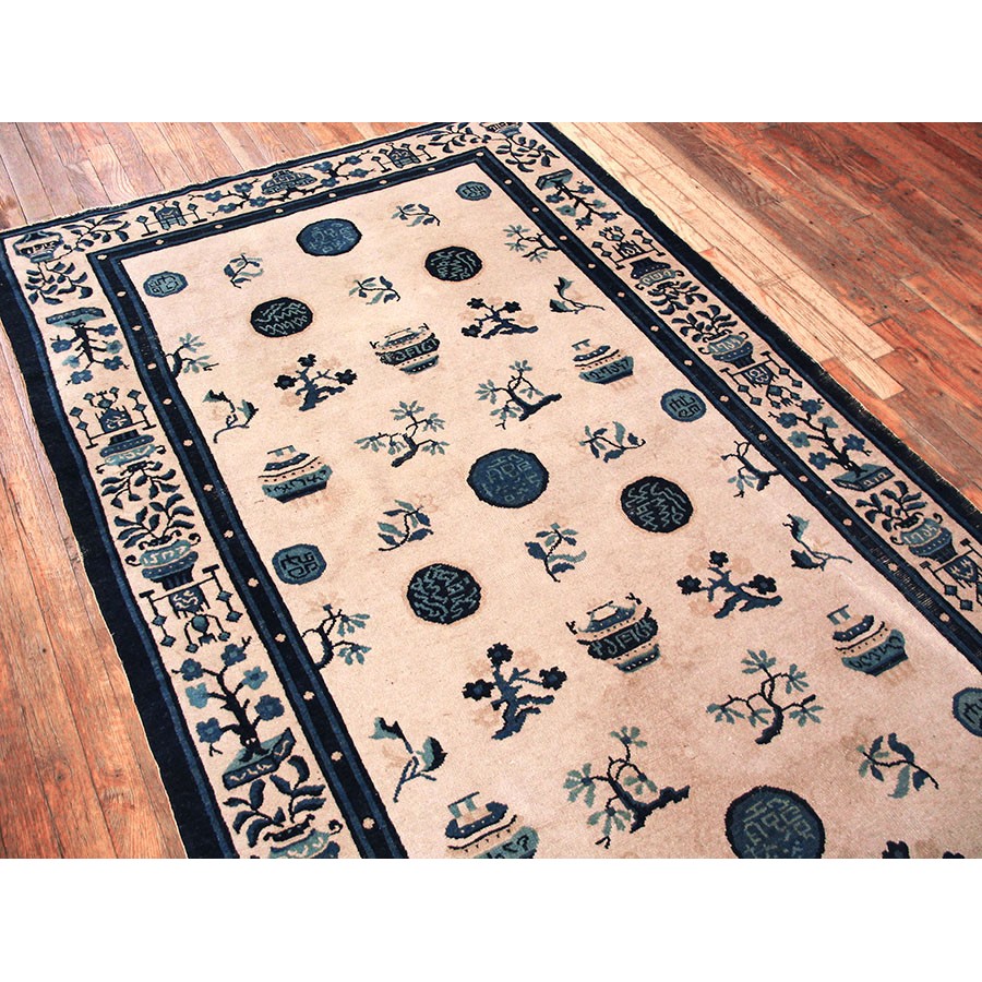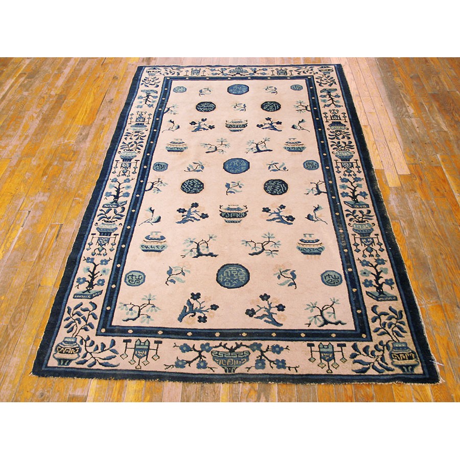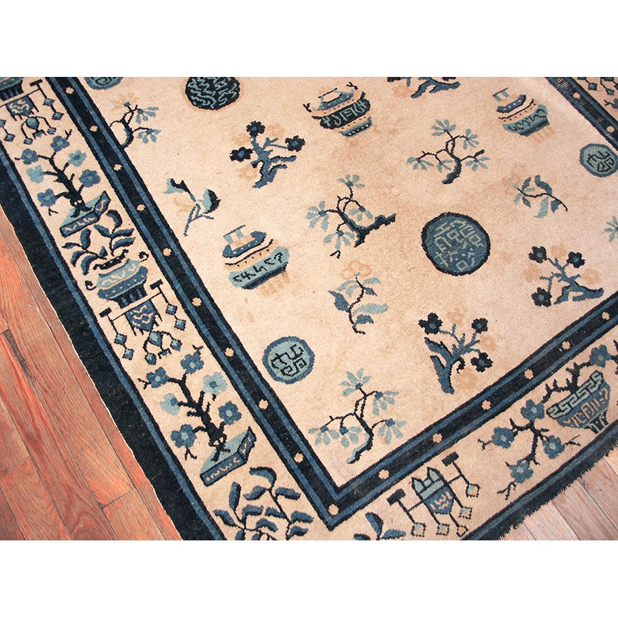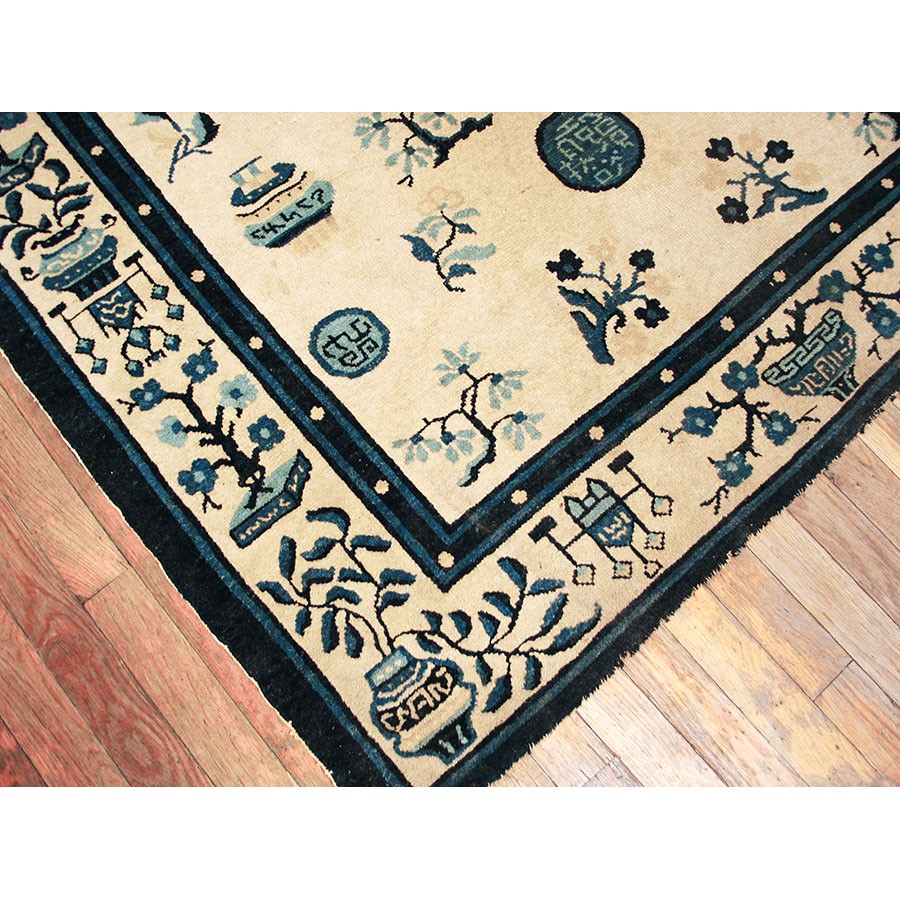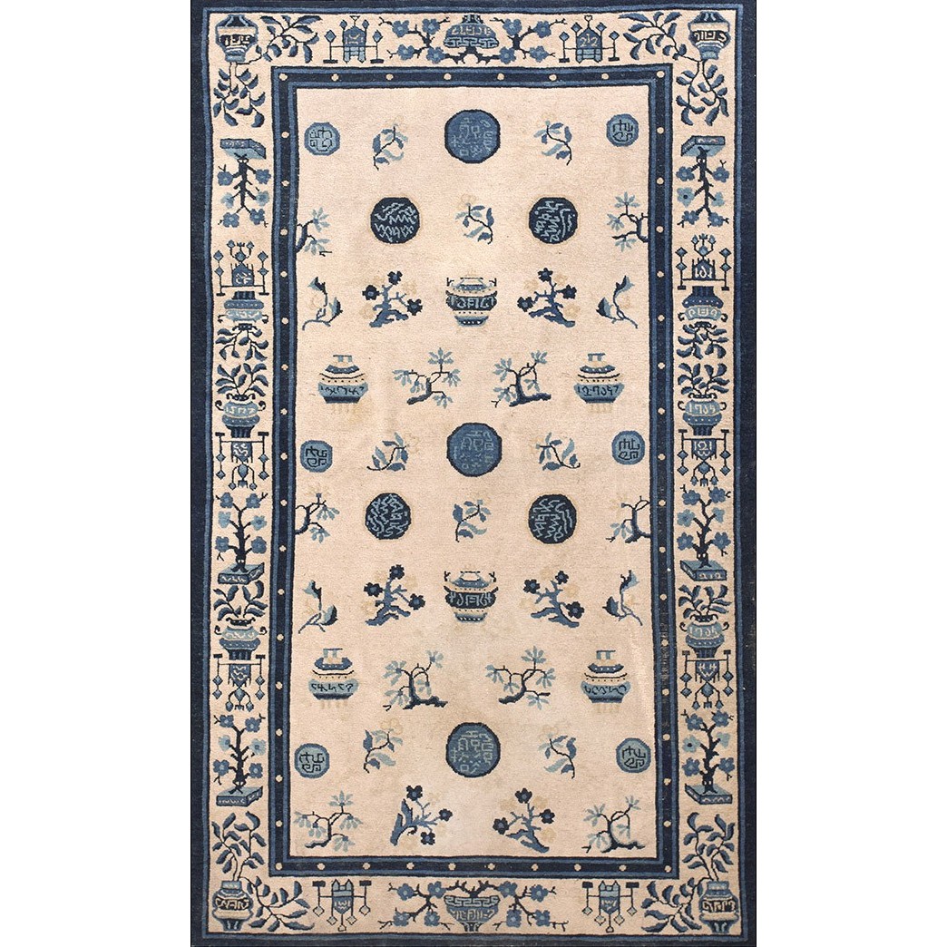 DescriptionChineseCarpets made in China proper. See entries Ningshia, Peking, Art Deco. Chinese - PekingThe commercial Peking carpet is a later 19th century development, begun by importing weaves from Ningshia (see entry) to create and export industry aimed at Western markets. The foundation is cotton and the pile is a good quality carpet wool which takes dyes particularly well. The neat medium weave is in Persian (asymmetric) knots. Designs are strictly Chinese and the whole motif repertoire of Chinese art is employed. Blue and white is the most popular color combination and red is particularly rare. Sizes tend to 9 x 12 and larger, and few small pieces appear. For a short time in the early 1920s Persian designs were woven to capitalize on the death of new Iranian goods. The industry decimated by the Communist Revolution relocated to the Pearl River area. There is a good supply of antique carpets at reasonable prices. | |