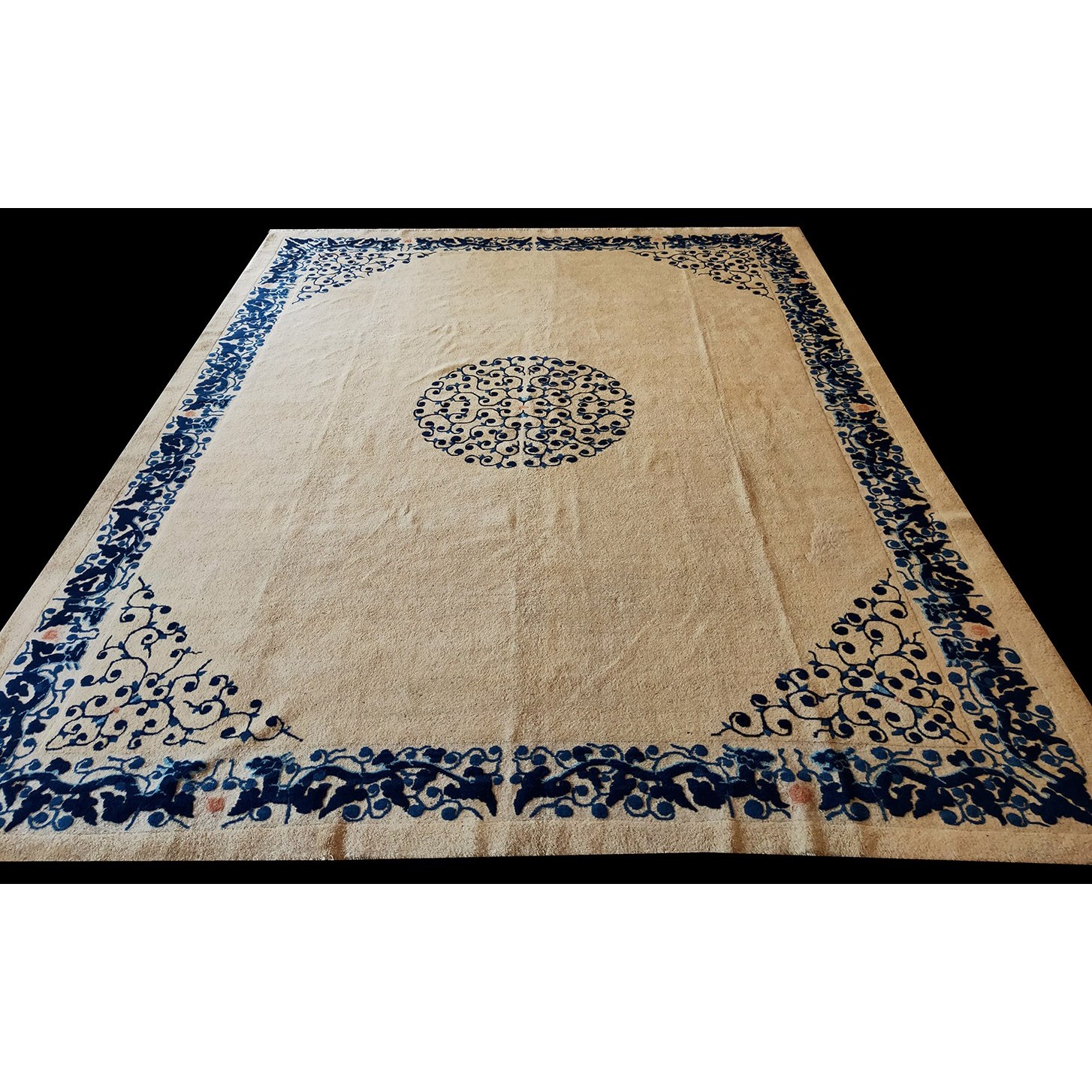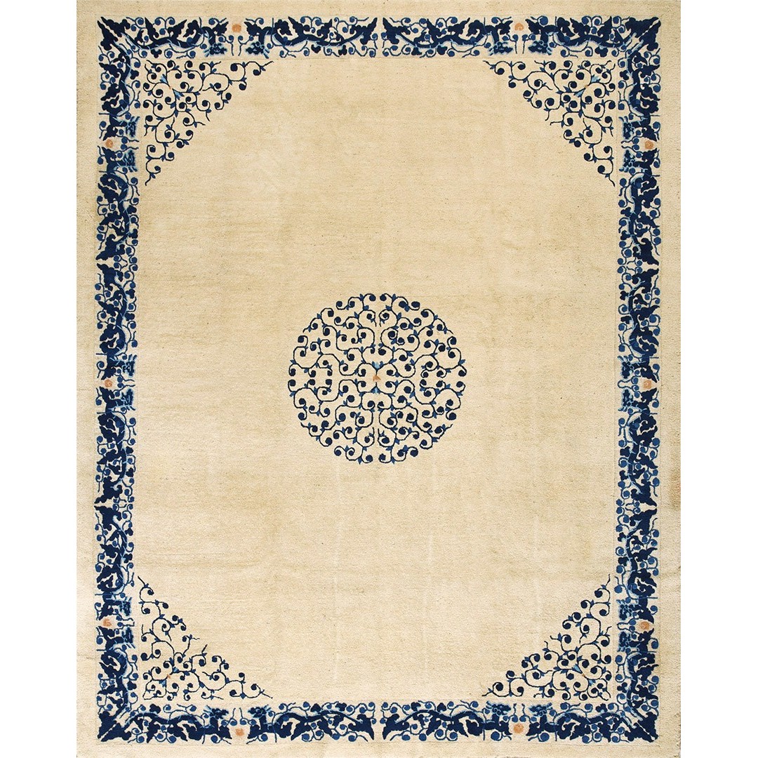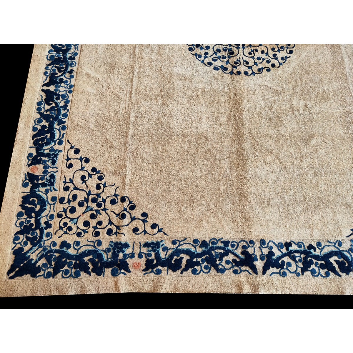 DescriptionChineseCarpets made in China proper. See entries Ningshia, Peking, Art Deco. Chinese - PekingThe commercial Peking carpet is a later 19th century development, begun by importing weaves from Ningshia (see entry) to create and export industry aimed at Western markets. The foundation is cotton and the pile is a good quality carpet wool which takes dyes particularly well. The neat medium weave is in Persian (asymmetric) knots. Designs are strictly Chinese and the whole motif repertoire of Chinese art is employed. Blue and white is the most popular color combination and red is particularly rare. Sizes tend to 9 x 12 and larger, and few small pieces appear. For a short time in the early 1920s Persian designs were woven to capitalize on the death of new Iranian goods. The industry decimated by the Communist Revolution relocated to the Pearl River area. There is a good supply of antique carpets at reasonable prices. | |