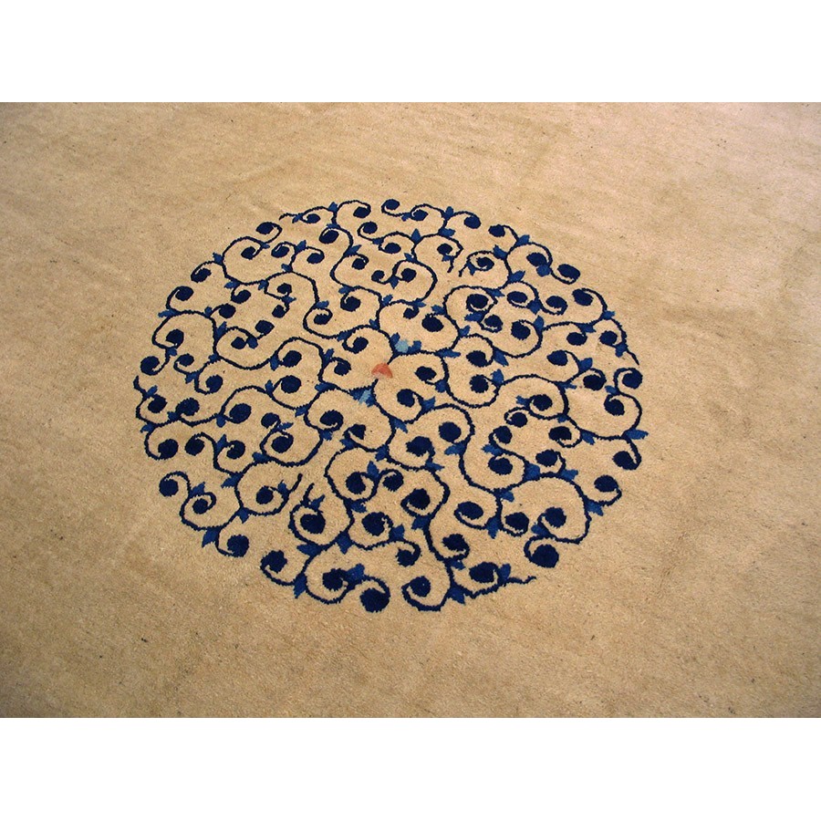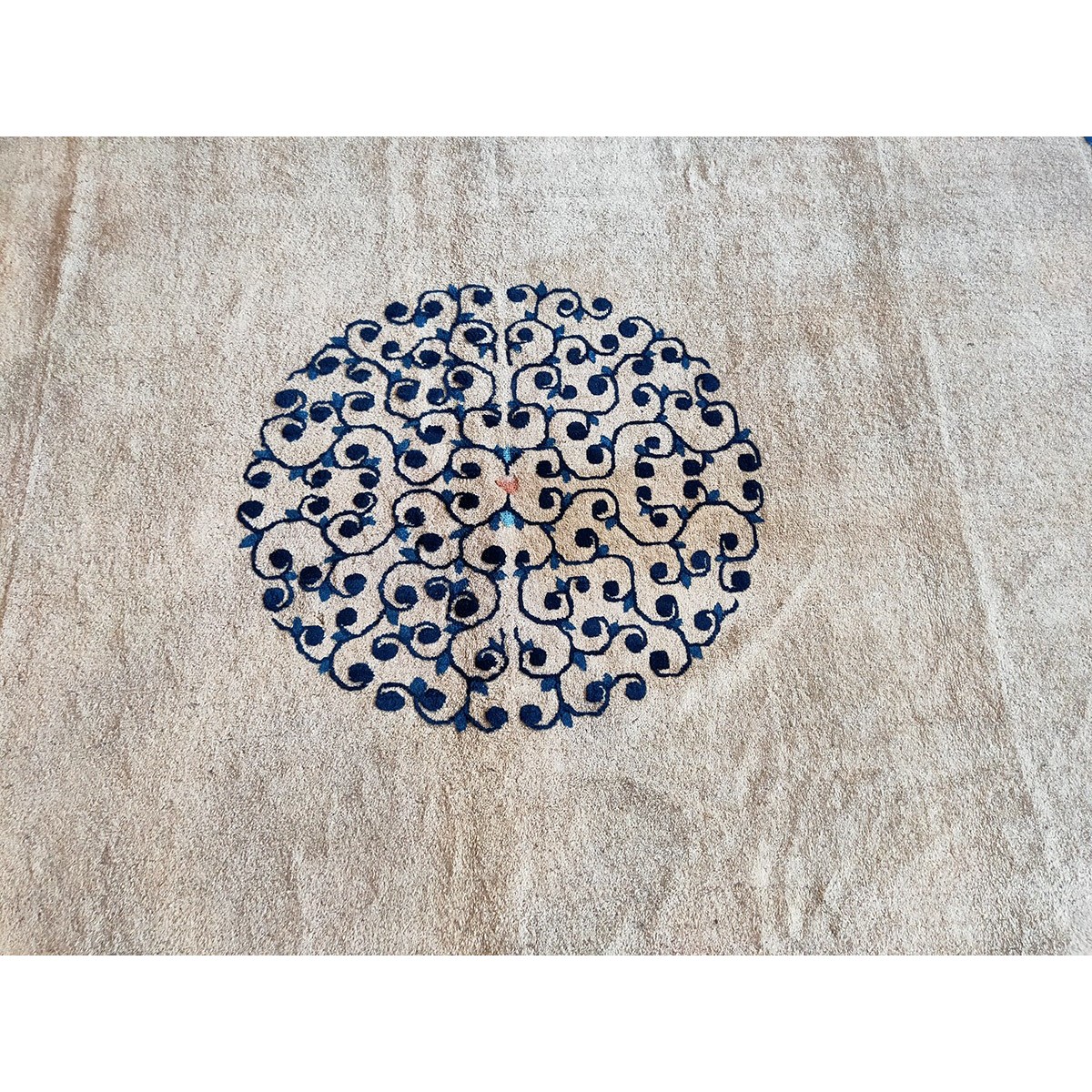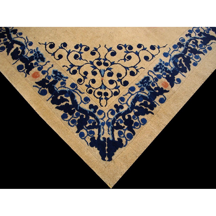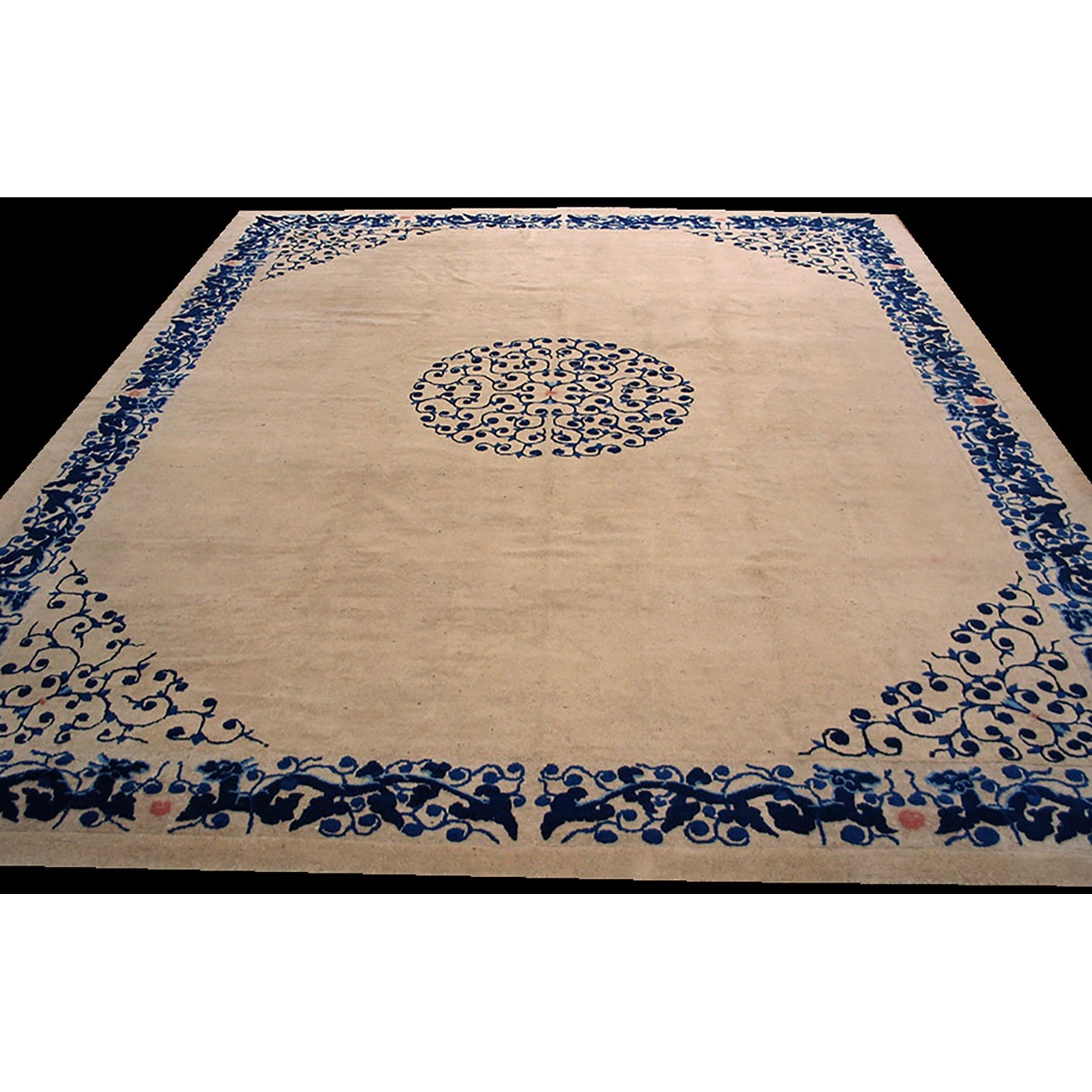 DescriptionChineseCarpets made in China proper. See entries Ningshia, Peking, Art Deco. Chinese - PekingThe commercial Peking carpet is a later 19th century development, begun by importing weaves from Ningshia (see entry) to create and export industry aimed at Western markets. The foundation is cotton and the pile is a good quality carpet wool which takes dyes particularly well. The neat medium weave is in Persian (asymmetric) knots. Designs are strictly Chinese and the whole motif repertoire of Chinese art is employed. Blue and white is the most popular color combination and red is particularly rare. Sizes tend to 9 x 12 and larger, and few small pieces appear. For a short time in the early 1920s Persian designs were woven to capitalize on the death of new Iranian goods. The industry decimated by the Communist Revolution relocated to the Pearl River area. There is a good supply of antique carpets at reasonable prices. | |