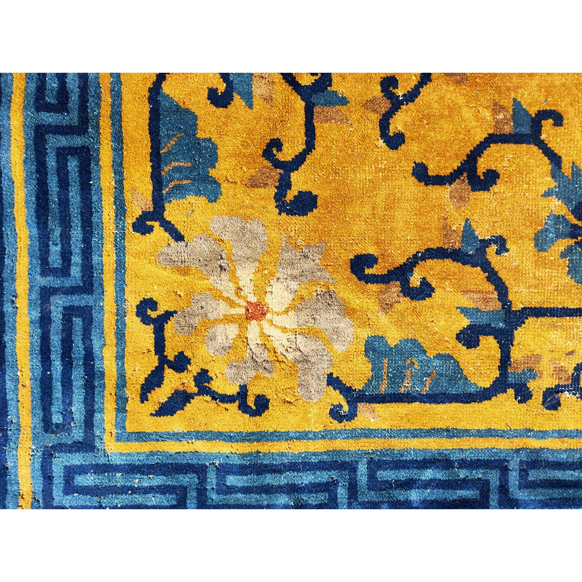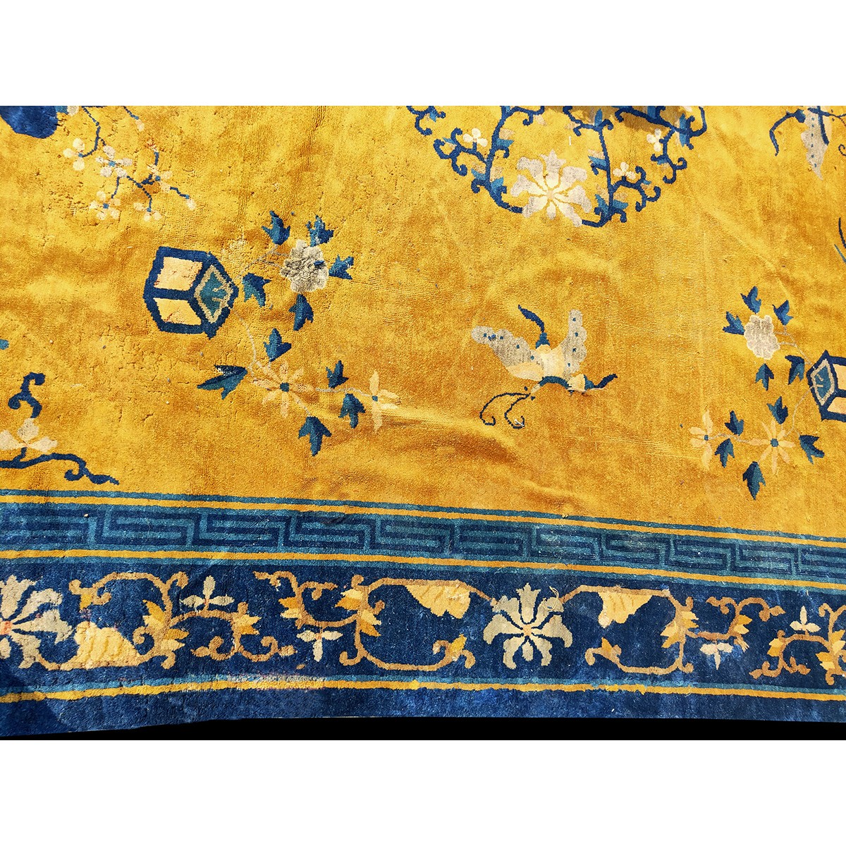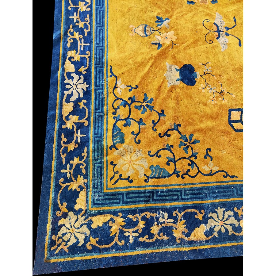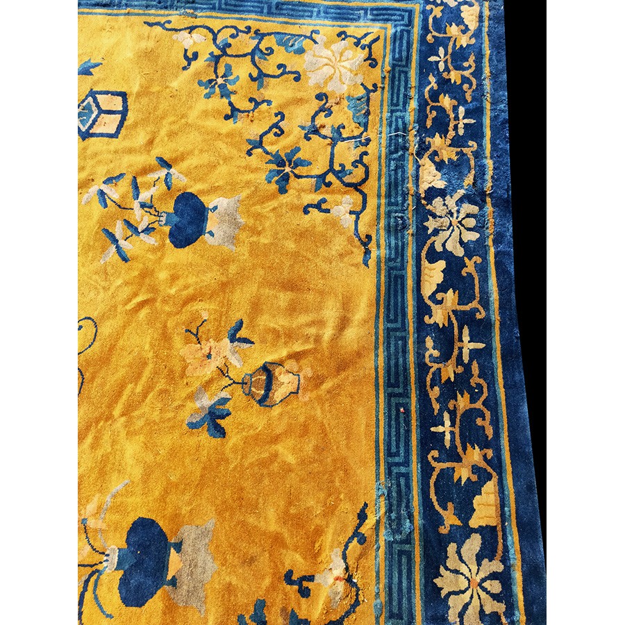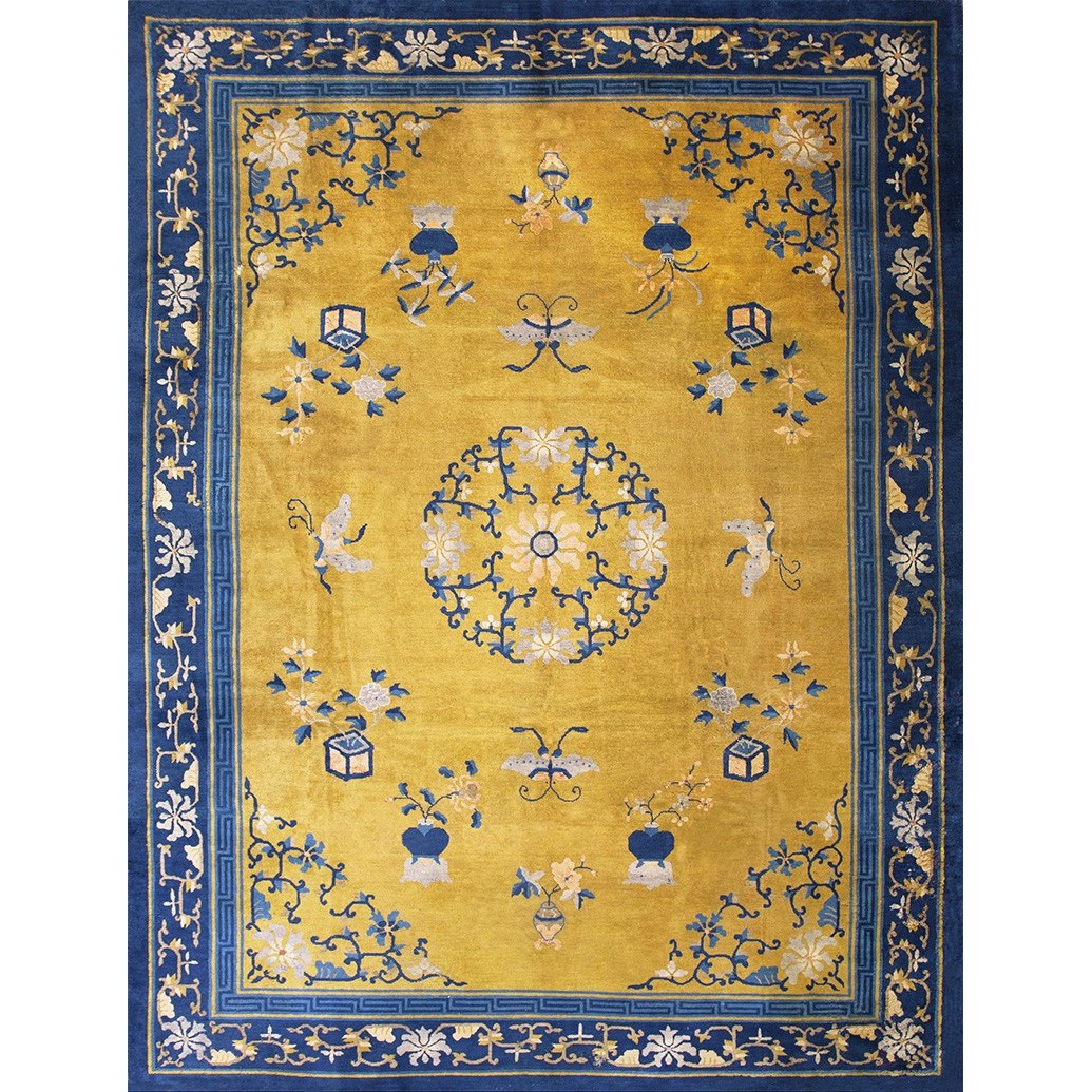 DescriptionChineseCarpets made in China proper. See entries Ningshia, Peking, Art Deco. Chinese - PekingThe commercial Peking carpet is a later 19th century development, begun by importing weaves from Ningshia (see entry) to create and export industry aimed at Western markets. The foundation is cotton and the pile is a good quality carpet wool which takes dyes particularly well. The neat medium weave is in Persian (asymmetric) knots. Designs are strictly Chinese and the whole motif repertoire of Chinese art is employed. Blue and white is the most popular color combination and red is particularly rare. Sizes tend to 9 x 12 and larger, and few small pieces appear. For a short time in the early 1920s Persian designs were woven to capitalize on the death of new Iranian goods. The industry decimated by the Communist Revolution relocated to the Pearl River area. There is a good supply of antique carpets at reasonable prices. | |