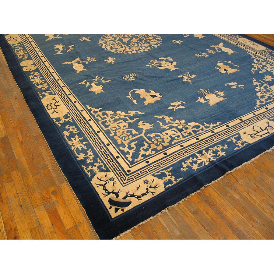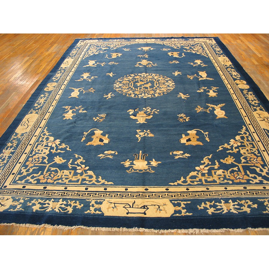 DescriptionChineseCarpets made in China proper. See entries Ningshia, Peking, Art Deco. Chinese - PekingThe commercial Peking carpet is a later 19th century development, begun by importing weaves from Ningshia (see entry) to create and export industry aimed at Western markets. The foundation is cotton and the pile is a good quality carpet wool which takes dyes particularly well. The neat medium weave is in Persian (asymmetric) knots. Designs are strictly Chinese and the whole motif repertoire of Chinese art is employed. Blue and white is the most popular color combination and red is particularly rare. Sizes tend to 9 x 12 and larger, and few small pieces appear. For a short time in the early 1920s Persian designs were woven to capitalize on the death of new Iranian goods. The industry decimated by the Communist Revolution relocated to the Pearl River area. There is a good supply of antique carpets at reasonable prices. | |