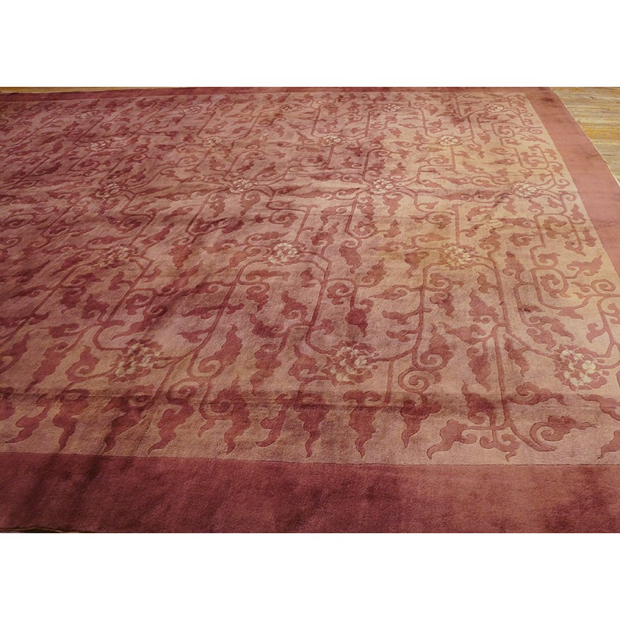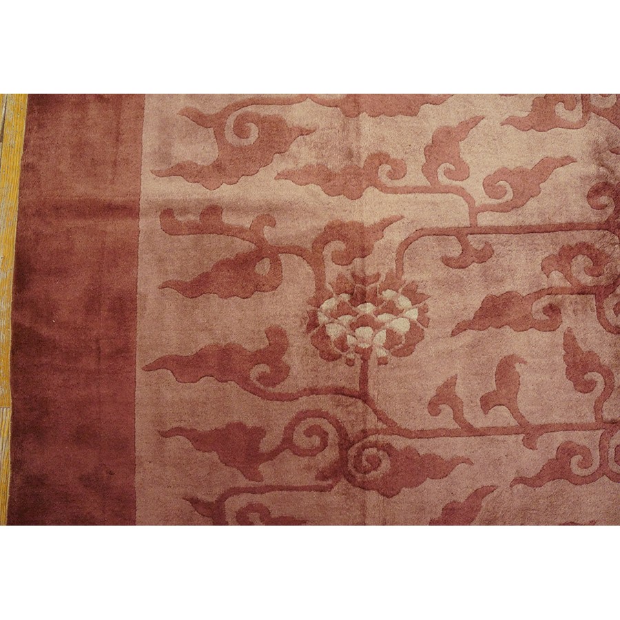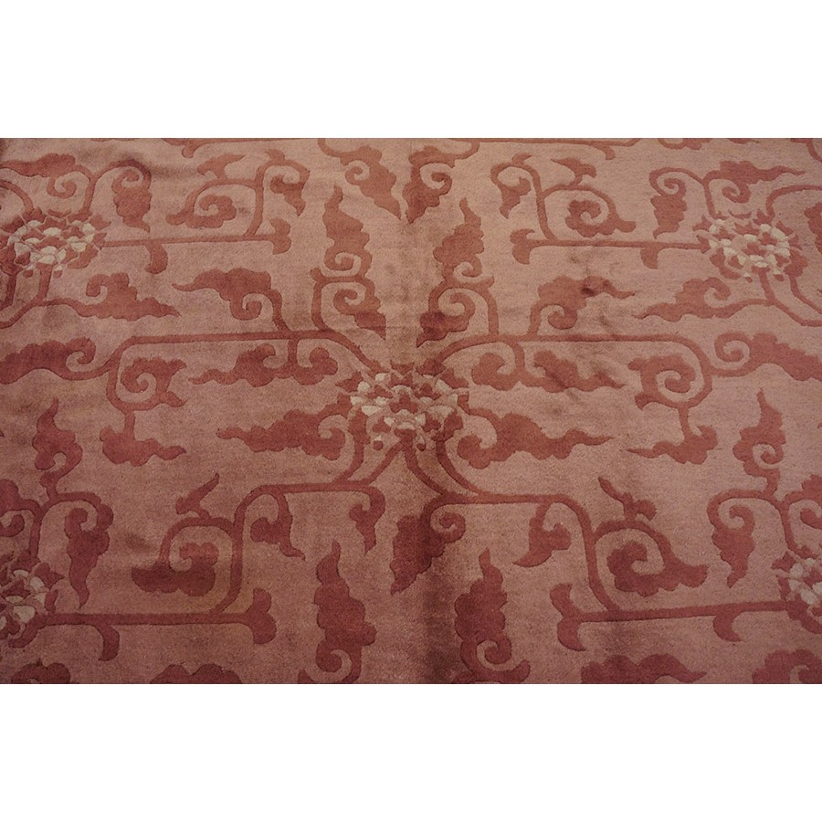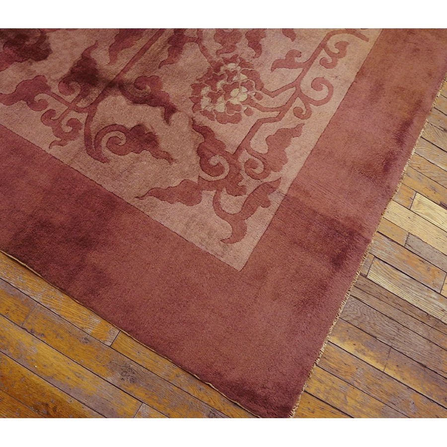DescriptionChineseCarpets made in China proper. See entries Ningshia, Peking, Art Deco. Chinese - PekingThe commercial Peking carpet is a later 19th century development, begun by importing weaves from Ningshia (see entry) to create and export industry aimed at Western markets. The foundation is cotton and the pile is a good quality carpet wool which takes dyes particularly well. The neat medium weave is in Persian (asymmetric) knots. Designs are strictly Chinese and the whole motif repertoire of Chinese art is employed. Blue and white is the most popular color combination and red is particularly rare. Sizes tend to 9 x 12 and larger, and few small pieces appear. For a short time in the early 1920s Persian designs were woven to capitalize on the death of new Iranian goods. The industry decimated by the Communist Revolution relocated to the Pearl River area. There is a good supply of antique carpets at reasonable prices. | |