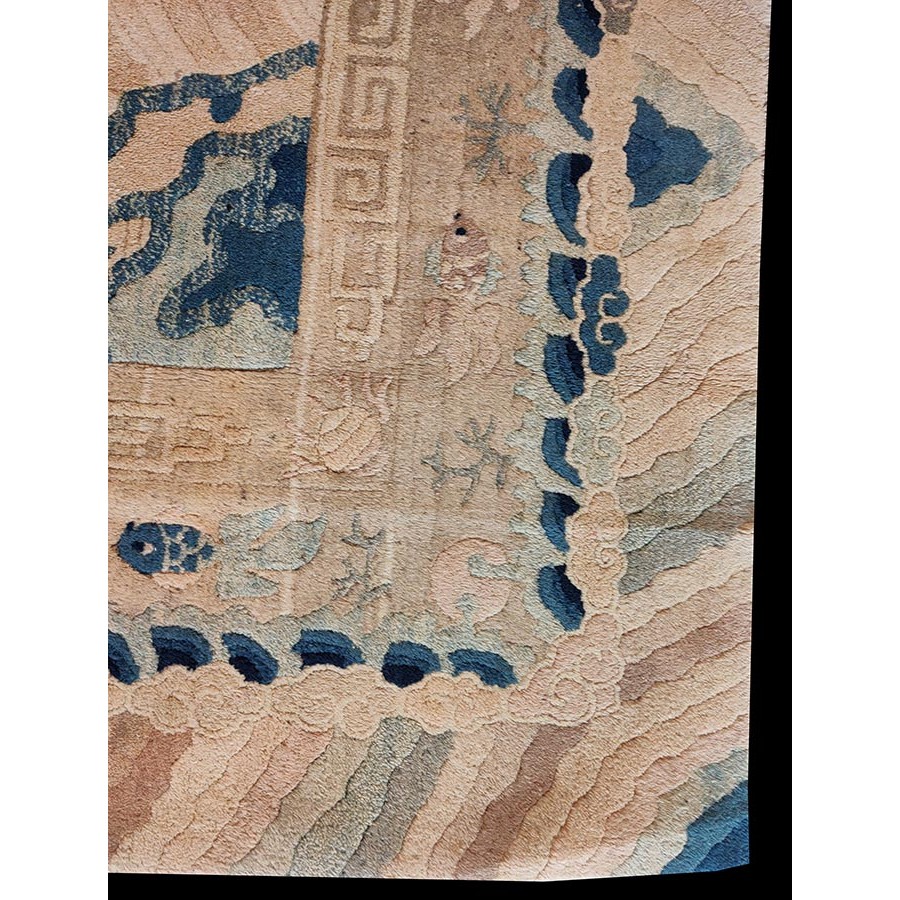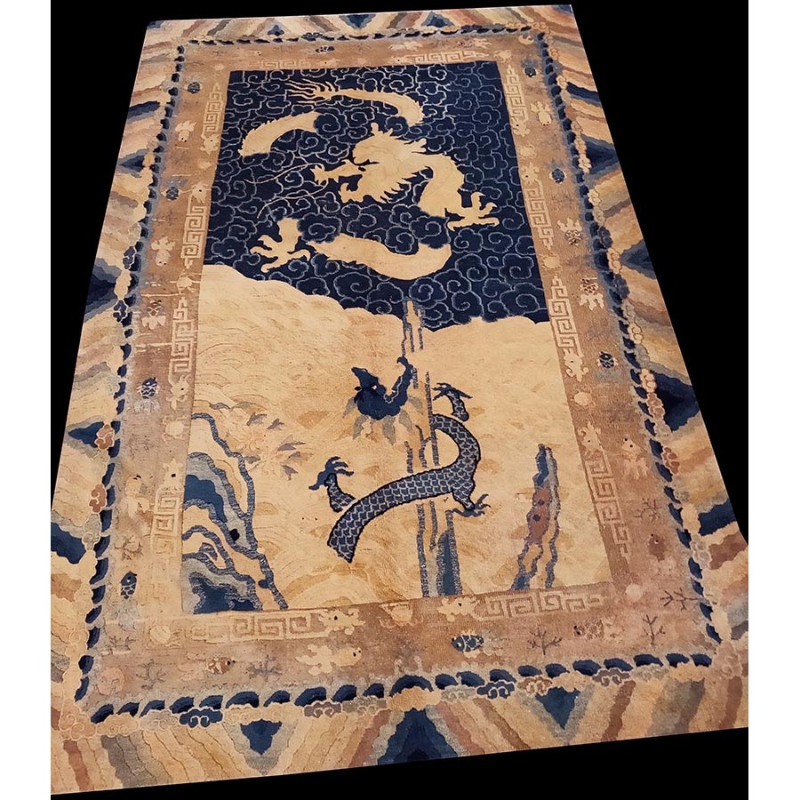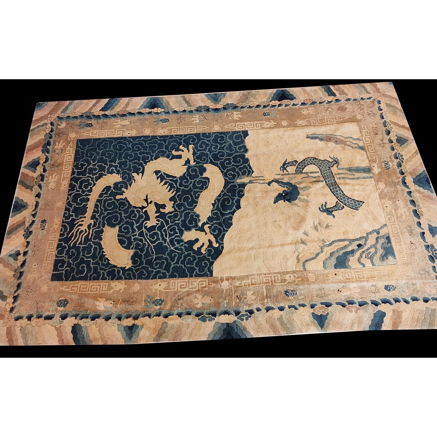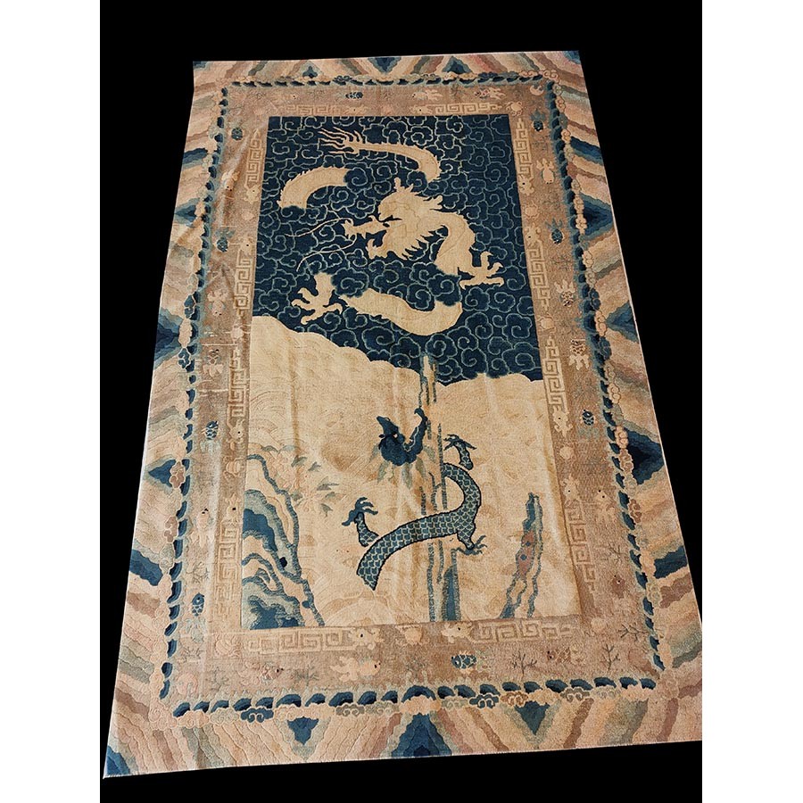 DescriptionChineseCarpets made in China proper. See entries Ningshia, Peking, Art Deco. Chinese - PekingThe commercial Peking carpet is a later 19th century development, begun by importing weaves from Ningshia (see entry) to create and export industry aimed at Western markets. The foundation is cotton and the pile is a good quality carpet wool which takes dyes particularly well. The neat medium weave is in Persian (asymmetric) knots. Designs are strictly Chinese and the whole motif repertoire of Chinese art is employed. Blue and white is the most popular color combination and red is particularly rare. Sizes tend to 9 x 12 and larger, and few small pieces appear. For a short time in the early 1920s Persian designs were woven to capitalize on the death of new Iranian goods. The industry decimated by the Communist Revolution relocated to the Pearl River area. There is a good supply of antique carpets at reasonable prices. | |