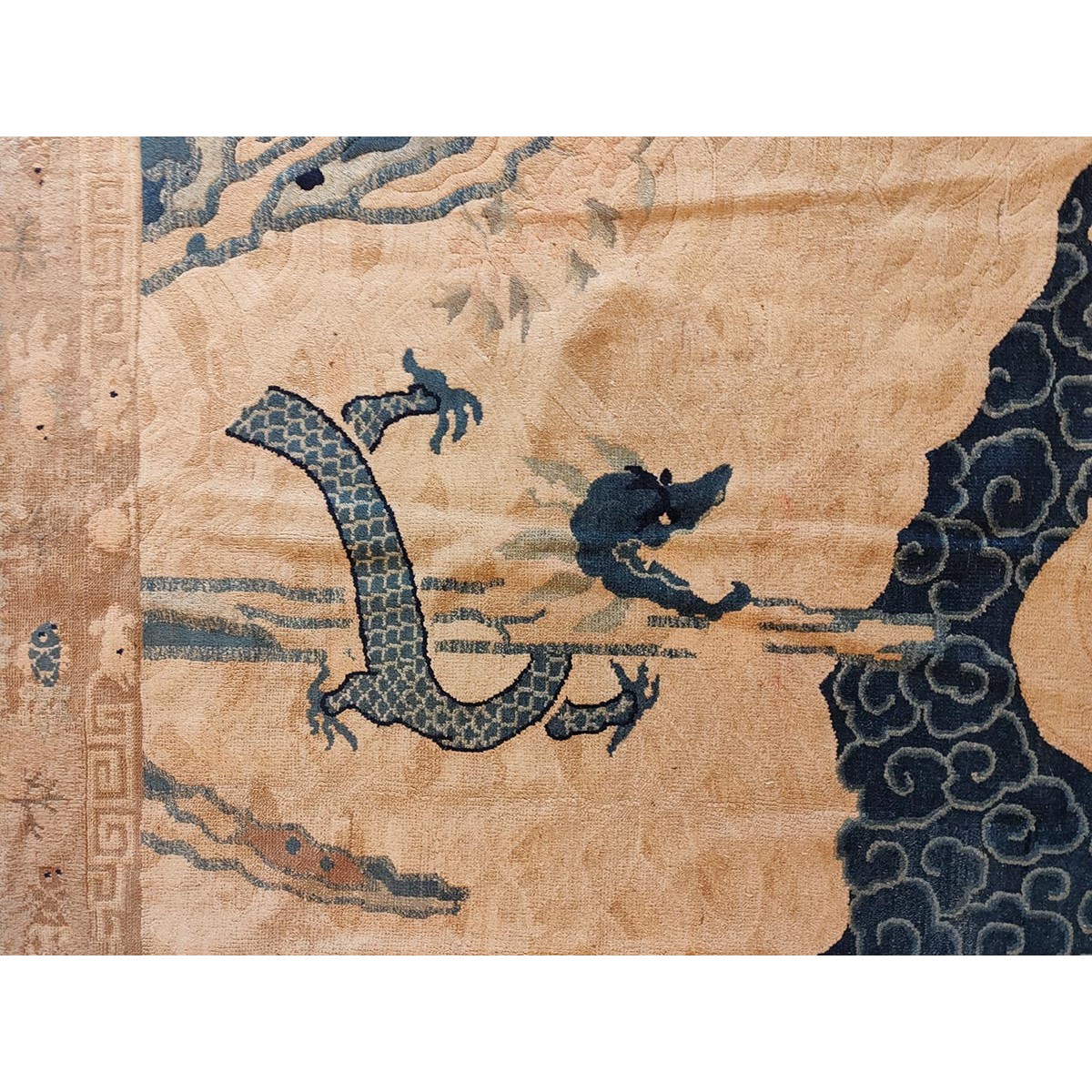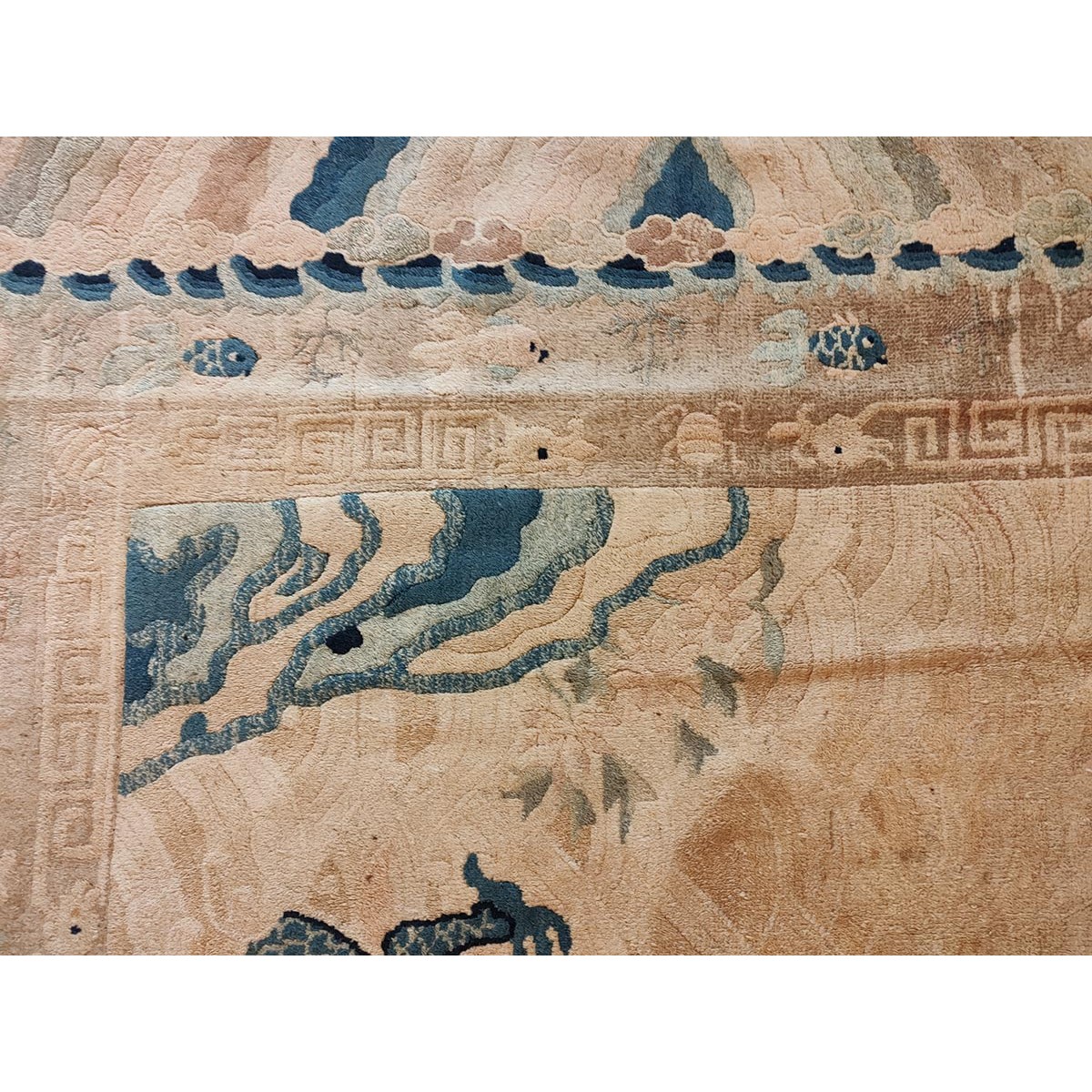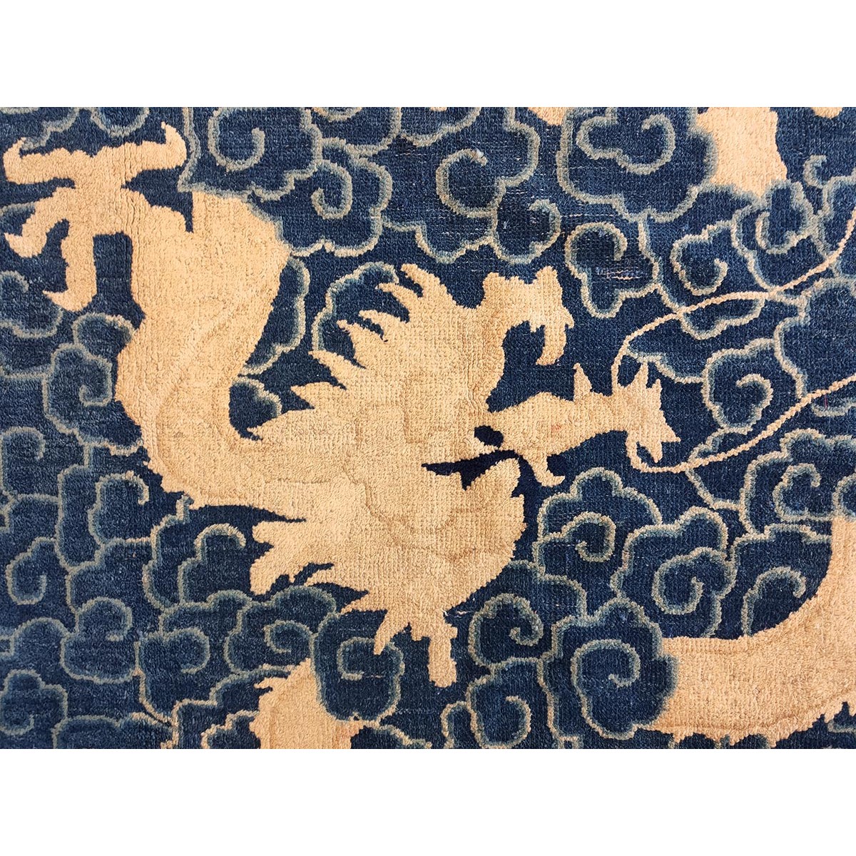DescriptionChineseCarpets made in China proper. See entries Ningshia, Peking, Art Deco. Chinese - PekingThe commercial Peking carpet is a later 19th century development, begun by importing weaves from Ningshia (see entry) to create and export industry aimed at Western markets. The foundation is cotton and the pile is a good quality carpet wool which takes dyes particularly well. The neat medium weave is in Persian (asymmetric) knots. Designs are strictly Chinese and the whole motif repertoire of Chinese art is employed. Blue and white is the most popular color combination and red is particularly rare. Sizes tend to 9 x 12 and larger, and few small pieces appear. For a short time in the early 1920s Persian designs were woven to capitalize on the death of new Iranian goods. The industry decimated by the Communist Revolution relocated to the Pearl River area. There is a good supply of antique carpets at reasonable prices. | |