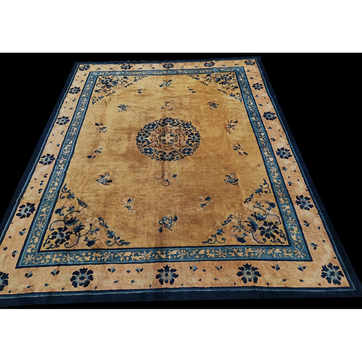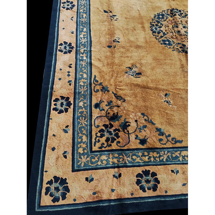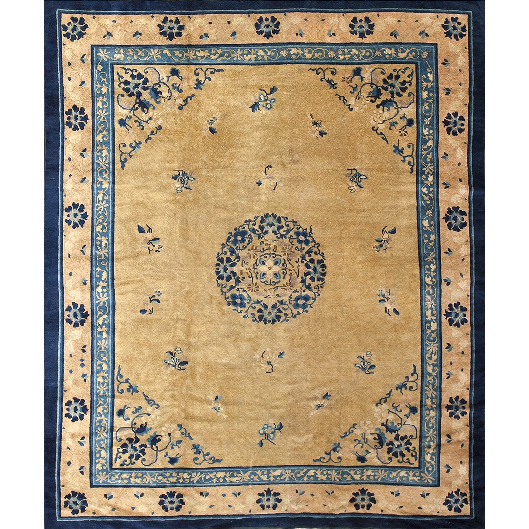 DescriptionChineseCarpets made in China proper. See entries Ningshia, Peking, Art Deco. Chinese - PekingThe commercial Peking carpet is a later 19th century development, begun by importing weaves from Ningshia (see entry) to create and export industry aimed at Western markets. The foundation is cotton and the pile is a good quality carpet wool which takes dyes particularly well. The neat medium weave is in Persian (asymmetric) knots. Designs are strictly Chinese and the whole motif repertoire of Chinese art is employed. Blue and white is the most popular color combination and red is particularly rare. Sizes tend to 9 x 12 and larger, and few small pieces appear. For a short time in the early 1920s Persian designs were woven to capitalize on the death of new Iranian goods. The industry decimated by the Communist Revolution relocated to the Pearl River area. There is a good supply of antique carpets at reasonable prices. | |