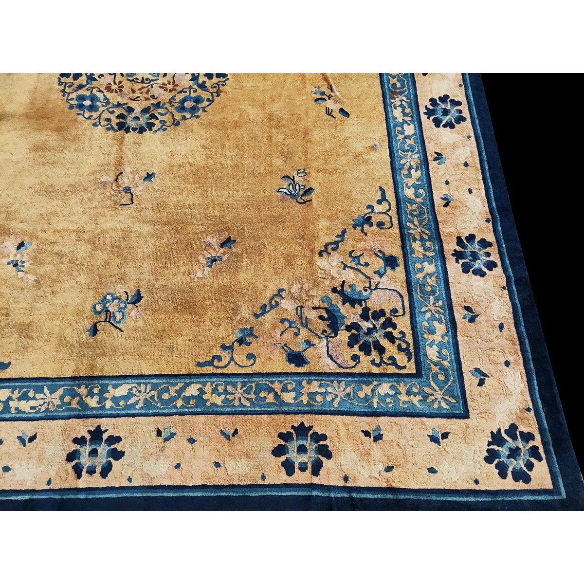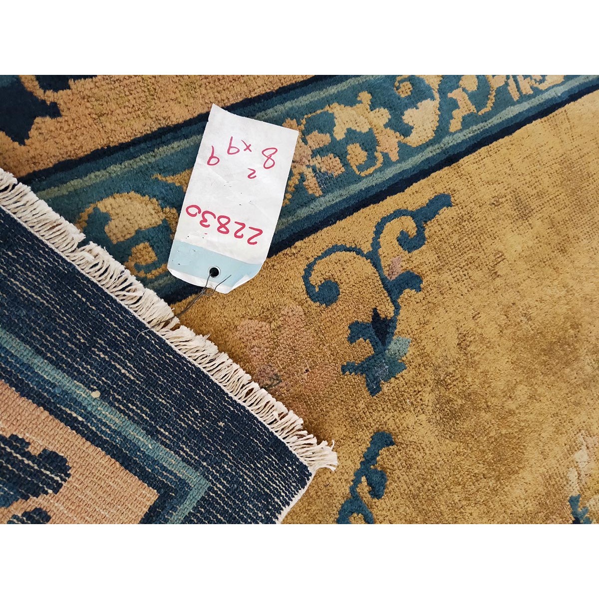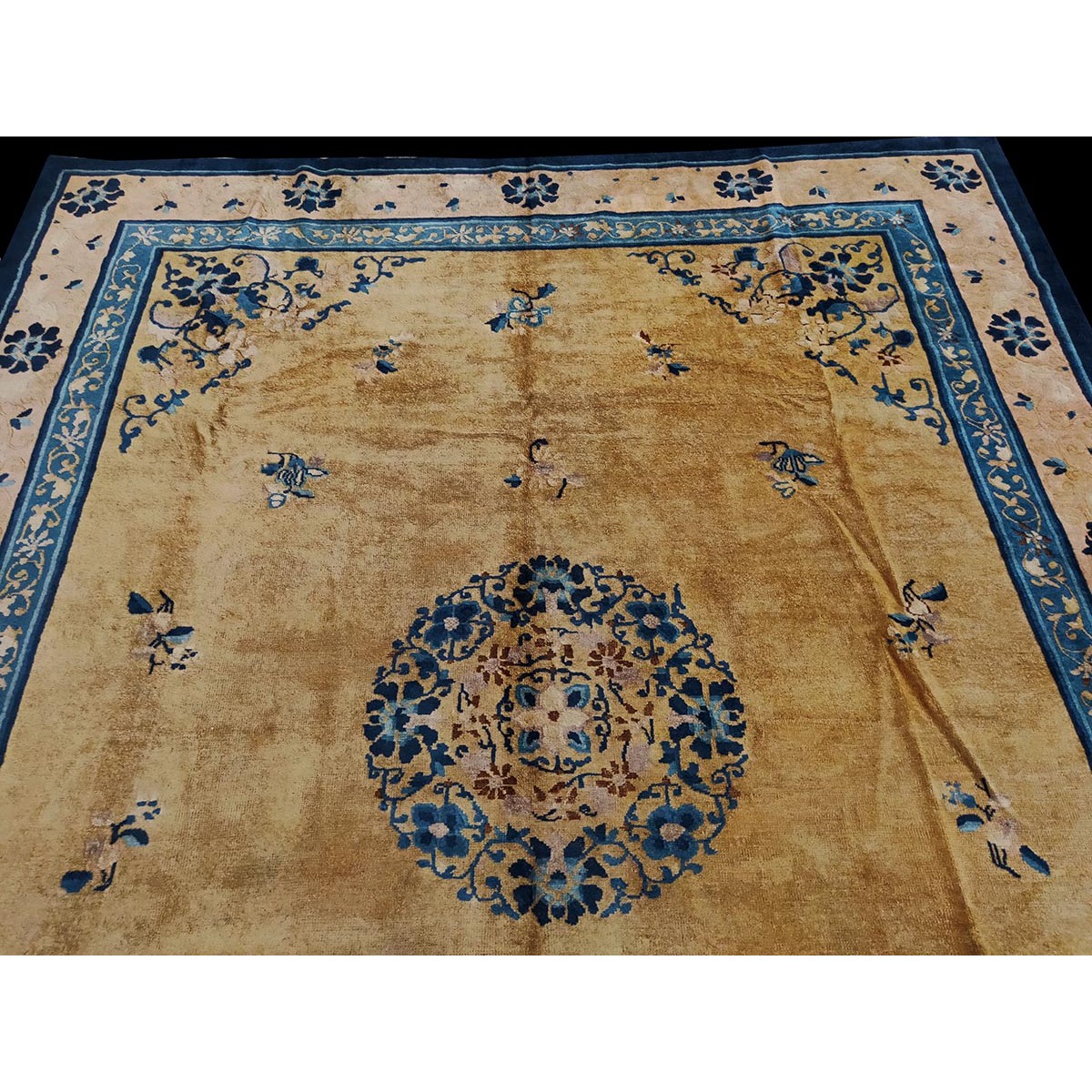 DescriptionChineseCarpets made in China proper. See entries Ningshia, Peking, Art Deco. Chinese - PekingThe commercial Peking carpet is a later 19th century development, begun by importing weaves from Ningshia (see entry) to create and export industry aimed at Western markets. The foundation is cotton and the pile is a good quality carpet wool which takes dyes particularly well. The neat medium weave is in Persian (asymmetric) knots. Designs are strictly Chinese and the whole motif repertoire of Chinese art is employed. Blue and white is the most popular color combination and red is particularly rare. Sizes tend to 9 x 12 and larger, and few small pieces appear. For a short time in the early 1920s Persian designs were woven to capitalize on the death of new Iranian goods. The industry decimated by the Communist Revolution relocated to the Pearl River area. There is a good supply of antique carpets at reasonable prices. | |