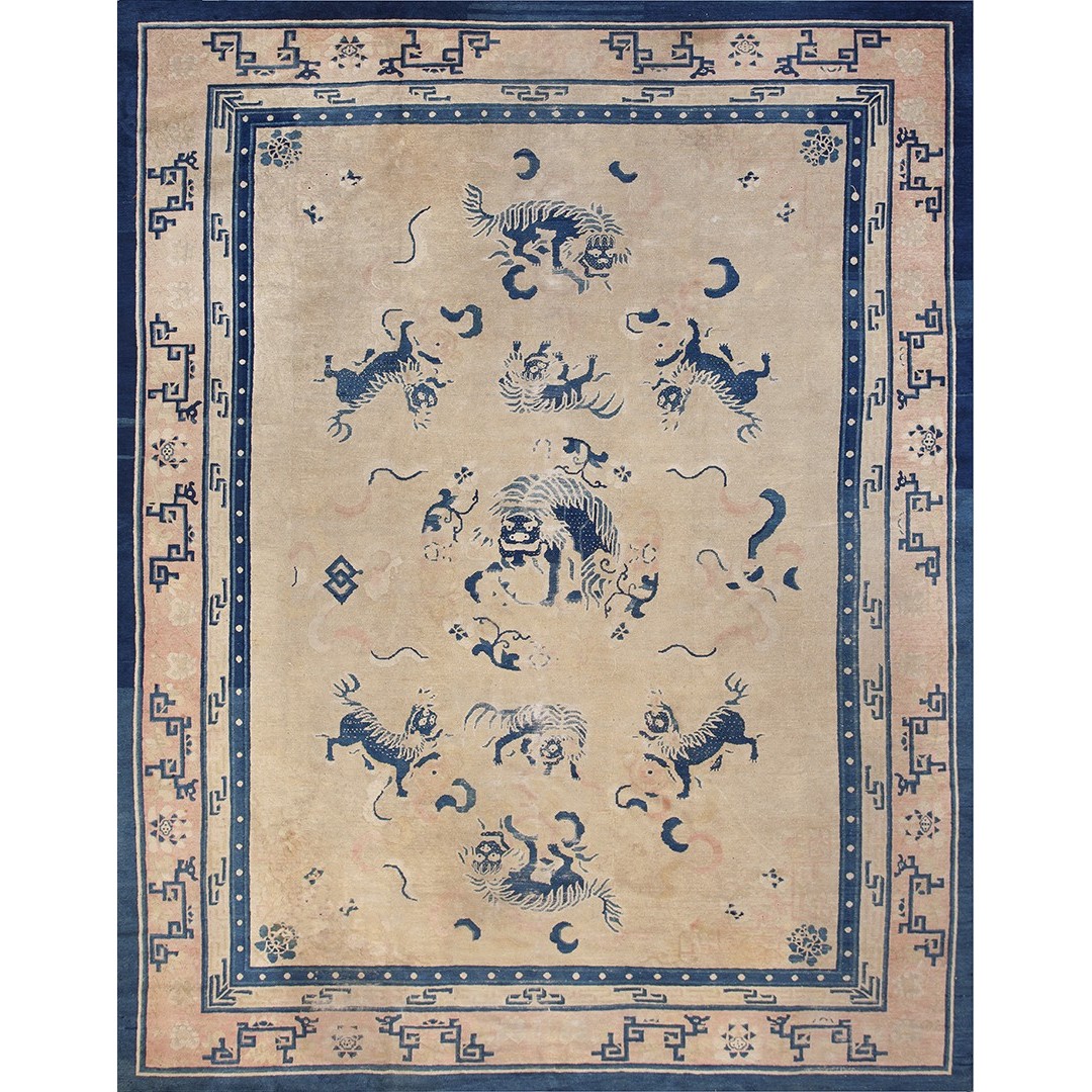 DescriptionChineseCarpets made in China proper. See entries Ningshia, Peking, Art Deco. Chinese - PekingThe commercial Peking carpet is a later 19th century development, begun by importing weaves from Ningshia (see entry) to create and export industry aimed at Western markets. The foundation is cotton and the pile is a good quality carpet wool which takes dyes particularly well. The neat medium weave is in Persian (asymmetric) knots. Designs are strictly Chinese and the whole motif repertoire of Chinese art is employed. Blue and white is the most popular color combination and red is particularly rare. Sizes tend to 9 x 12 and larger, and few small pieces appear. For a short time in the early 1920s Persian designs were woven to capitalize on the death of new Iranian goods. The industry decimated by the Communist Revolution relocated to the Pearl River area. There is a good supply of antique carpets at reasonable prices. | |