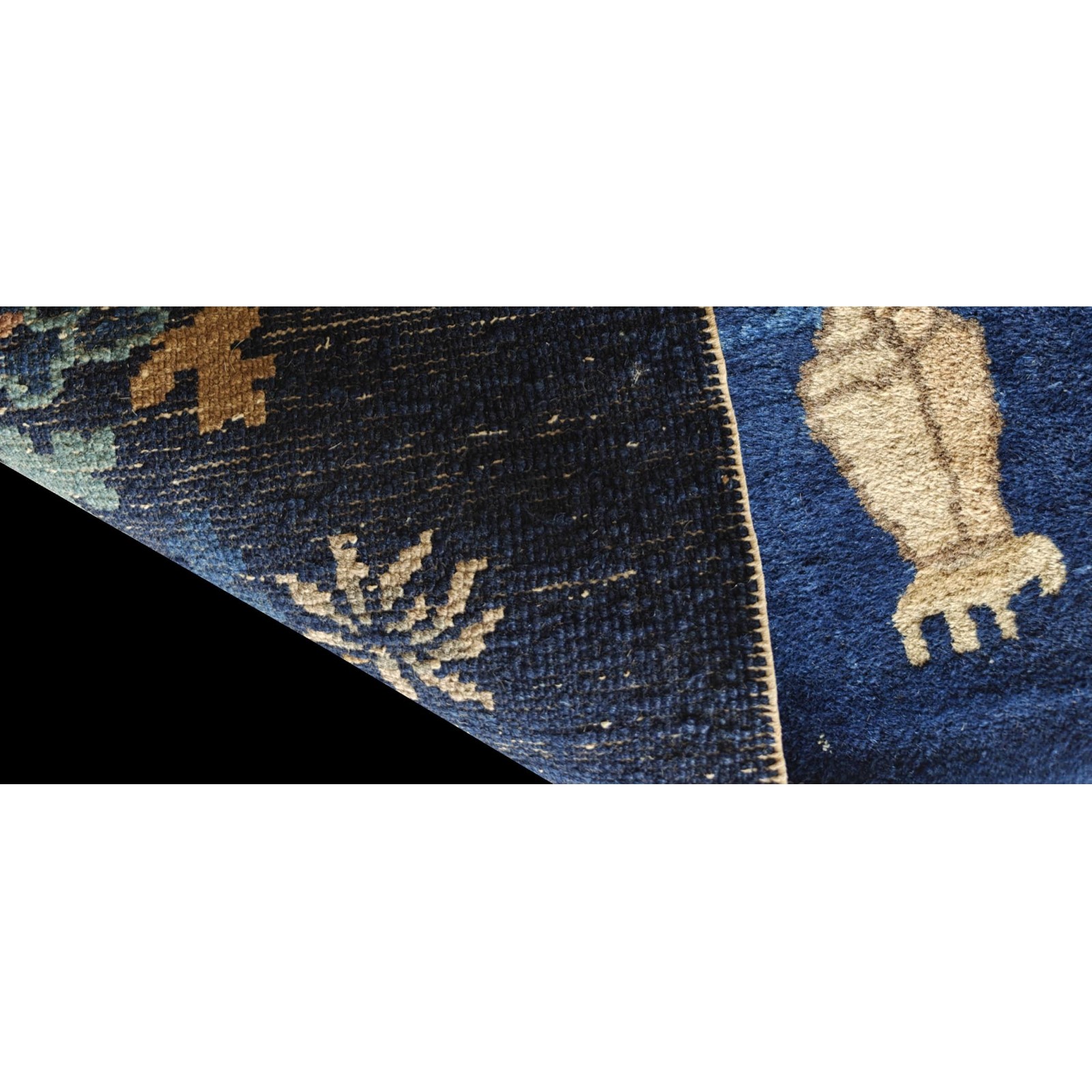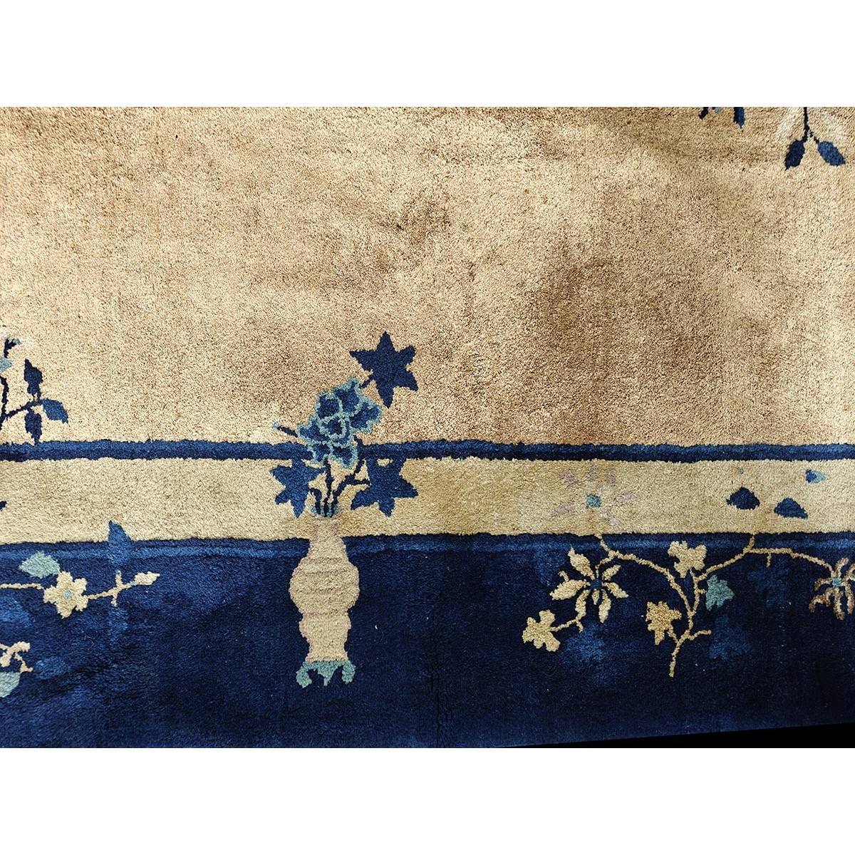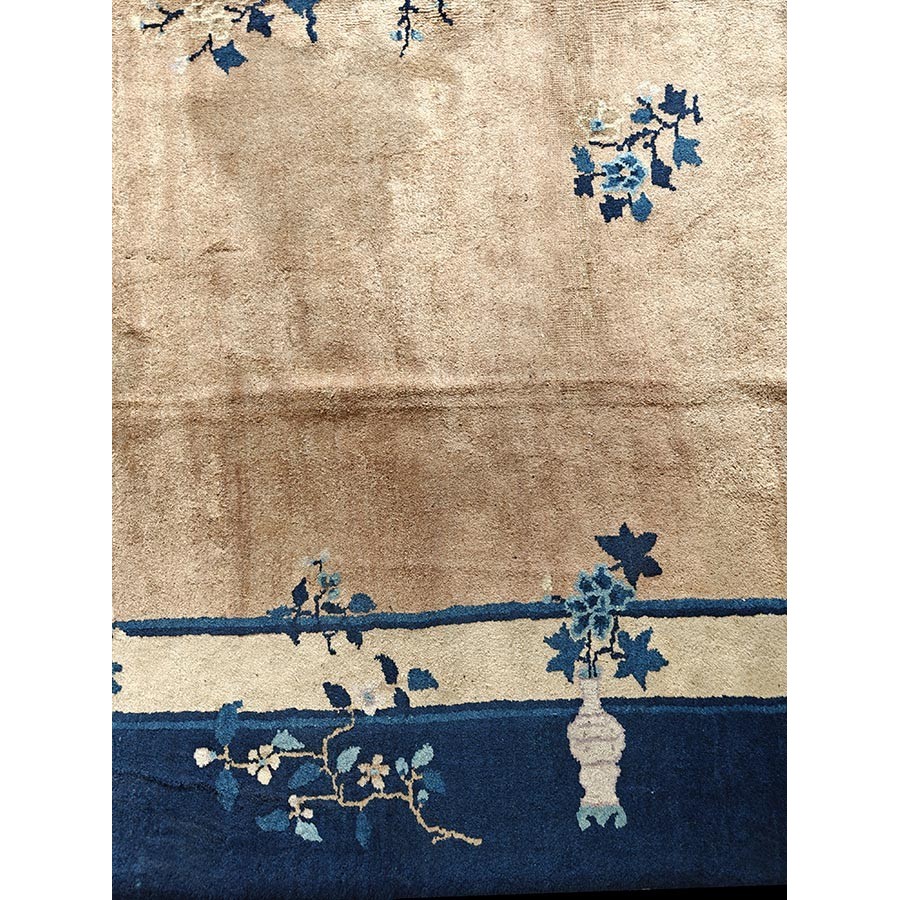 DescriptionChineseCarpets made in China proper. See entries Ningshia, Peking, Art Deco. Chinese - PekingThe commercial Peking carpet is a later 19th century development, begun by importing weaves from Ningshia (see entry) to create and export industry aimed at Western markets. The foundation is cotton and the pile is a good quality carpet wool which takes dyes particularly well. The neat medium weave is in Persian (asymmetric) knots. Designs are strictly Chinese and the whole motif repertoire of Chinese art is employed. Blue and white is the most popular color combination and red is particularly rare. Sizes tend to 9 x 12 and larger, and few small pieces appear. For a short time in the early 1920s Persian designs were woven to capitalize on the death of new Iranian goods. The industry decimated by the Communist Revolution relocated to the Pearl River area. There is a good supply of antique carpets at reasonable prices. | |