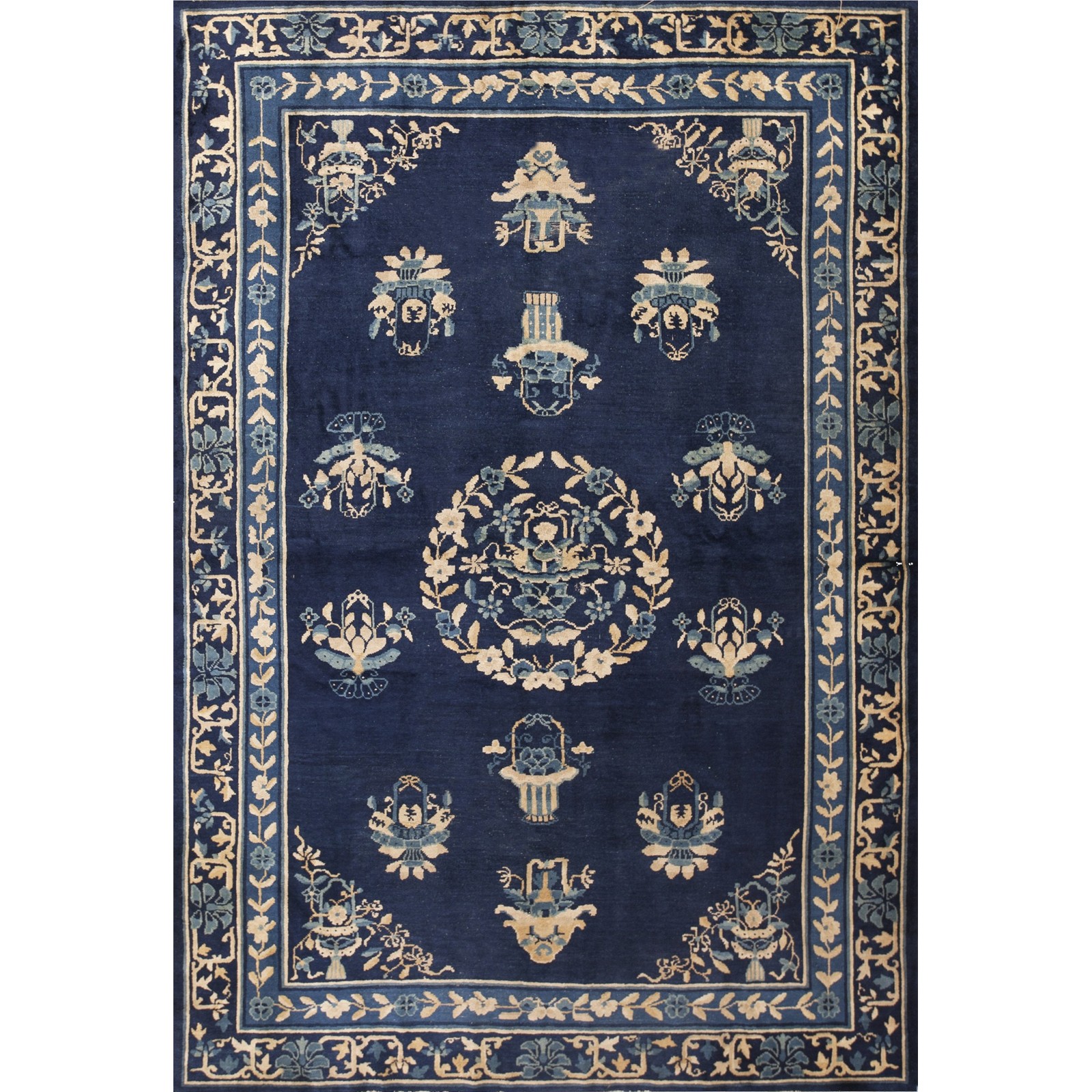 DescriptionChineseCarpets made in China proper. See entries Ningshia, Peking, Art Deco. Chinese - PekingThe commercial Peking carpet is a later 19th century development, begun by importing weaves from Ningshia (see entry) to create and export industry aimed at Western markets. The foundation is cotton and the pile is a good quality carpet wool which takes dyes particularly well. The neat medium weave is in Persian (asymmetric) knots. Designs are strictly Chinese and the whole motif repertoire of Chinese art is employed. Blue and white is the most popular color combination and red is particularly rare. Sizes tend to 9 x 12 and larger, and few small pieces appear. For a short time in the early 1920s Persian designs were woven to capitalize on the death of new Iranian goods. The industry decimated by the Communist Revolution relocated to the Pearl River area. There is a good supply of antique carpets at reasonable prices. | |