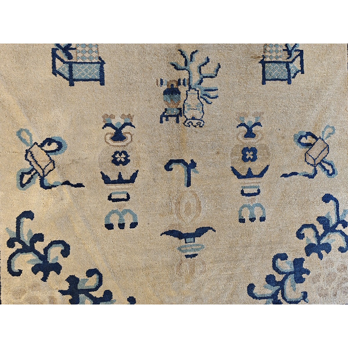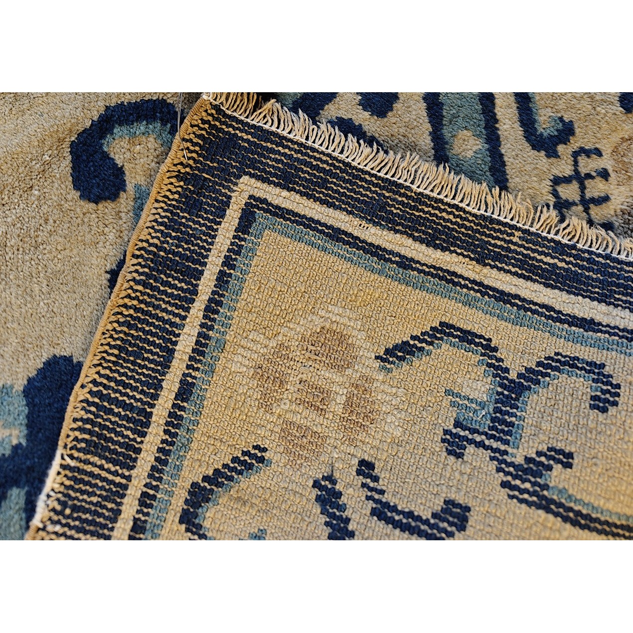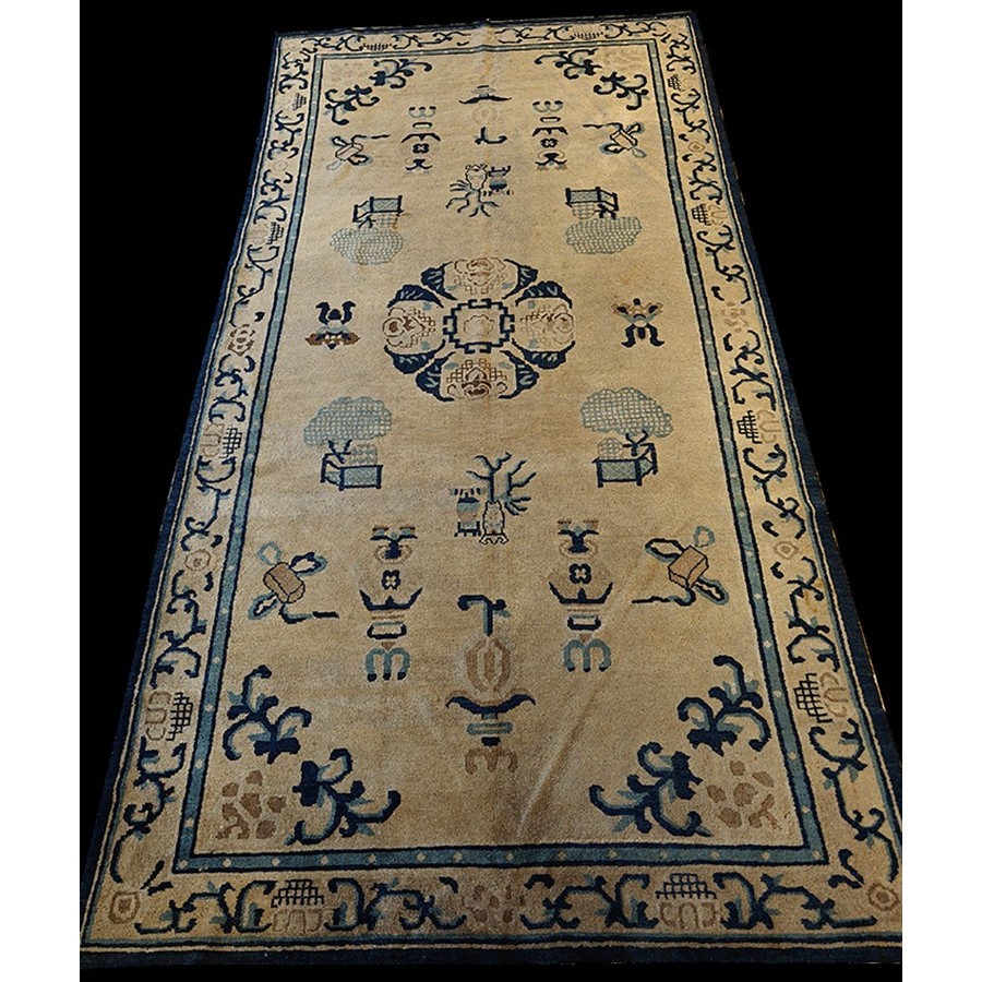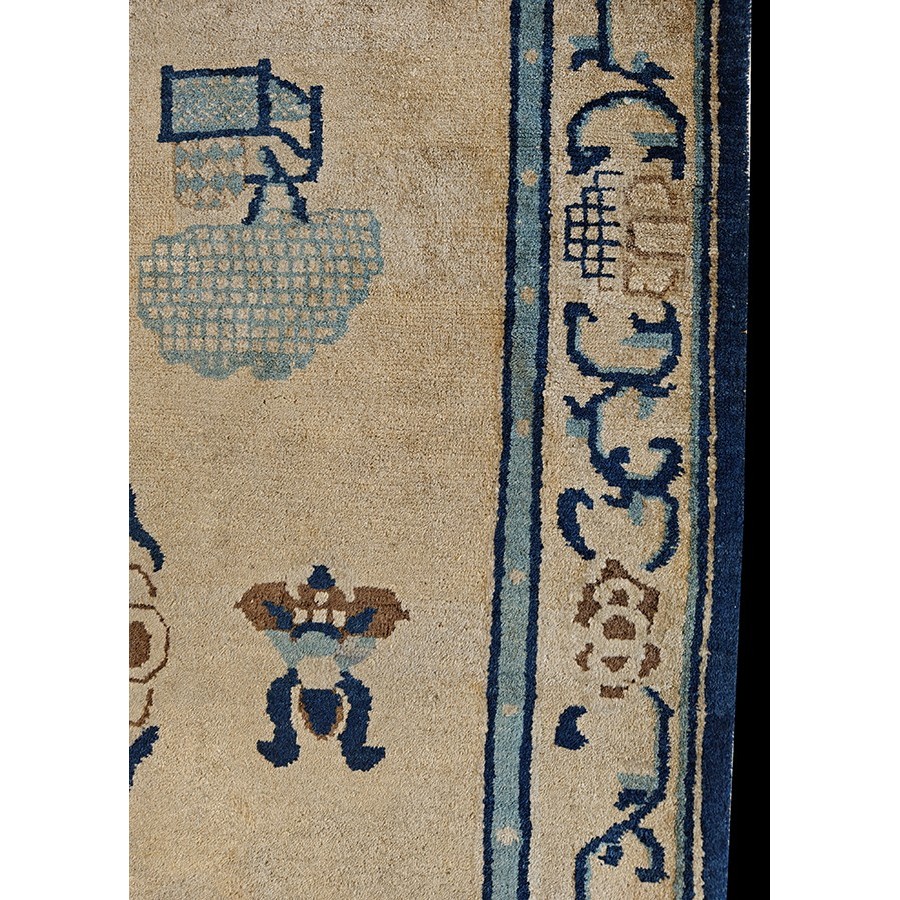 DescriptionChineseCarpets made in China proper. See entries Ningshia, Peking, Art Deco. Chinese - PekingThe commercial Peking carpet is a later 19th century development, begun by importing weaves from Ningshia (see entry) to create and export industry aimed at Western markets. The foundation is cotton and the pile is a good quality carpet wool which takes dyes particularly well. The neat medium weave is in Persian (asymmetric) knots. Designs are strictly Chinese and the whole motif repertoire of Chinese art is employed. Blue and white is the most popular color combination and red is particularly rare. Sizes tend to 9 x 12 and larger, and few small pieces appear. For a short time in the early 1920s Persian designs were woven to capitalize on the death of new Iranian goods. The industry decimated by the Communist Revolution relocated to the Pearl River area. There is a good supply of antique carpets at reasonable prices. | |