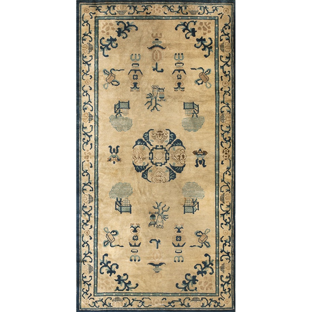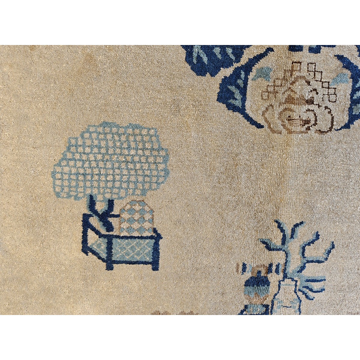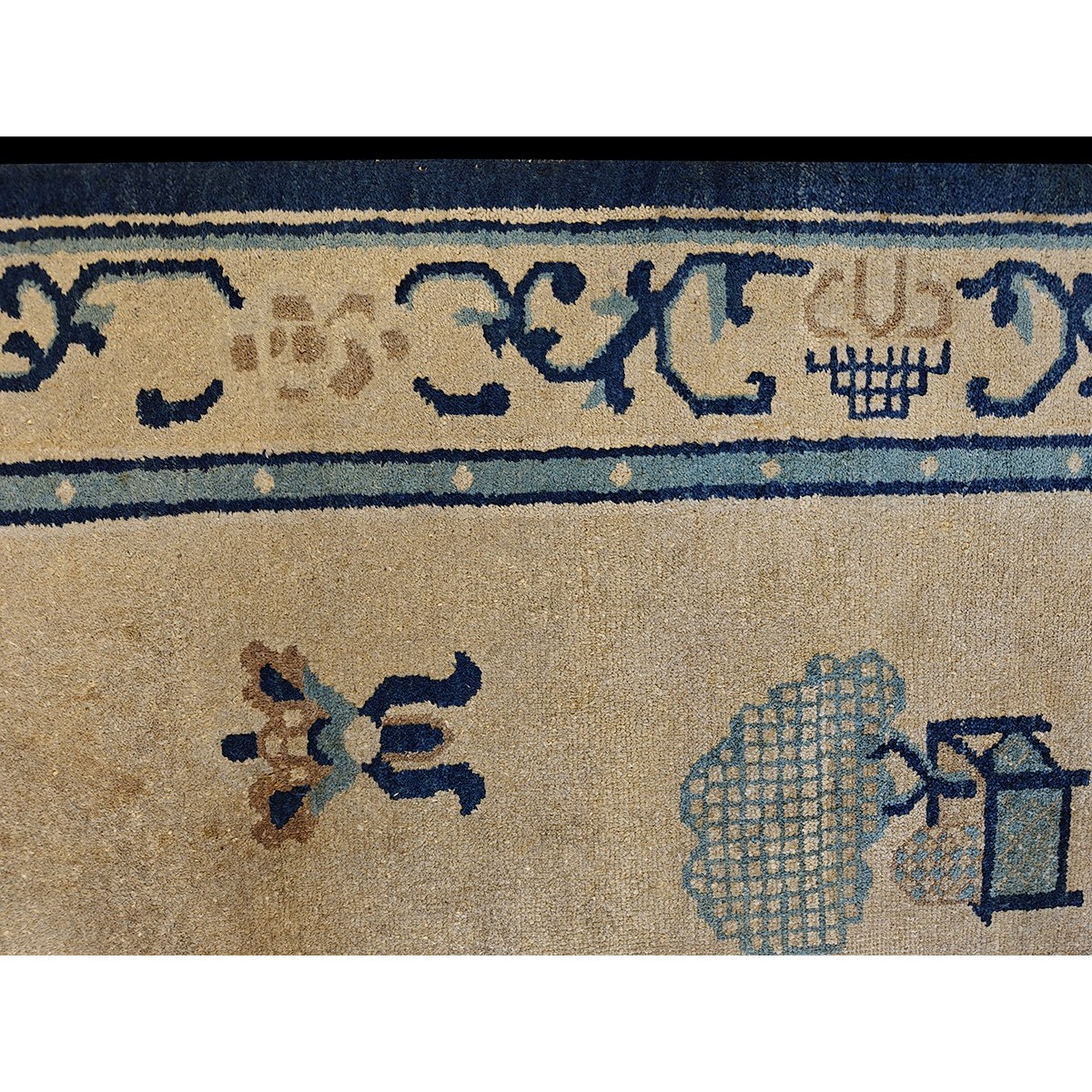 DescriptionChineseCarpets made in China proper. See entries Ningshia, Peking, Art Deco. Chinese - PekingThe commercial Peking carpet is a later 19th century development, begun by importing weaves from Ningshia (see entry) to create and export industry aimed at Western markets. The foundation is cotton and the pile is a good quality carpet wool which takes dyes particularly well. The neat medium weave is in Persian (asymmetric) knots. Designs are strictly Chinese and the whole motif repertoire of Chinese art is employed. Blue and white is the most popular color combination and red is particularly rare. Sizes tend to 9 x 12 and larger, and few small pieces appear. For a short time in the early 1920s Persian designs were woven to capitalize on the death of new Iranian goods. The industry decimated by the Communist Revolution relocated to the Pearl River area. There is a good supply of antique carpets at reasonable prices. | |