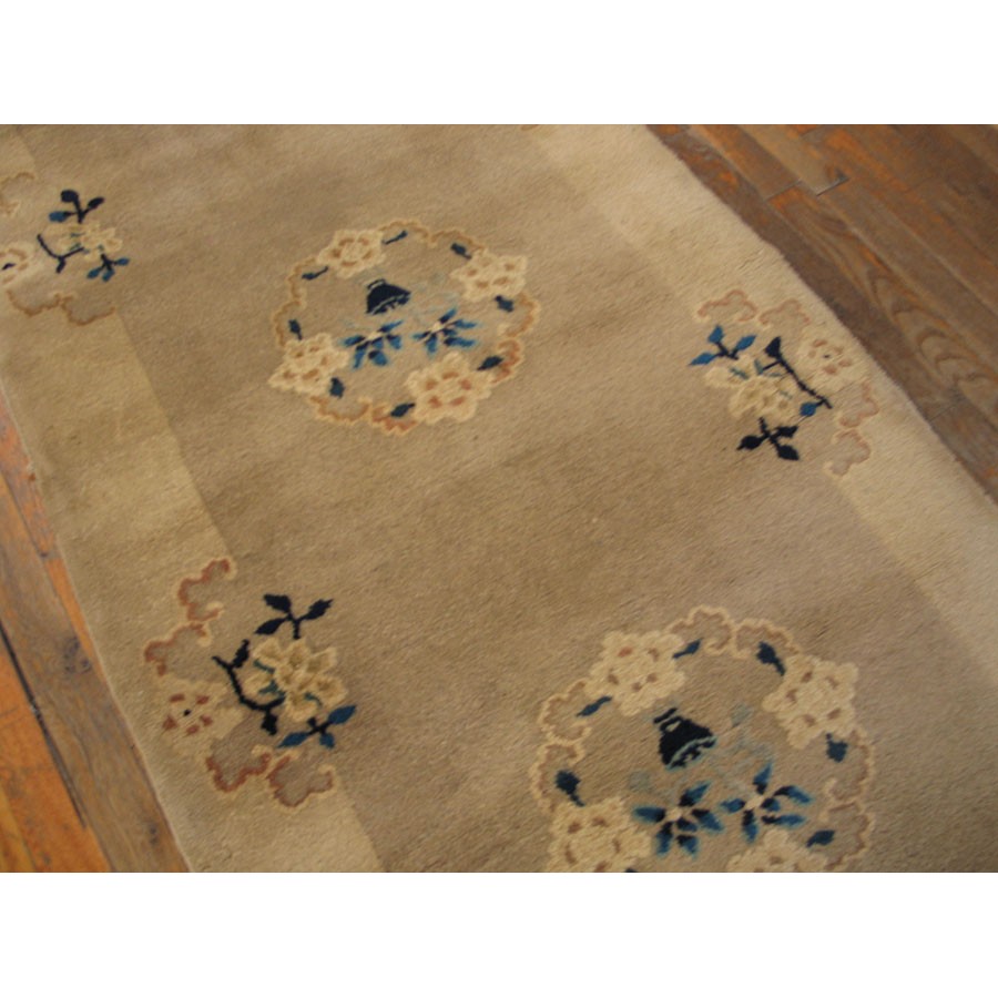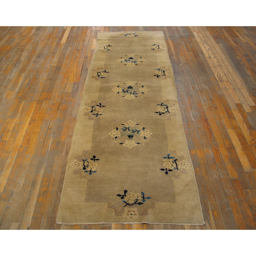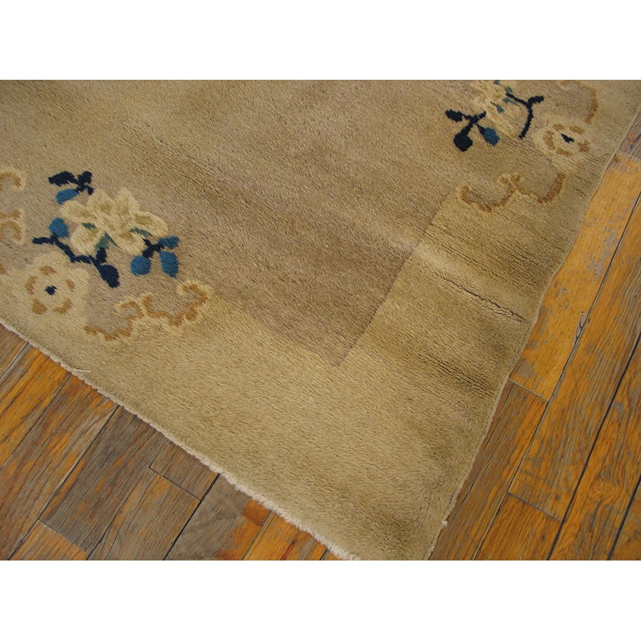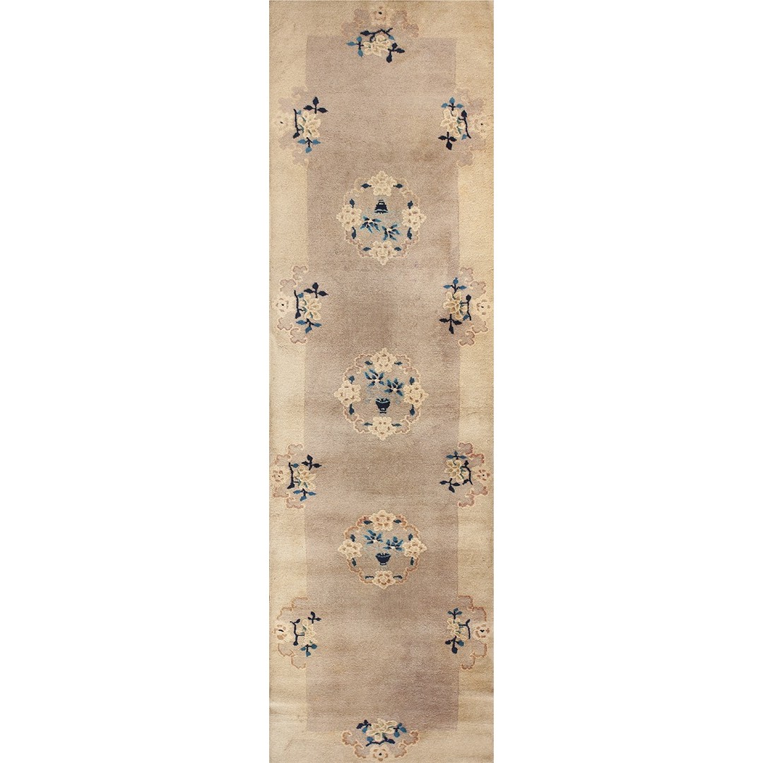 DescriptionChineseCarpets made in China proper. See entries Ningshia, Peking, Art Deco. Chinese - PekingThe commercial Peking carpet is a later 19th century development, begun by importing weaves from Ningshia (see entry) to create and export industry aimed at Western markets. The foundation is cotton and the pile is a good quality carpet wool which takes dyes particularly well. The neat medium weave is in Persian (asymmetric) knots. Designs are strictly Chinese and the whole motif repertoire of Chinese art is employed. Blue and white is the most popular color combination and red is particularly rare. Sizes tend to 9 x 12 and larger, and few small pieces appear. For a short time in the early 1920s Persian designs were woven to capitalize on the death of new Iranian goods. The industry decimated by the Communist Revolution relocated to the Pearl River area. There is a good supply of antique carpets at reasonable prices. | |