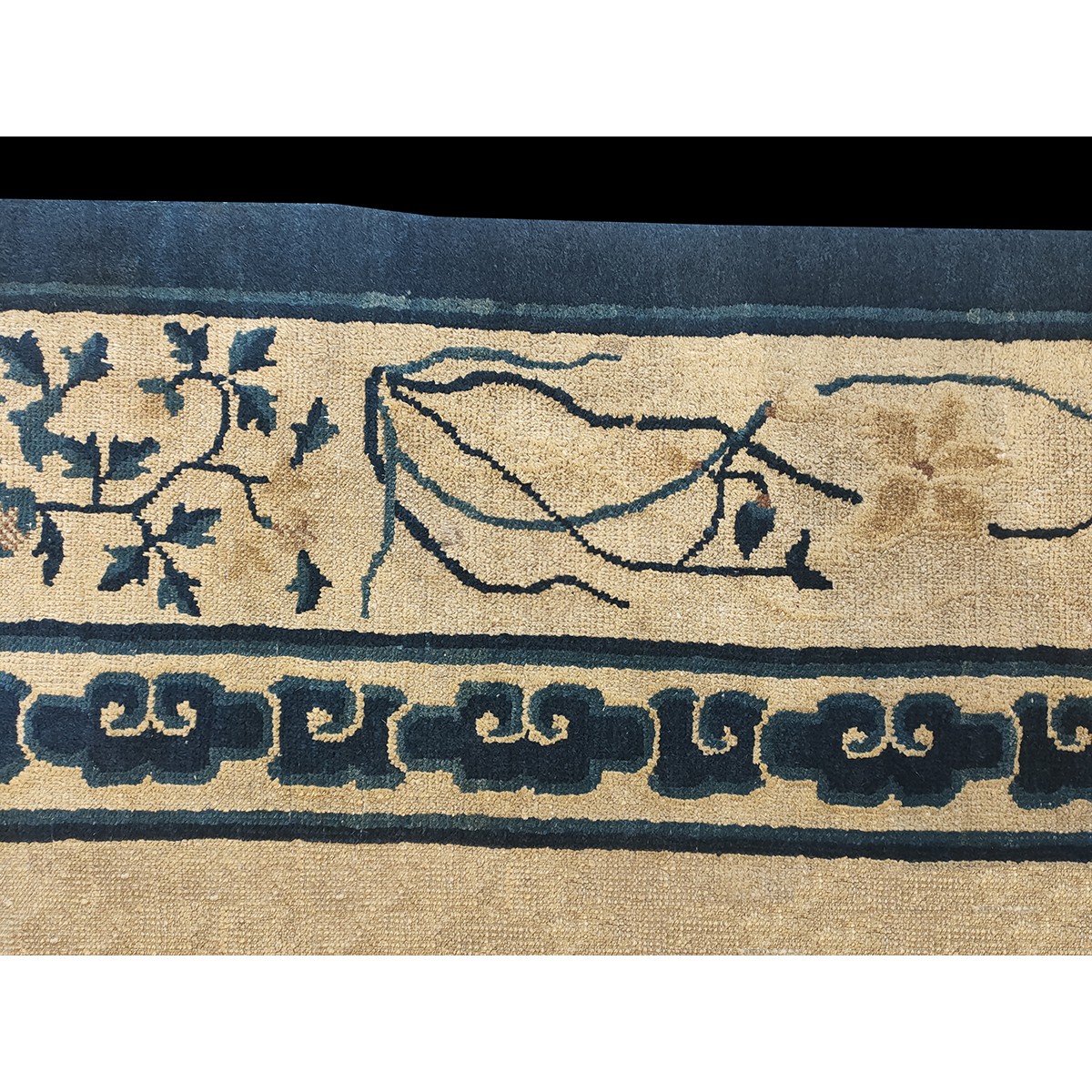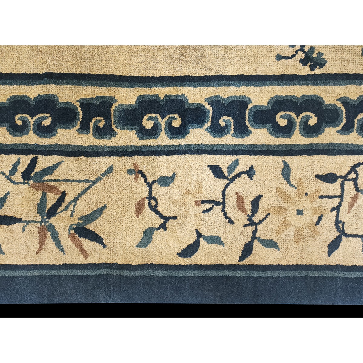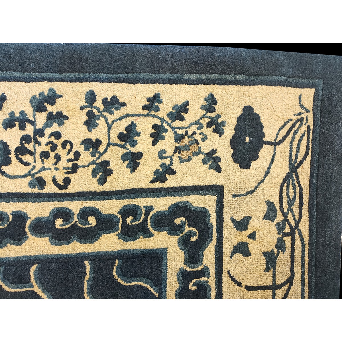 DescriptionChineseCarpets made in China proper. See entries Ningshia, Peking, Art Deco. Chinese - PekingThe commercial Peking carpet is a later 19th century development, begun by importing weaves from Ningshia (see entry) to create and export industry aimed at Western markets. The foundation is cotton and the pile is a good quality carpet wool which takes dyes particularly well. The neat medium weave is in Persian (asymmetric) knots. Designs are strictly Chinese and the whole motif repertoire of Chinese art is employed. Blue and white is the most popular color combination and red is particularly rare. Sizes tend to 9 x 12 and larger, and few small pieces appear. For a short time in the early 1920s Persian designs were woven to capitalize on the death of new Iranian goods. The industry decimated by the Communist Revolution relocated to the Pearl River area. There is a good supply of antique carpets at reasonable prices. | |