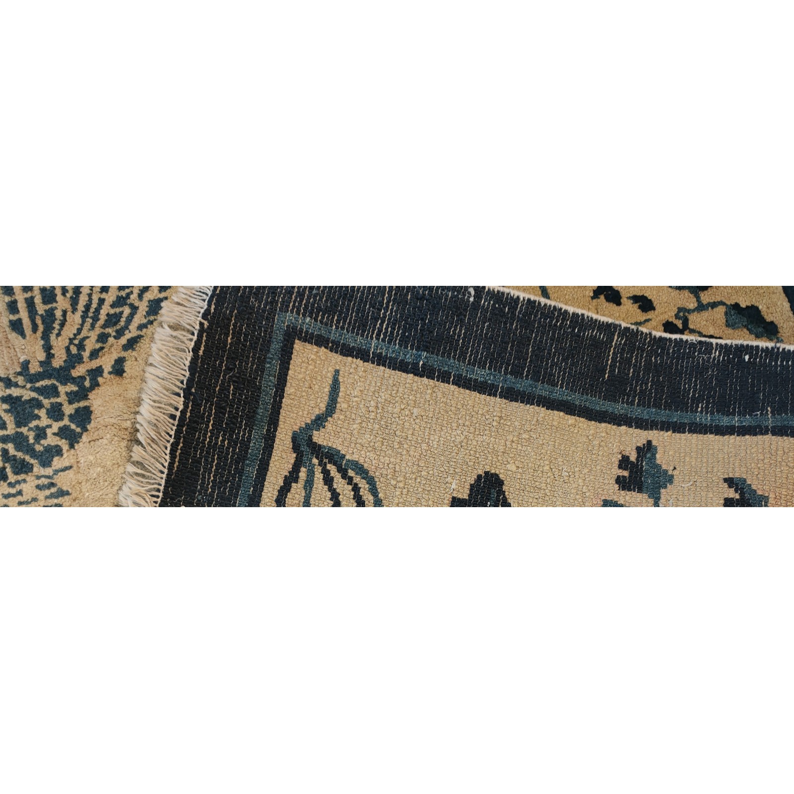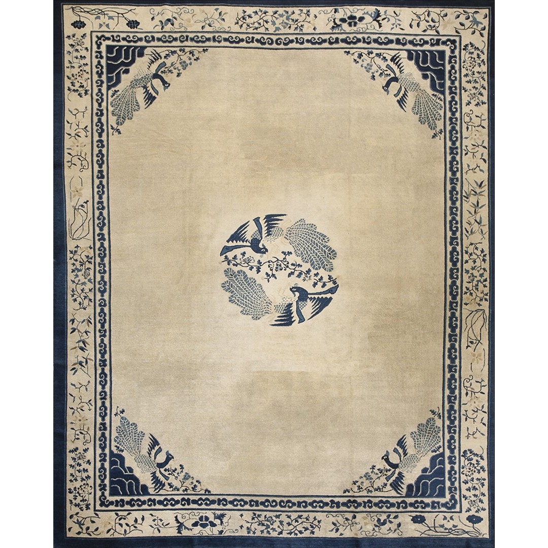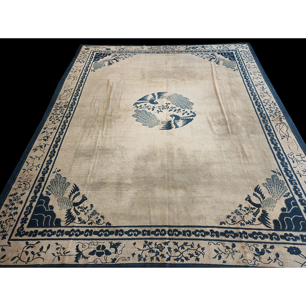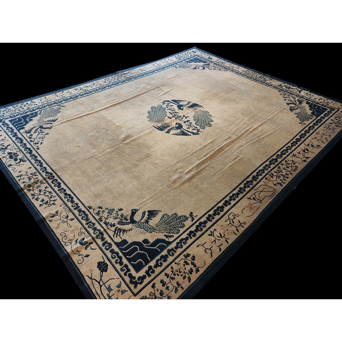 DescriptionChineseCarpets made in China proper. See entries Ningshia, Peking, Art Deco. Chinese - PekingThe commercial Peking carpet is a later 19th century development, begun by importing weaves from Ningshia (see entry) to create and export industry aimed at Western markets. The foundation is cotton and the pile is a good quality carpet wool which takes dyes particularly well. The neat medium weave is in Persian (asymmetric) knots. Designs are strictly Chinese and the whole motif repertoire of Chinese art is employed. Blue and white is the most popular color combination and red is particularly rare. Sizes tend to 9 x 12 and larger, and few small pieces appear. For a short time in the early 1920s Persian designs were woven to capitalize on the death of new Iranian goods. The industry decimated by the Communist Revolution relocated to the Pearl River area. There is a good supply of antique carpets at reasonable prices. | |